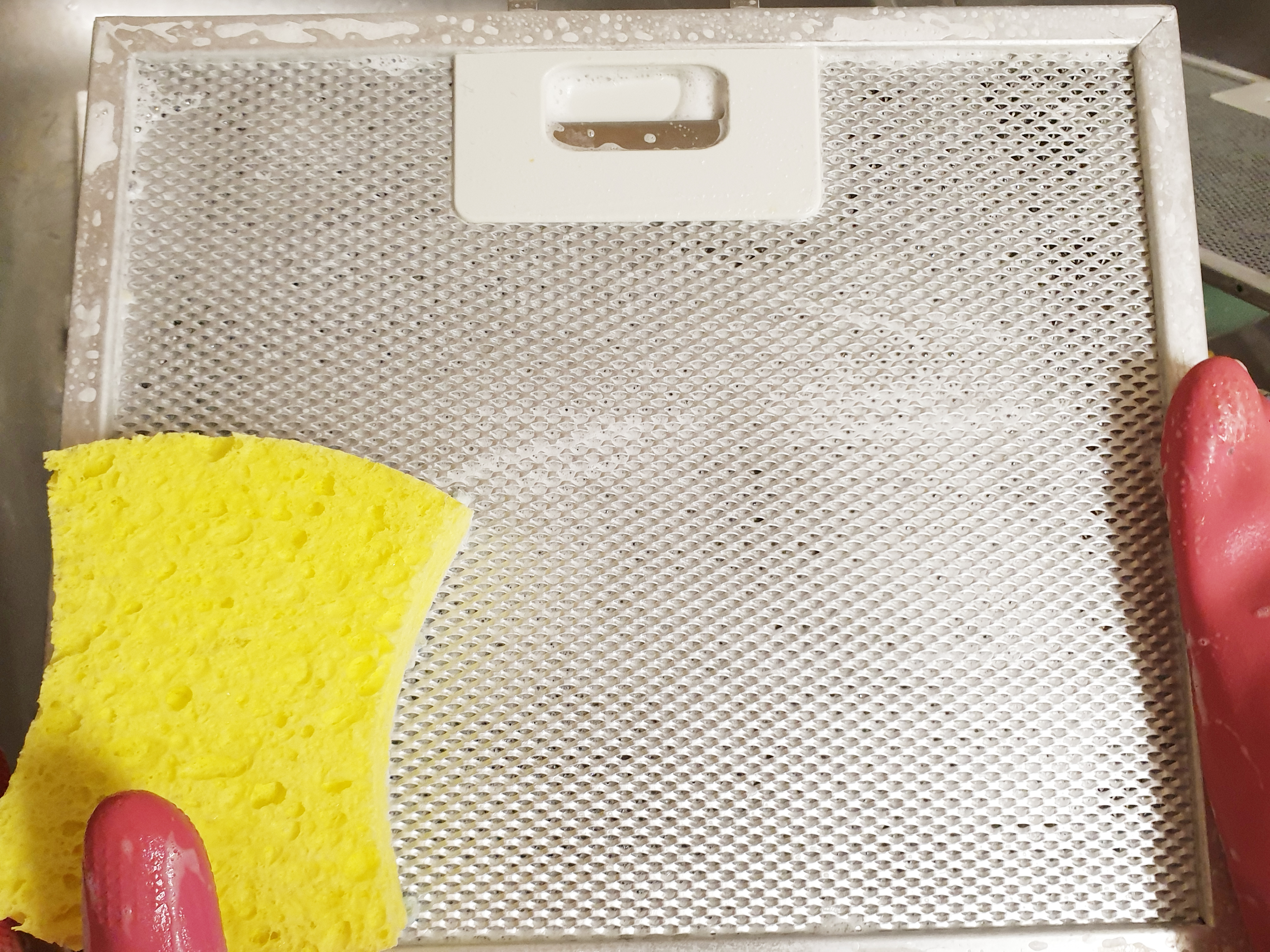 후드 필터를 들어 보면 이렇게 기름때가 제거되어있는 모습을 볼 수 있습니다. 힘 하나도 안 들고 기름때 제거!