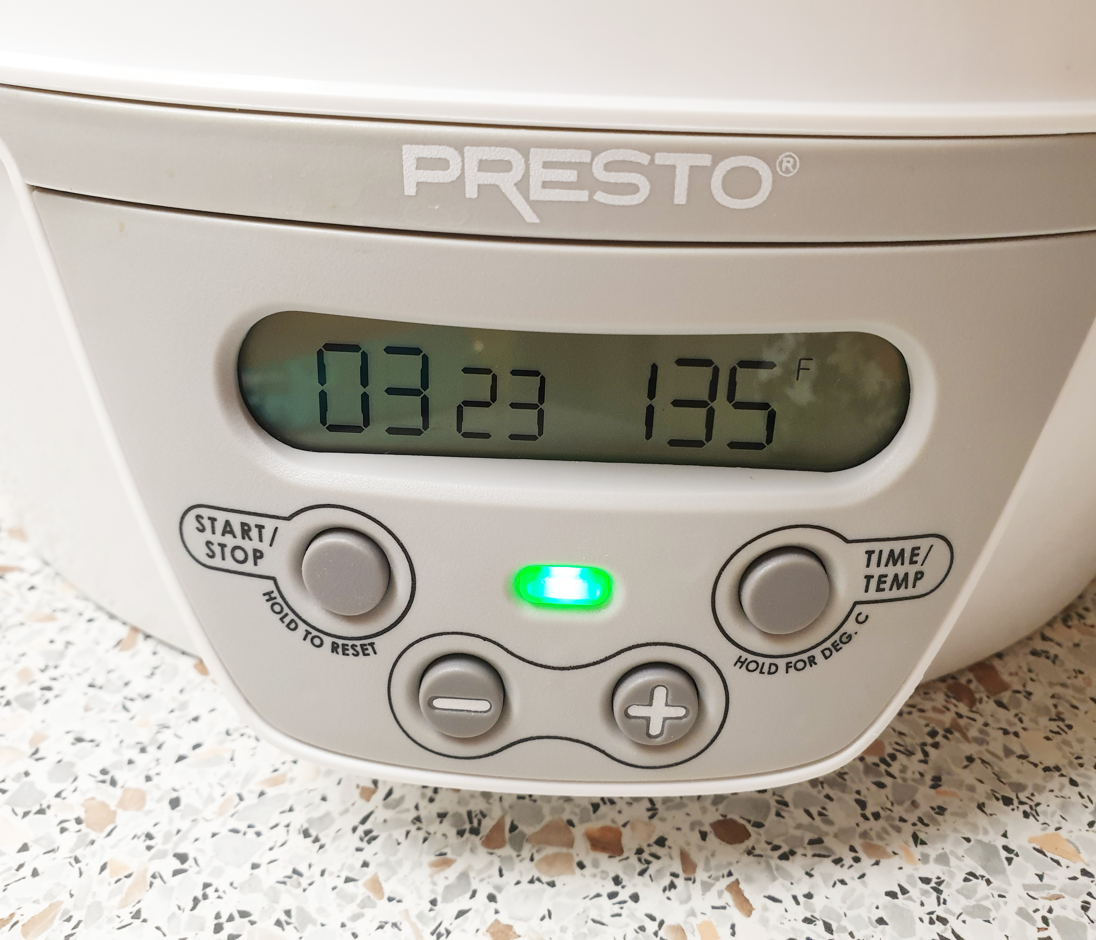 4. 식품건조기 온도는 135 ℉ ( 55~57 ℃ )로 맞춰주고 9~12시간 동안 말려 줍니다. (전 겉은 쫀득하고 안에는 곶감처럼 단감이 씹히는 맛이 좋아서 9시간 정도 말려줘요! )