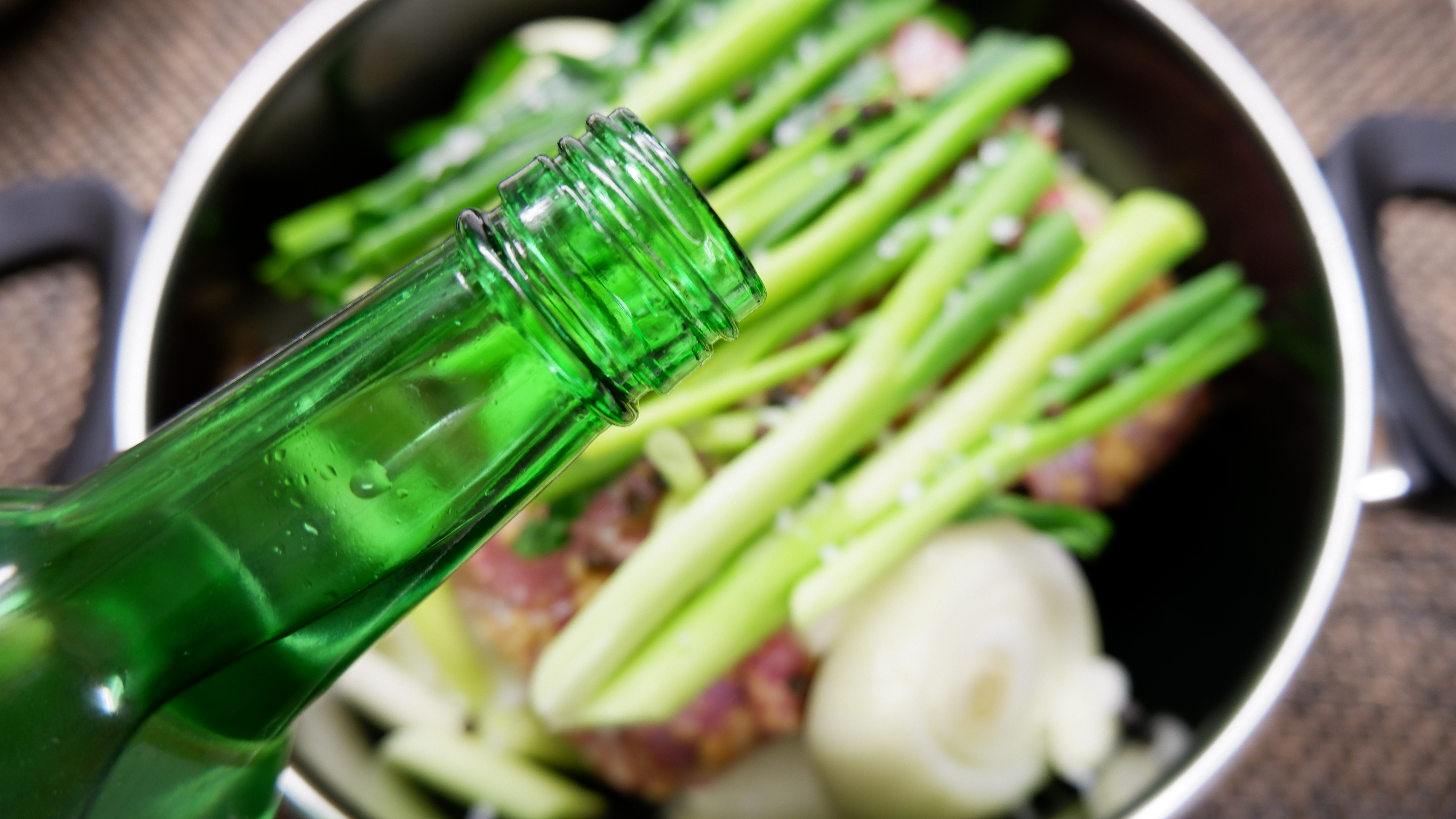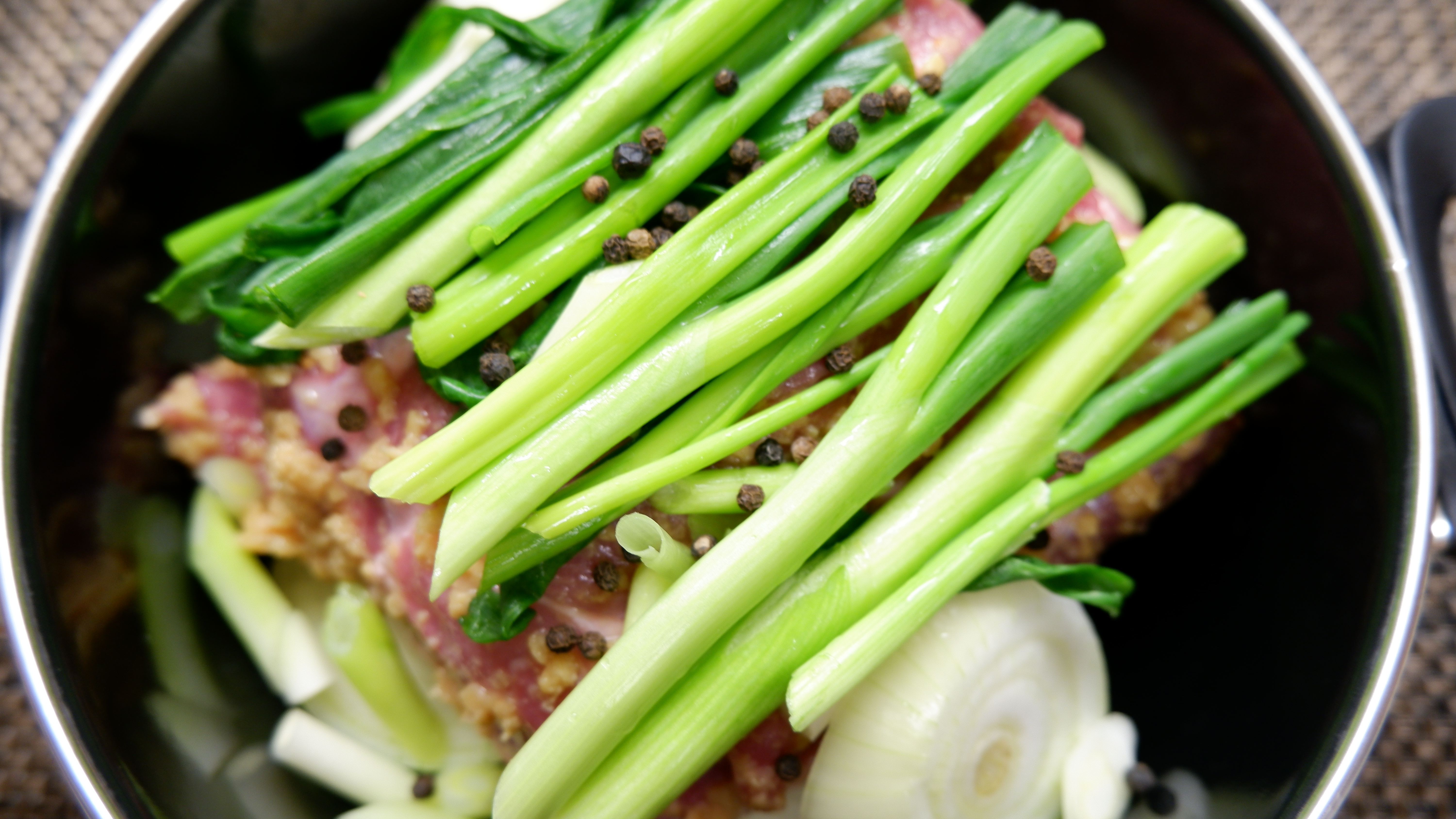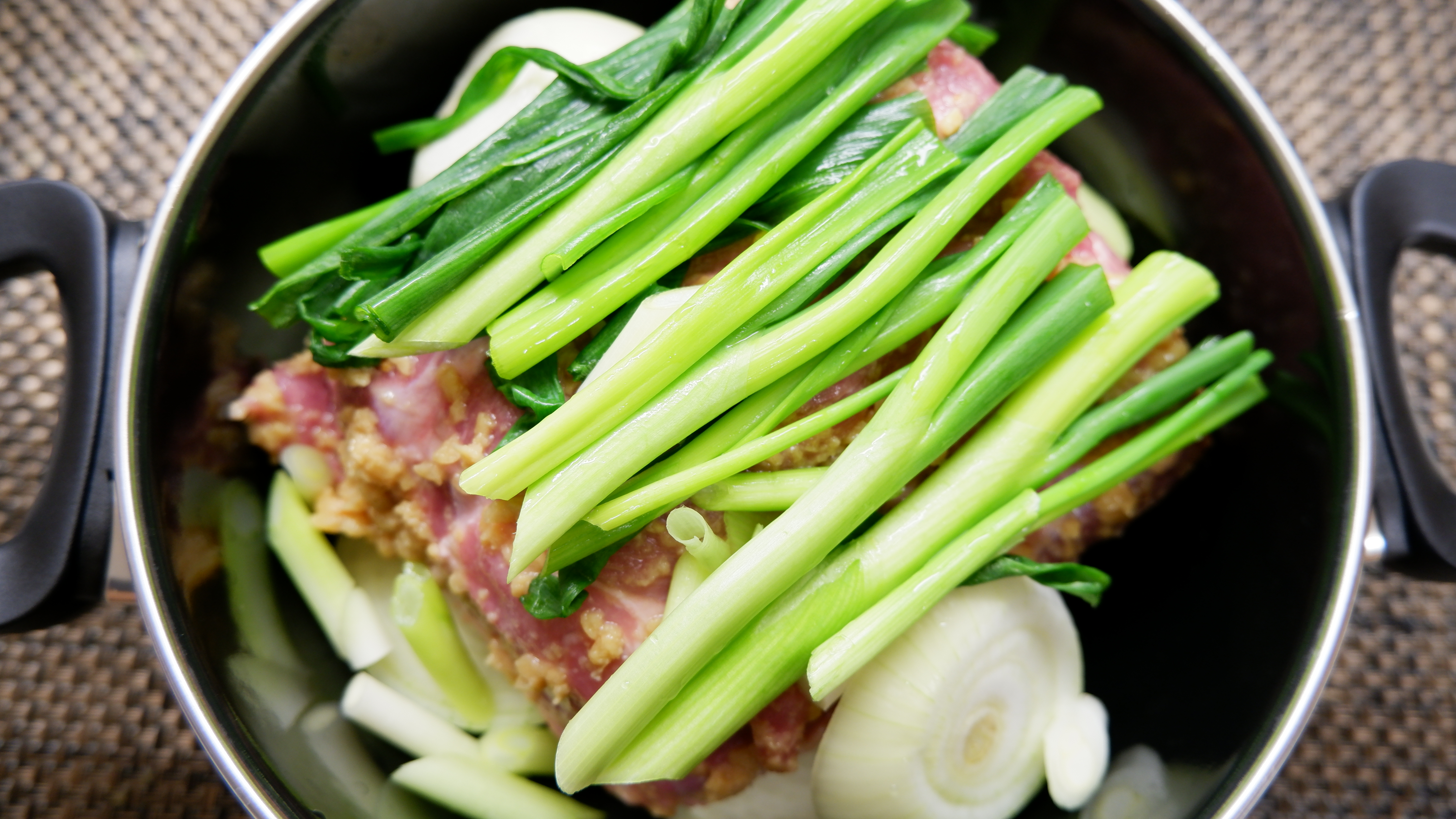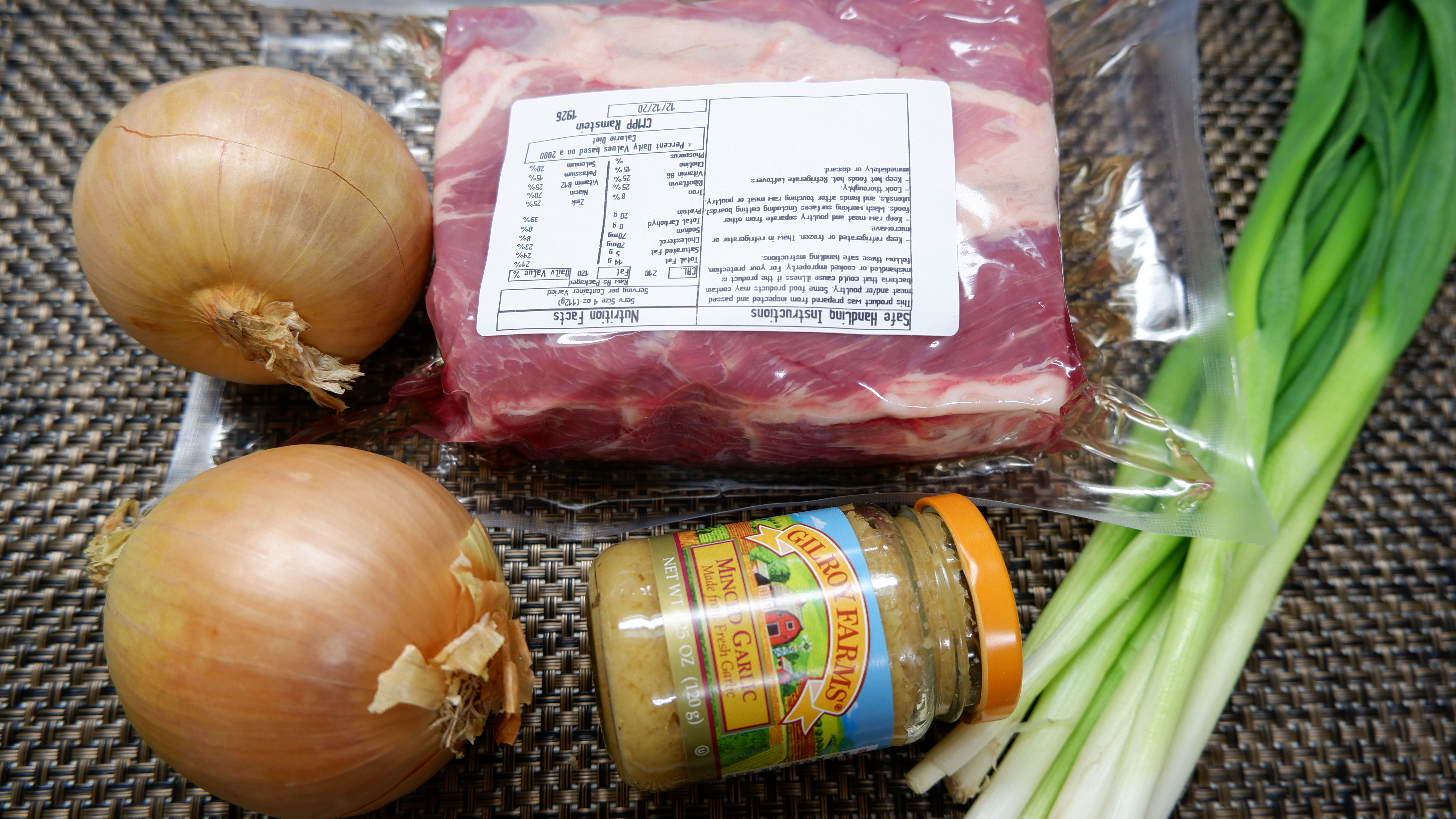 필요한 재료 (2~3인분) : 돼지고기 800g ( 삼겹살 , 오겹살 , 목살 , 앞다리살 , 어깨살 , 뒷다리살 중 선택 ) , 대파 한 단 , 양파 2개 , 청주 또는 소주