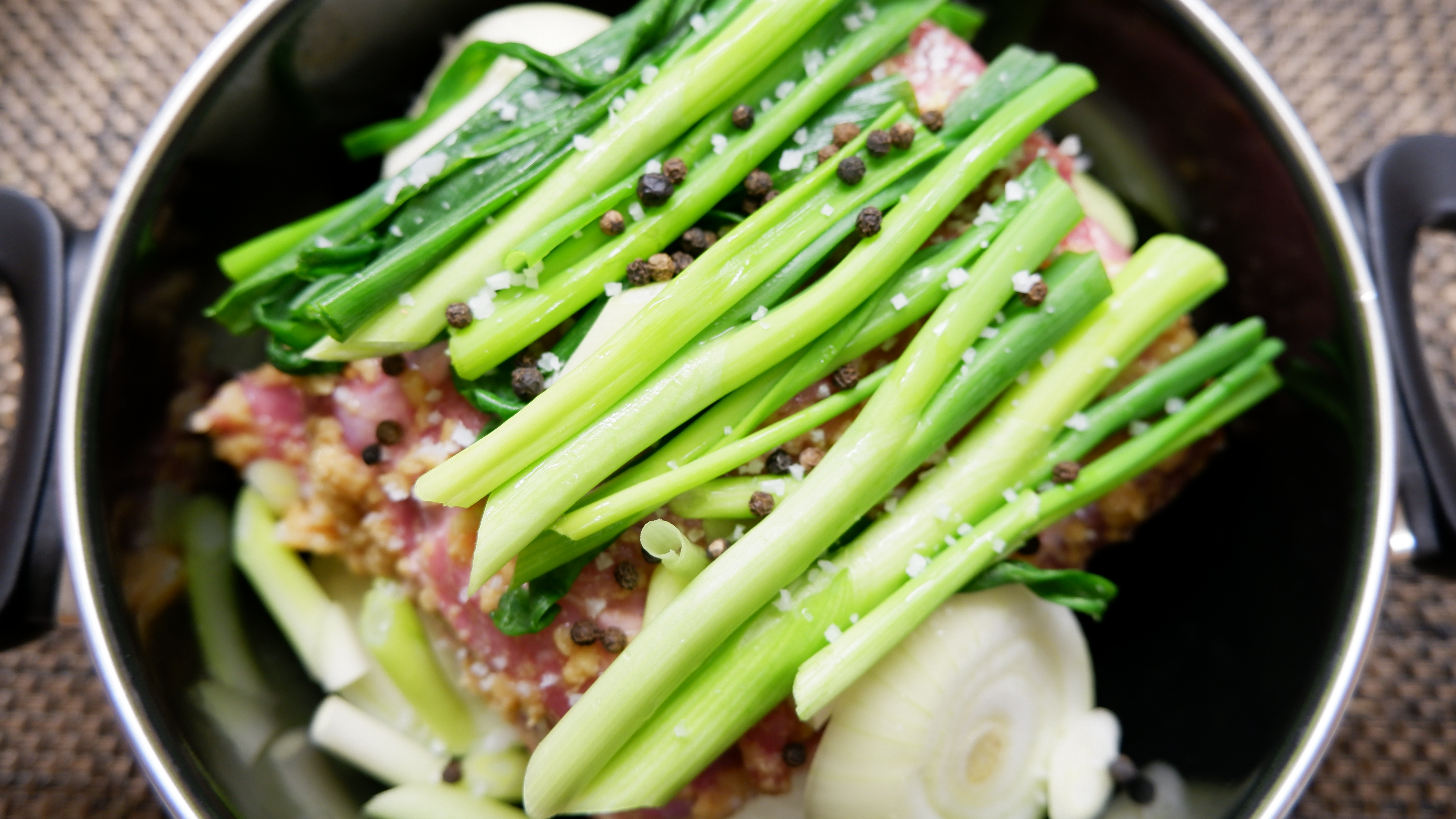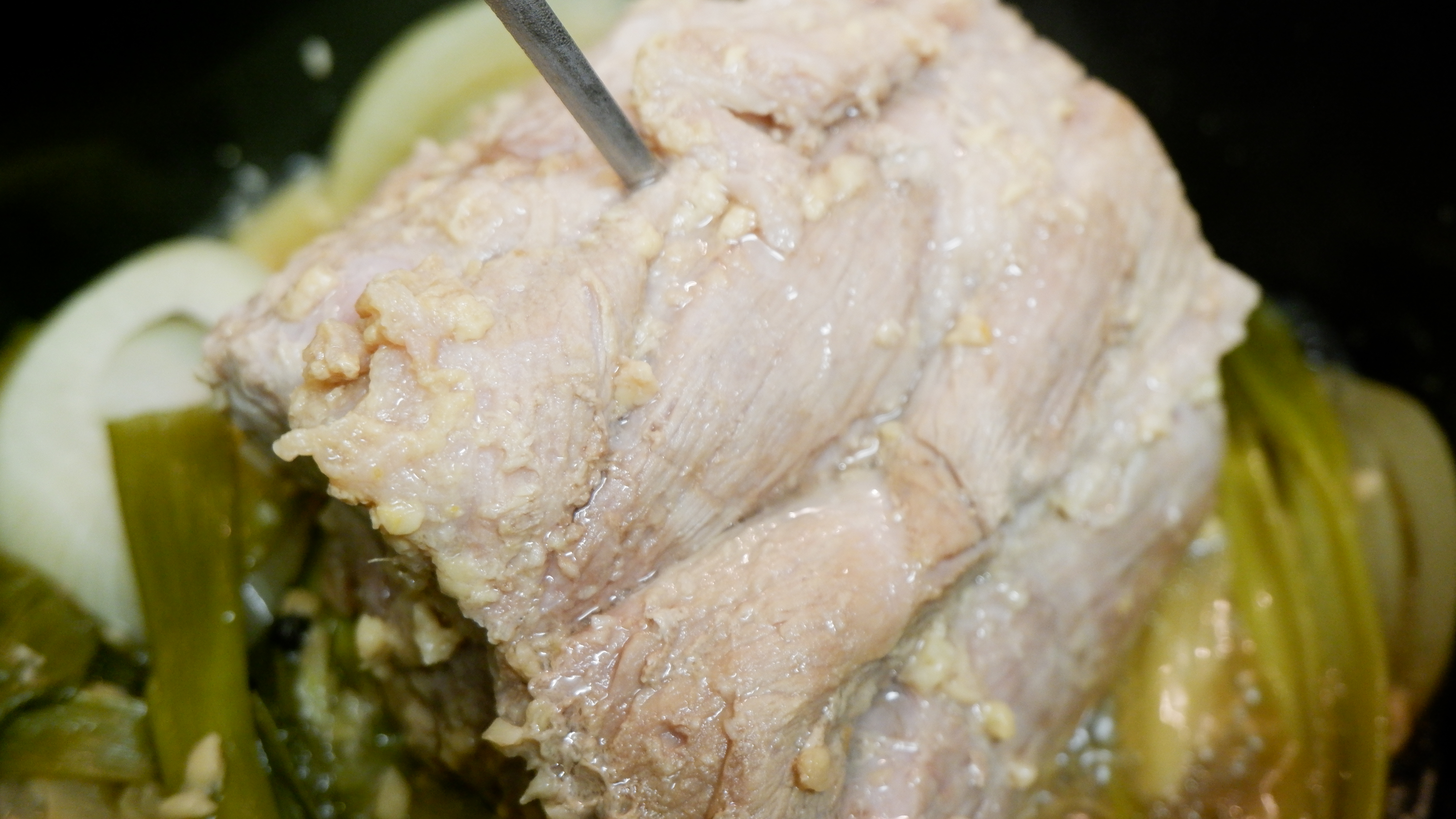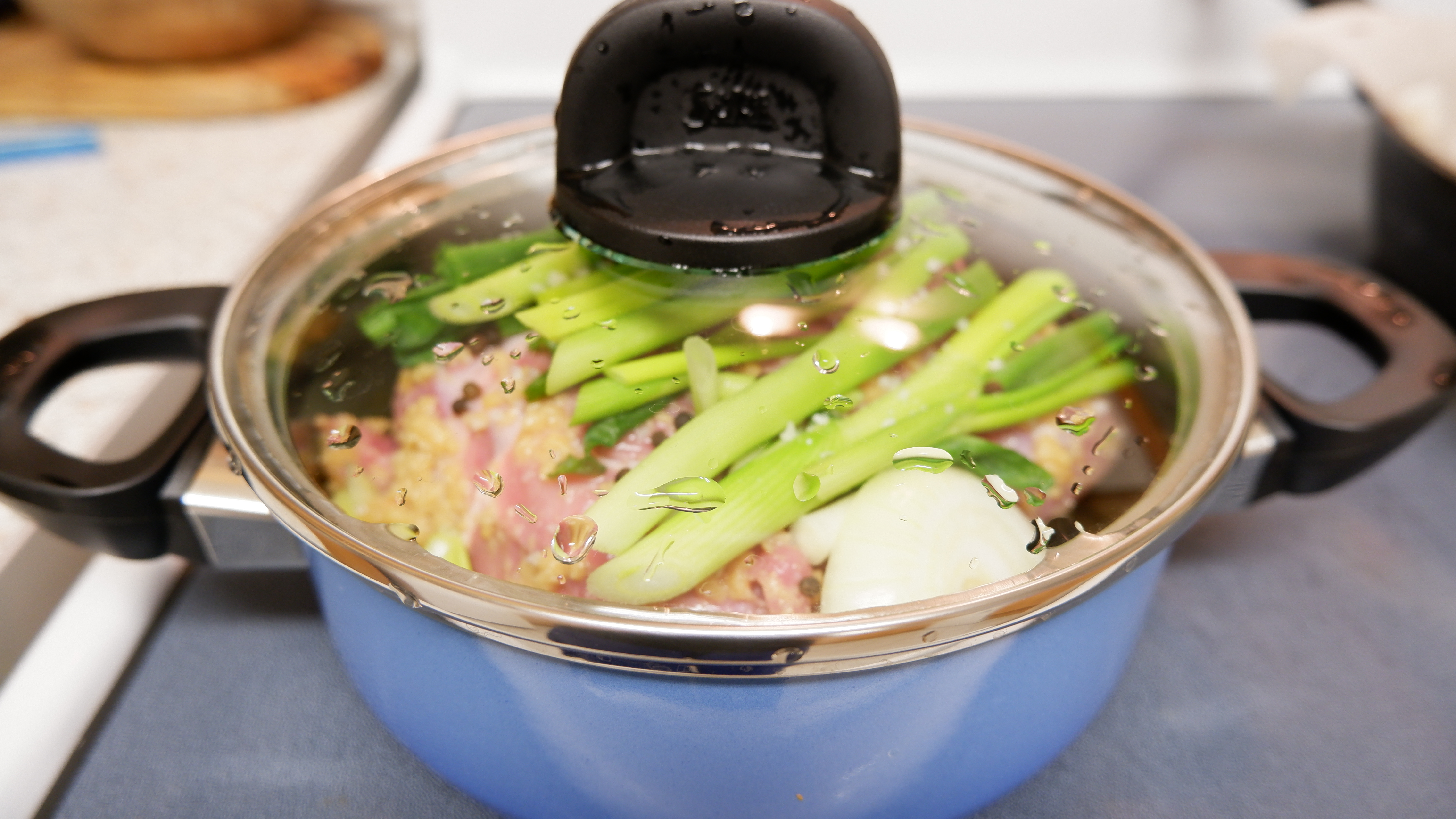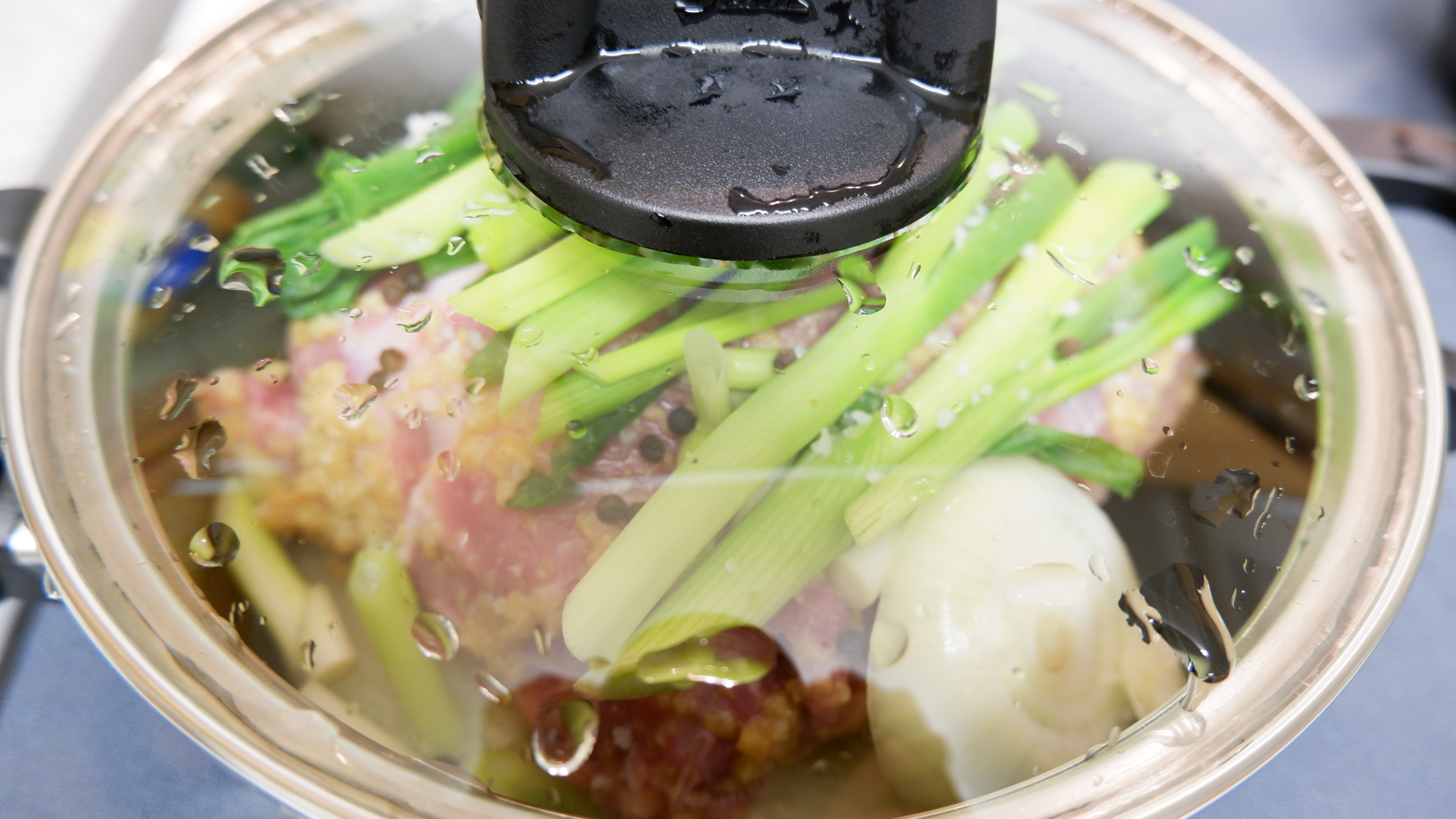 6. 30분 뒤에 보면 채소에서 수분이 나와 물이 생겼을 거예요~ 수육을 고루 익히기 위해 한번 뒤집어 주고 다시 30분간 삶아 주세요!