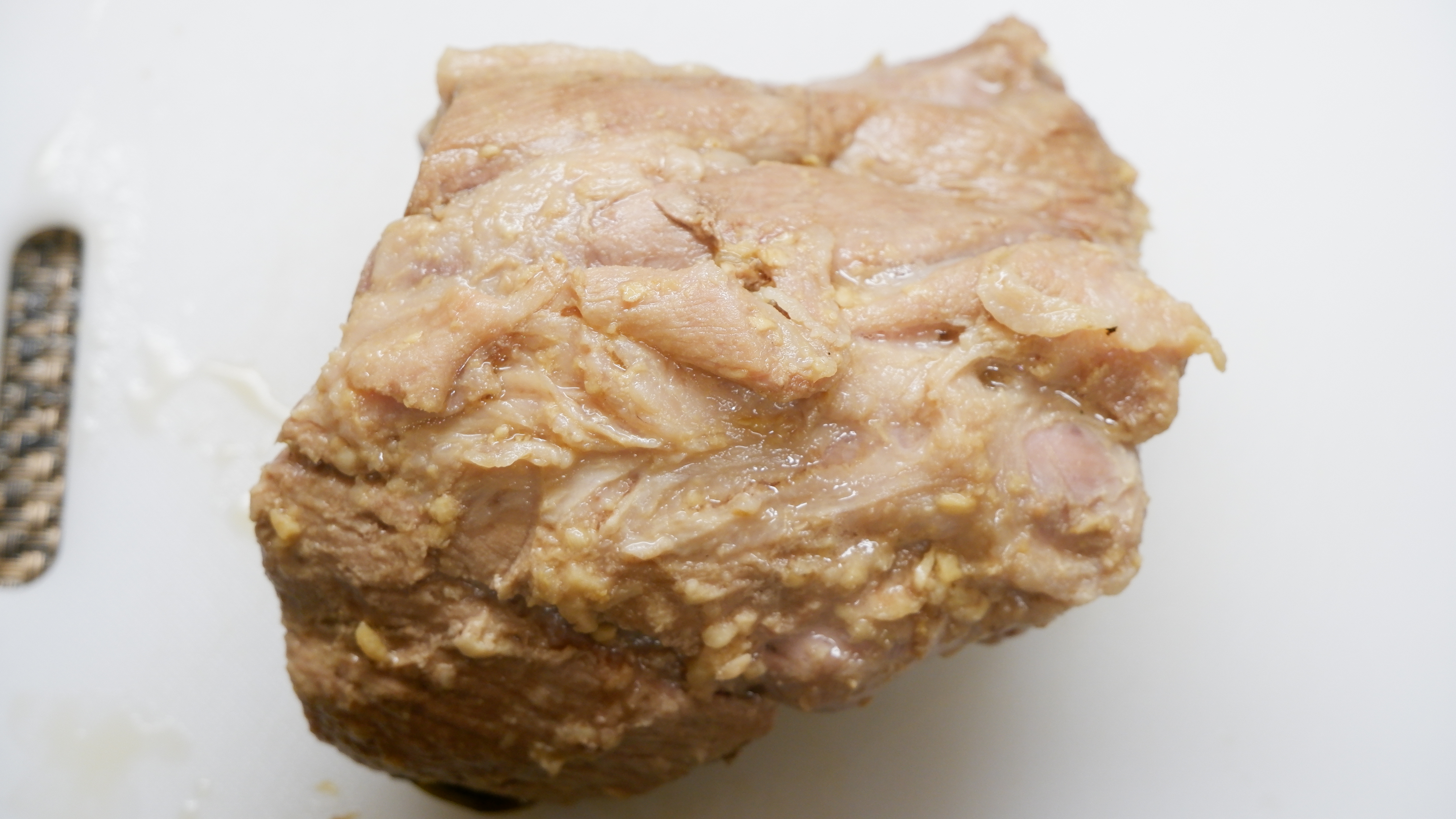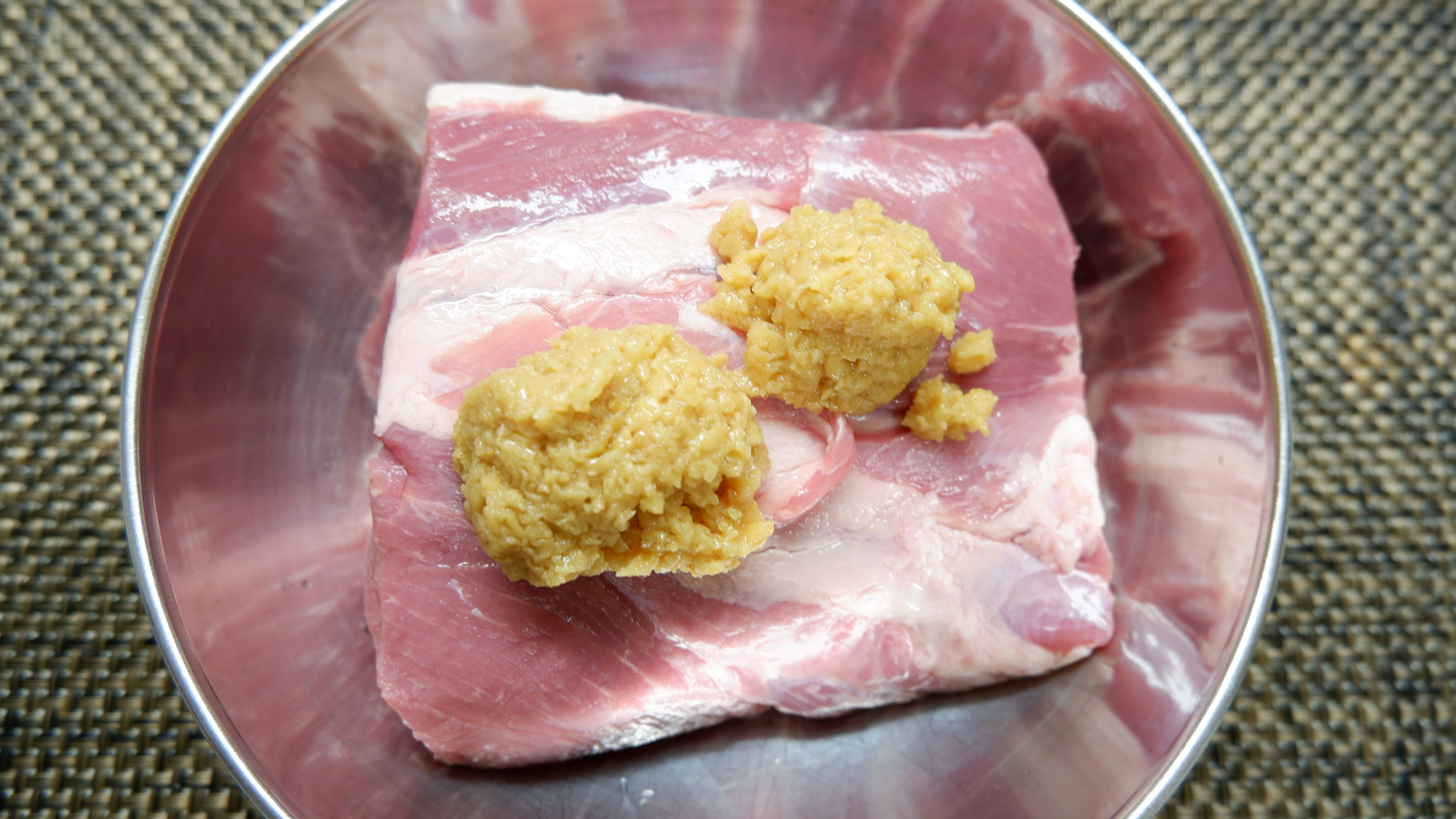 2. 잡내를 잡기 위해 돼지고기에 다진 마늘을 골고루 발라 줍니다. (숙성은 안 하셔도 돼요!)