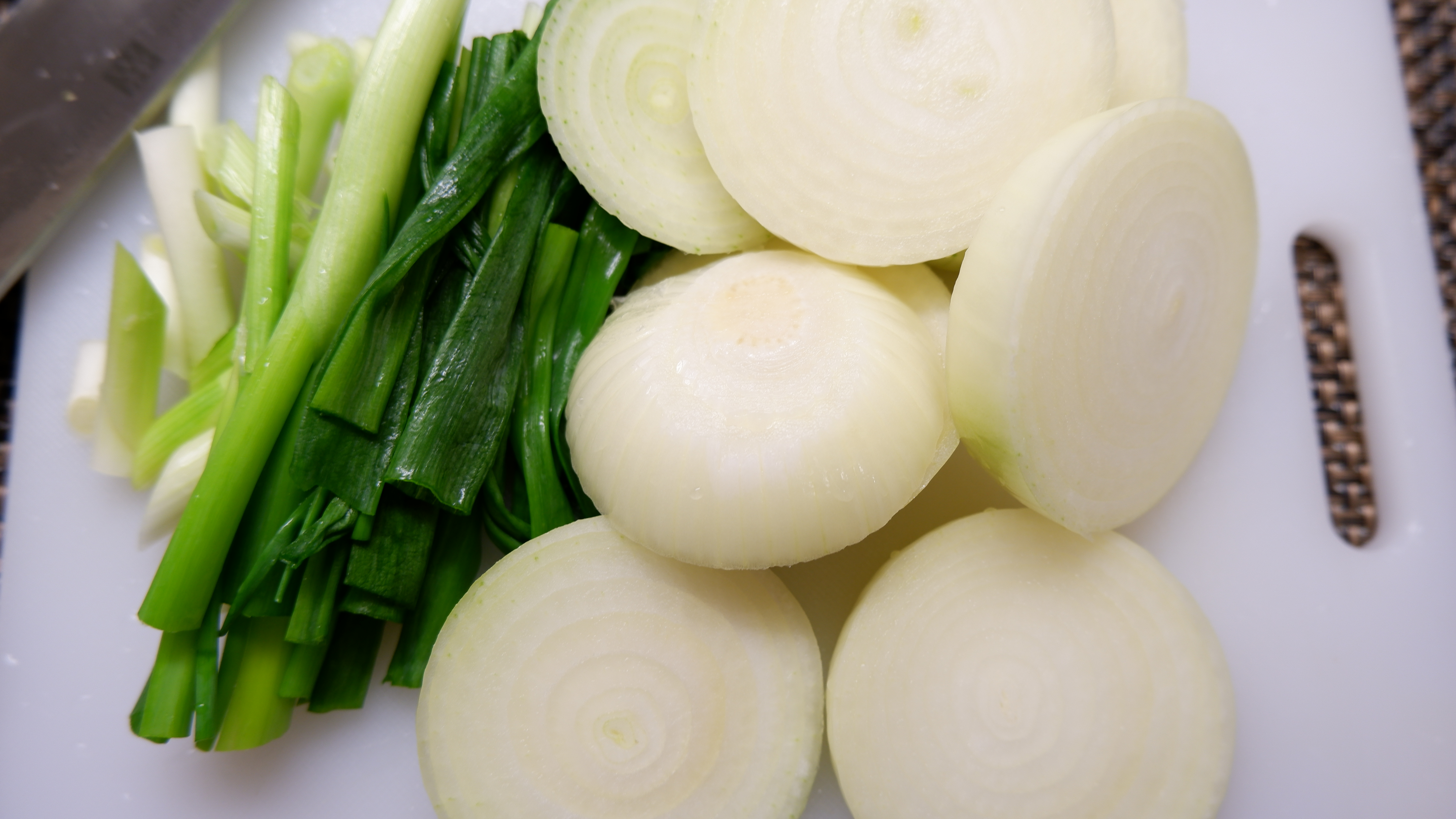 1. 먼저 대파(한단)와 양파(2개)를 손질하고 대파는 냄비 크기에 맞게 썰어주고 양파는 1.5cm 정도 두께로 썰어주세요!