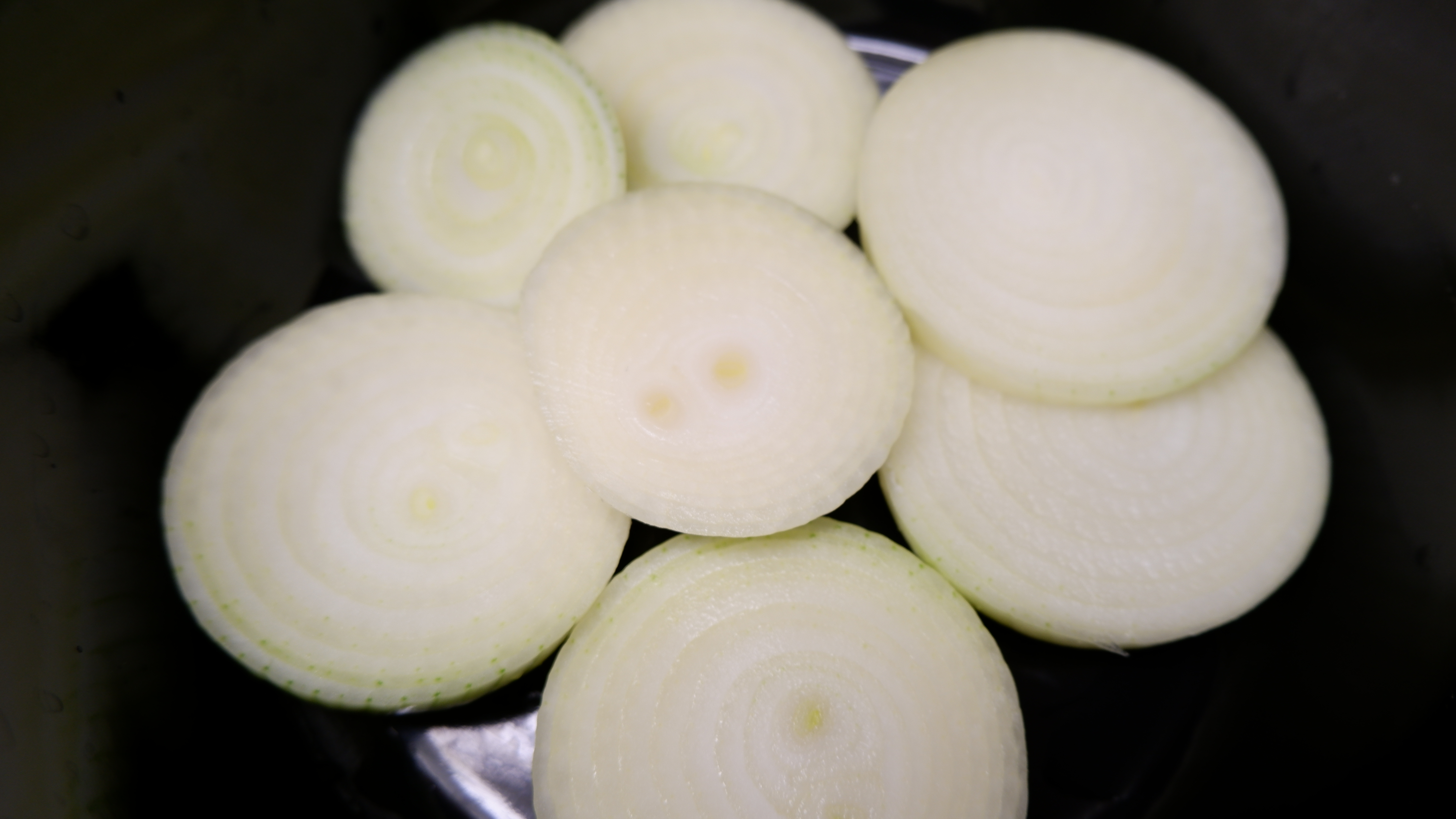 3. 물을 넣지 않고 무수분 수육을 만들 건데 먼저 냄비에 두껍게 썰은 양파를 깔고 그위에 돼지고기를 올리고 그다음 파를 올려줍니다.