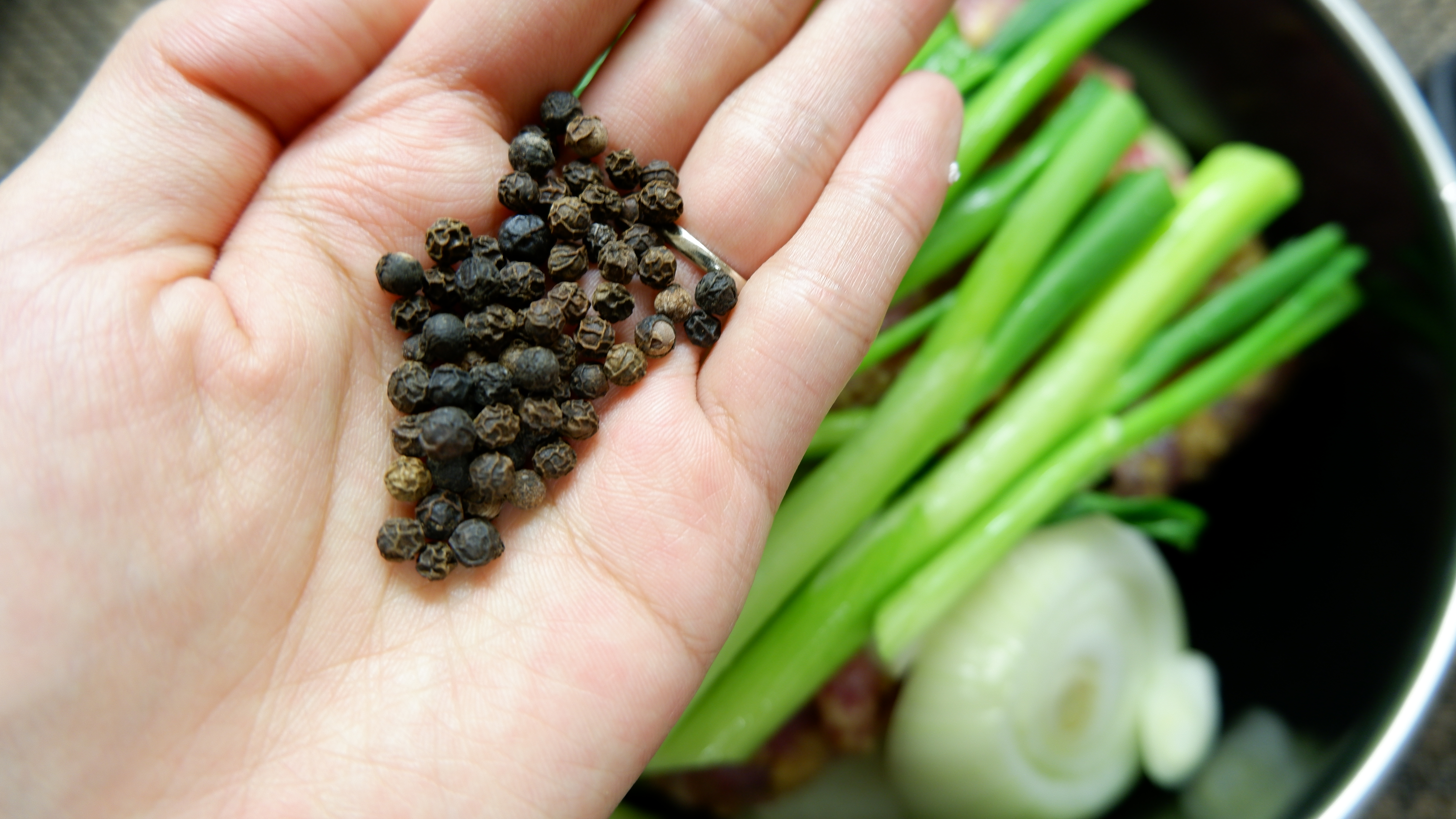 4. 통후추가 있다면 1큰술 정도 넣어 주고 통후추 대신 후춧가루를 넣은 경우 1/2 티스푼을 넣어 주고 , 약간의 굵은소금 , 소주나 청주 소주잔으로 1잔을 넣어 줍니다.