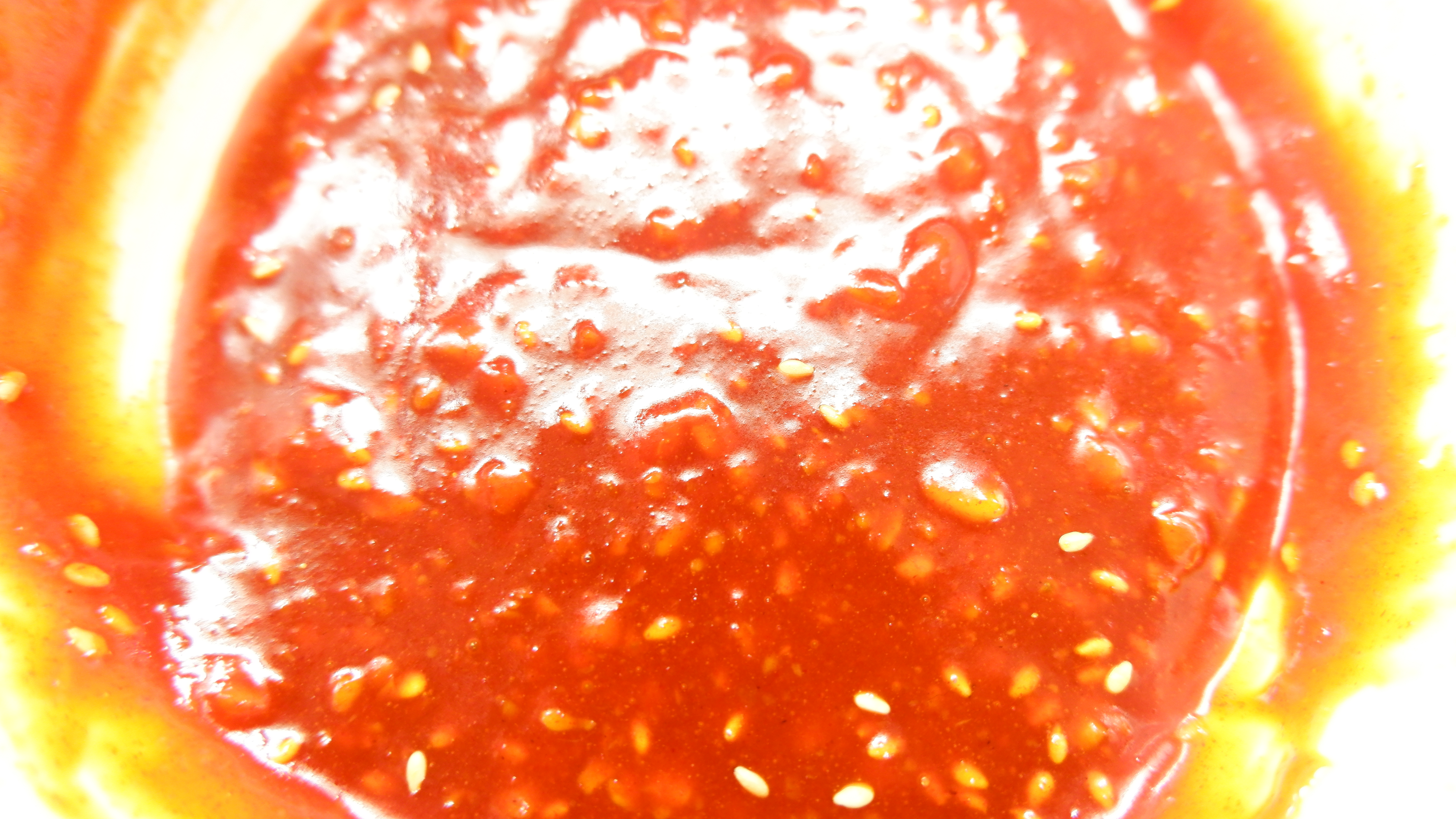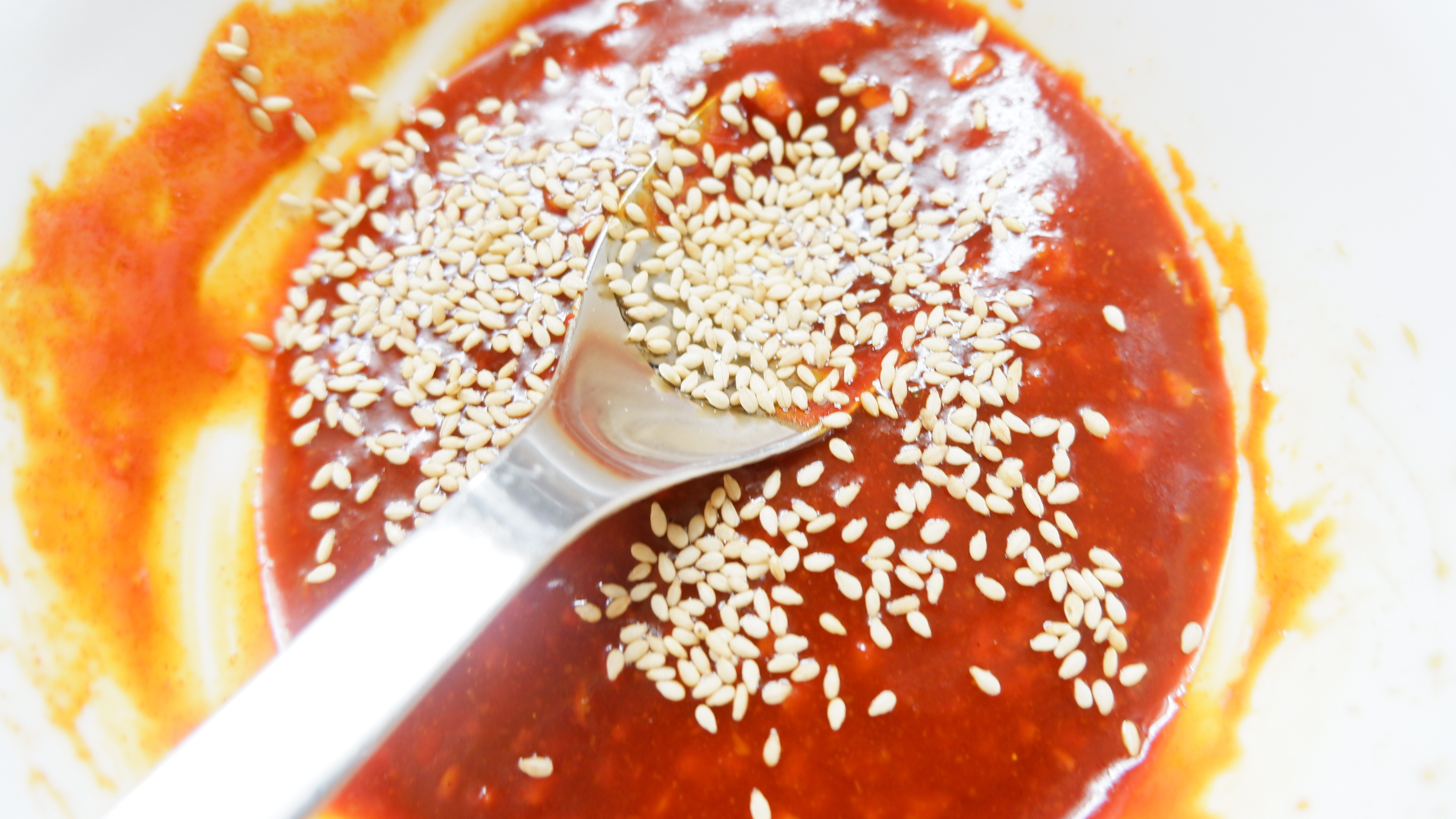 3. 재료가 준비됐다면 양념을 만들 차례인데 참기름 1큰술 , 고추장 1큰술 반 , 올리고당 1큰술 반 , 간장 1큰술 , 다진 마늘 1큰술 , 볶음 깨를 넣고 잘 섞어 양념장을 만들어 줍니다.