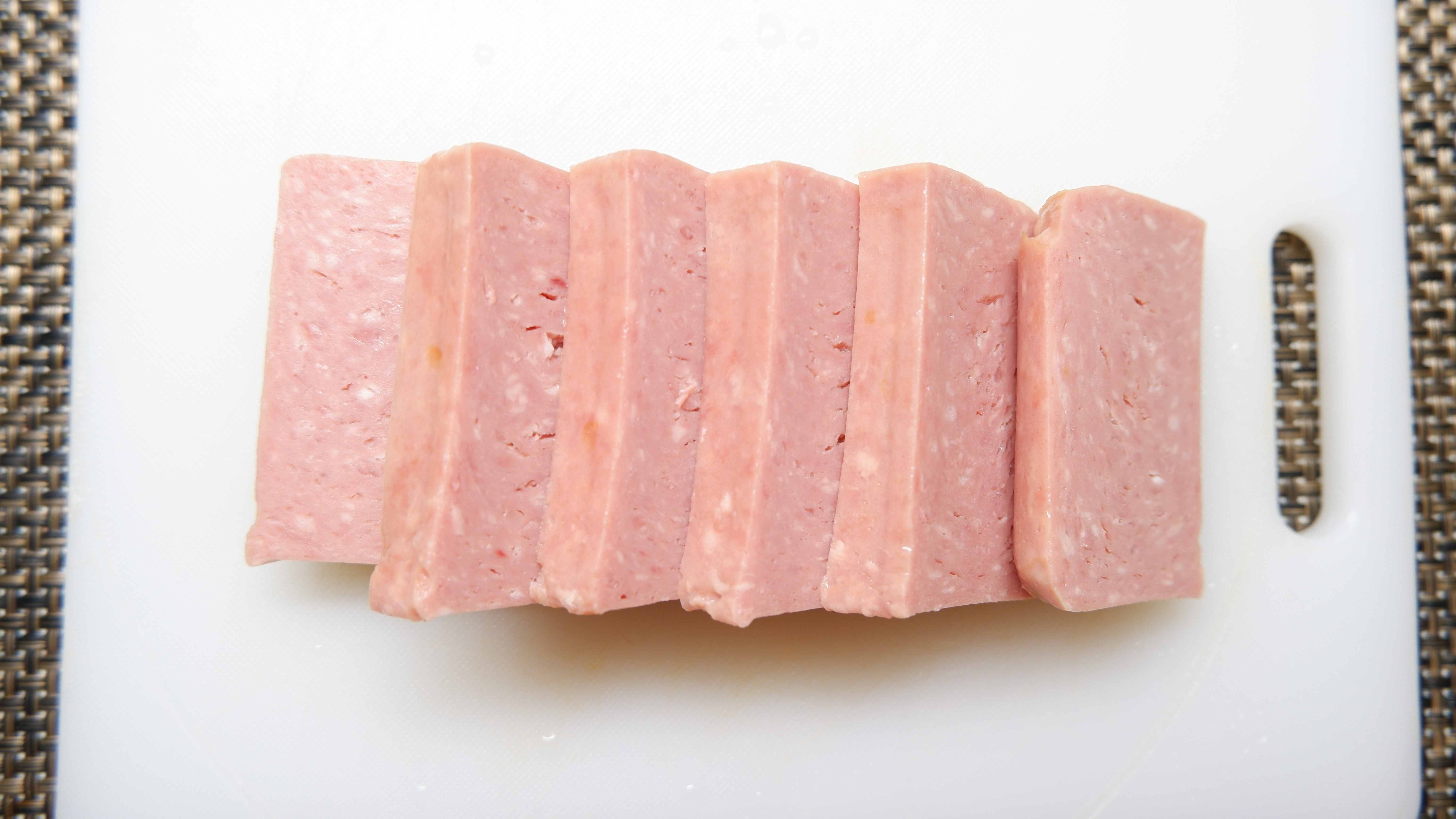 1. 먼저 스팸을 취향에 맛게 원하는 크기와 두께로 썰어 주세요! 전 6등분으로 해줬습니다. 술안주로는 먹기 편하도록 스틱처럼 썰어주는 게 좋겠죠?