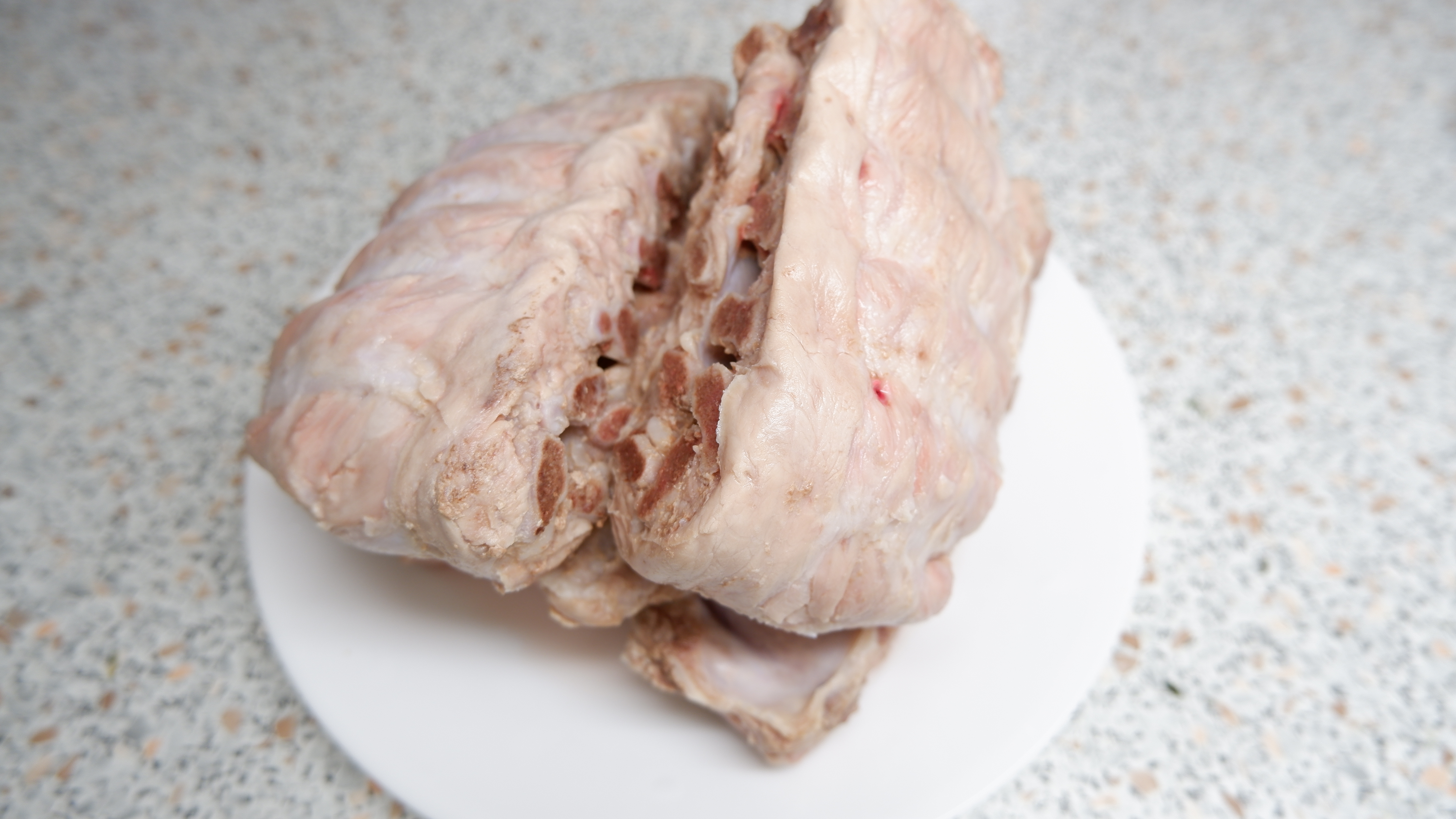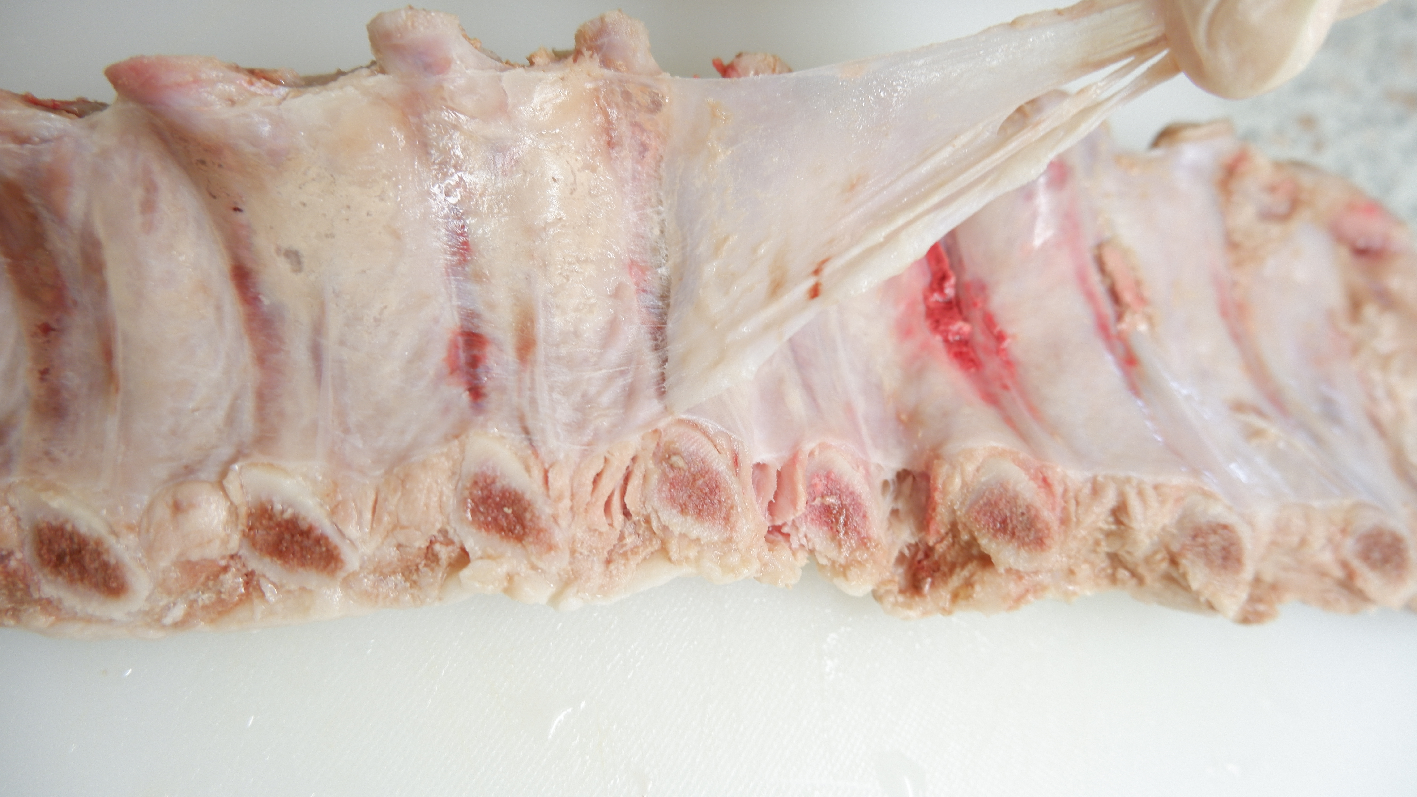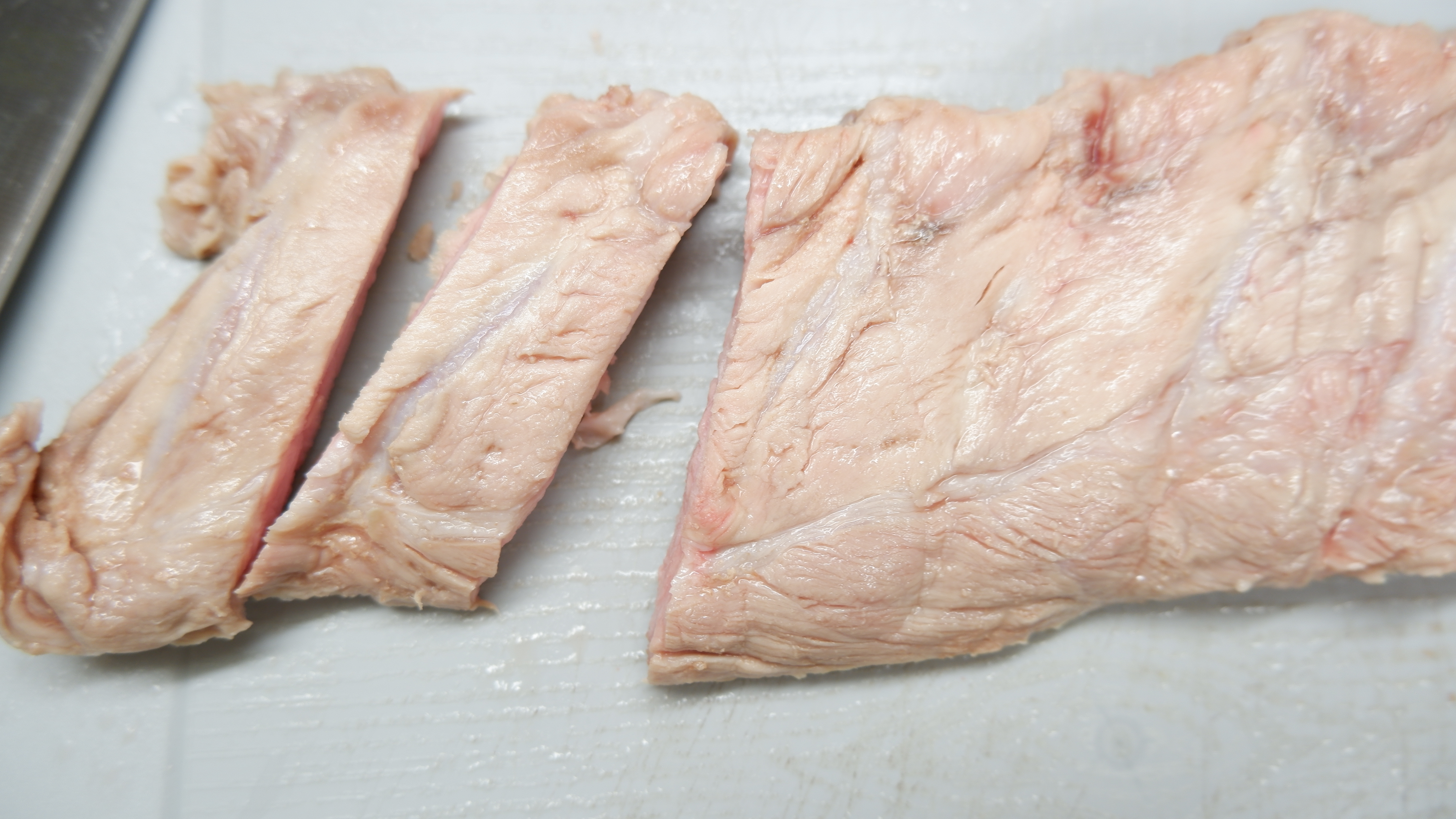 3. 삶아낸 등갈비의 근막을 제거해주고 갈빗대 사이사이를 썰어 줍니다. (근막을 제거하는 이유는 근막이 질겨서 근막을 제거하지 않으면 식감이 질겨지기 때문)