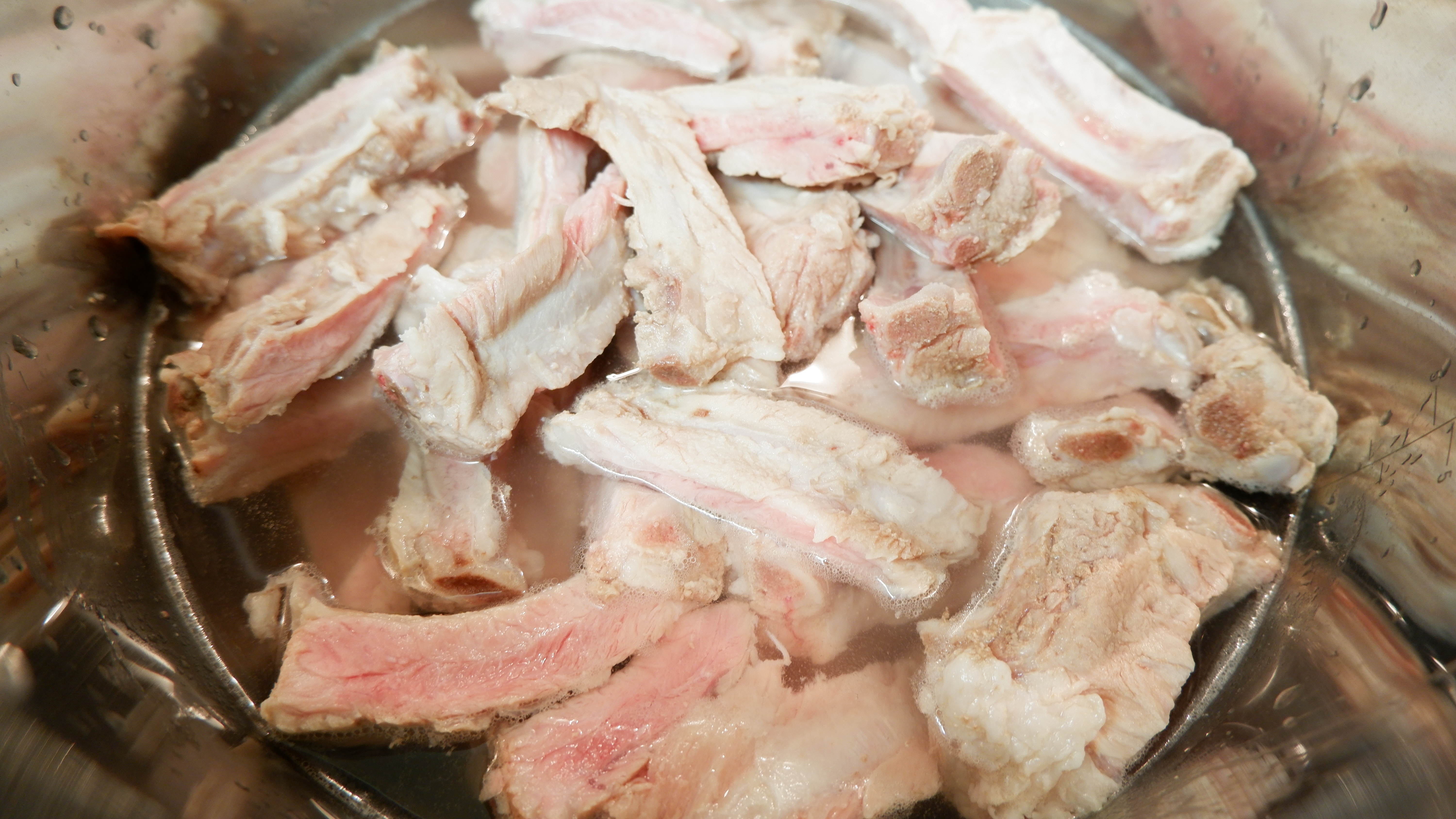 1. 냄비에 등갈비를 넣고 등갈비가 완전히 잠기도록 물을 부은 다음 잡내 제거를 위해 설탕 1큰술과 청주나 소주를 한컵(소주잔) 넣어 준 뒤 삶아 주세요!