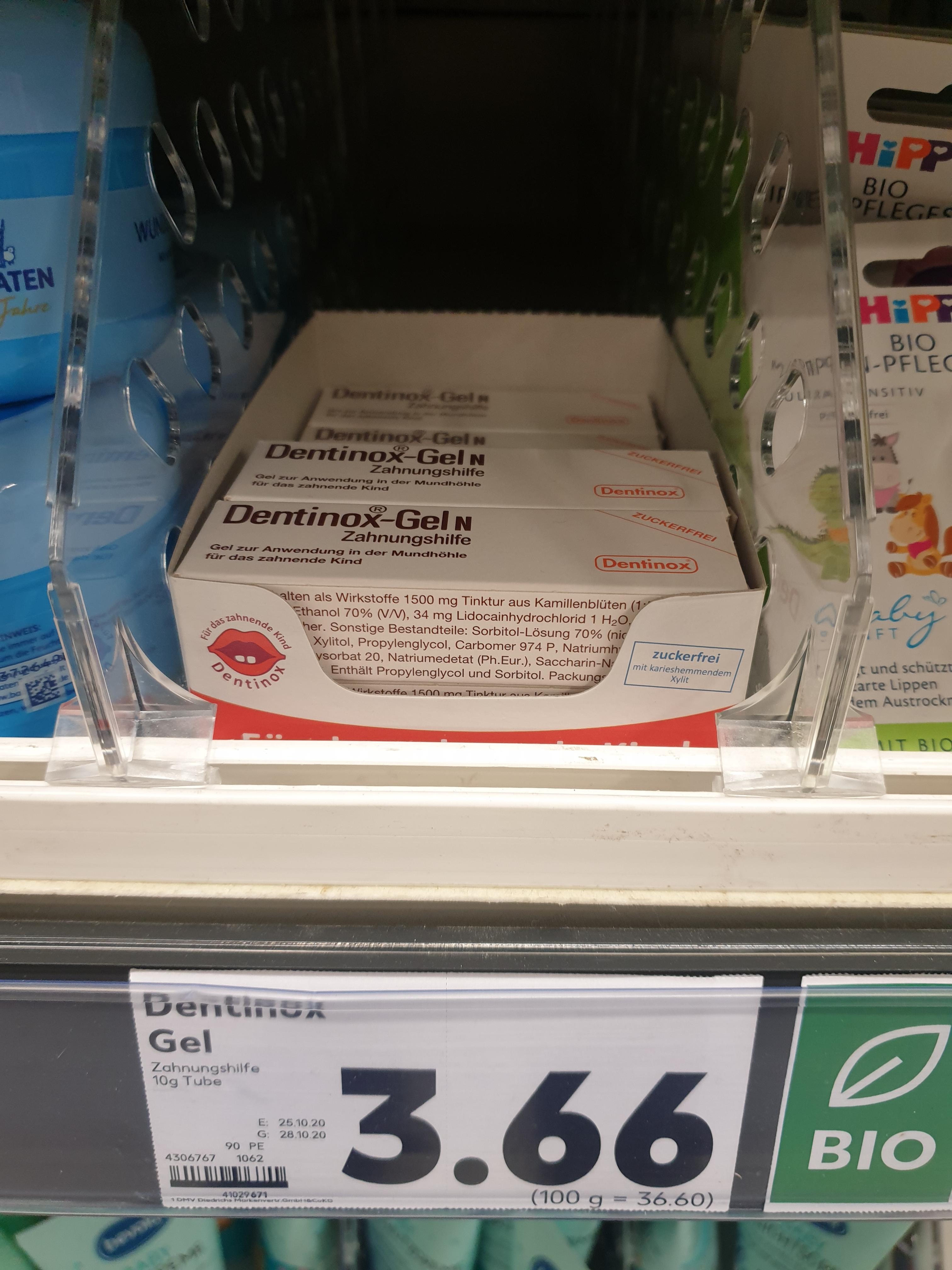 덴티녹스 젤 (dentinox gel)은 처방전이 없어도 독일에서 쉽게 구할 수 있는 제품이에요~ 온라인 , 마트 , 드럭스토어 , 약국에서 구매하실 수 있습니다. 가격은 조금씩 다른데 3~4유로 사이라 보시면 돼요!