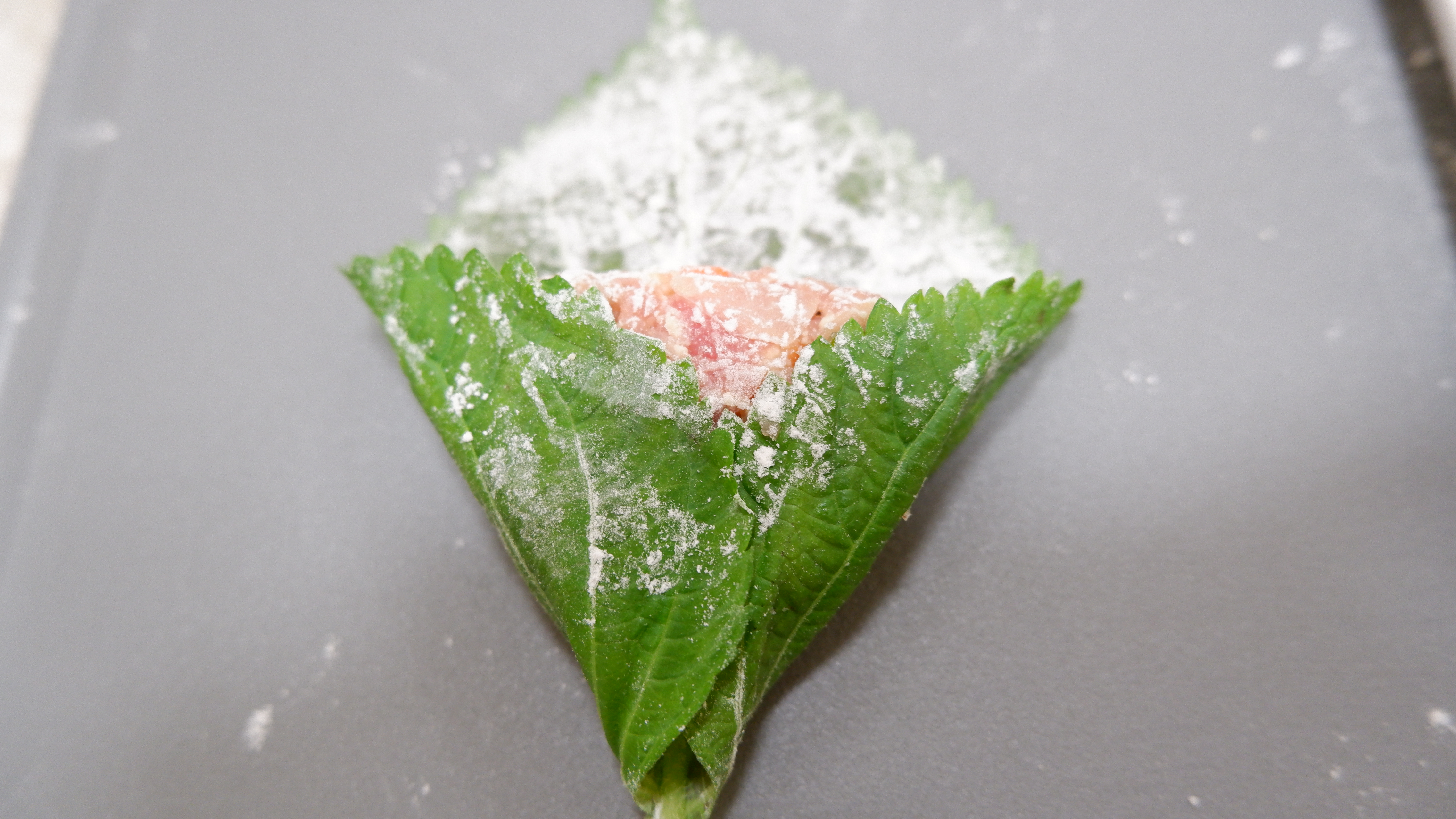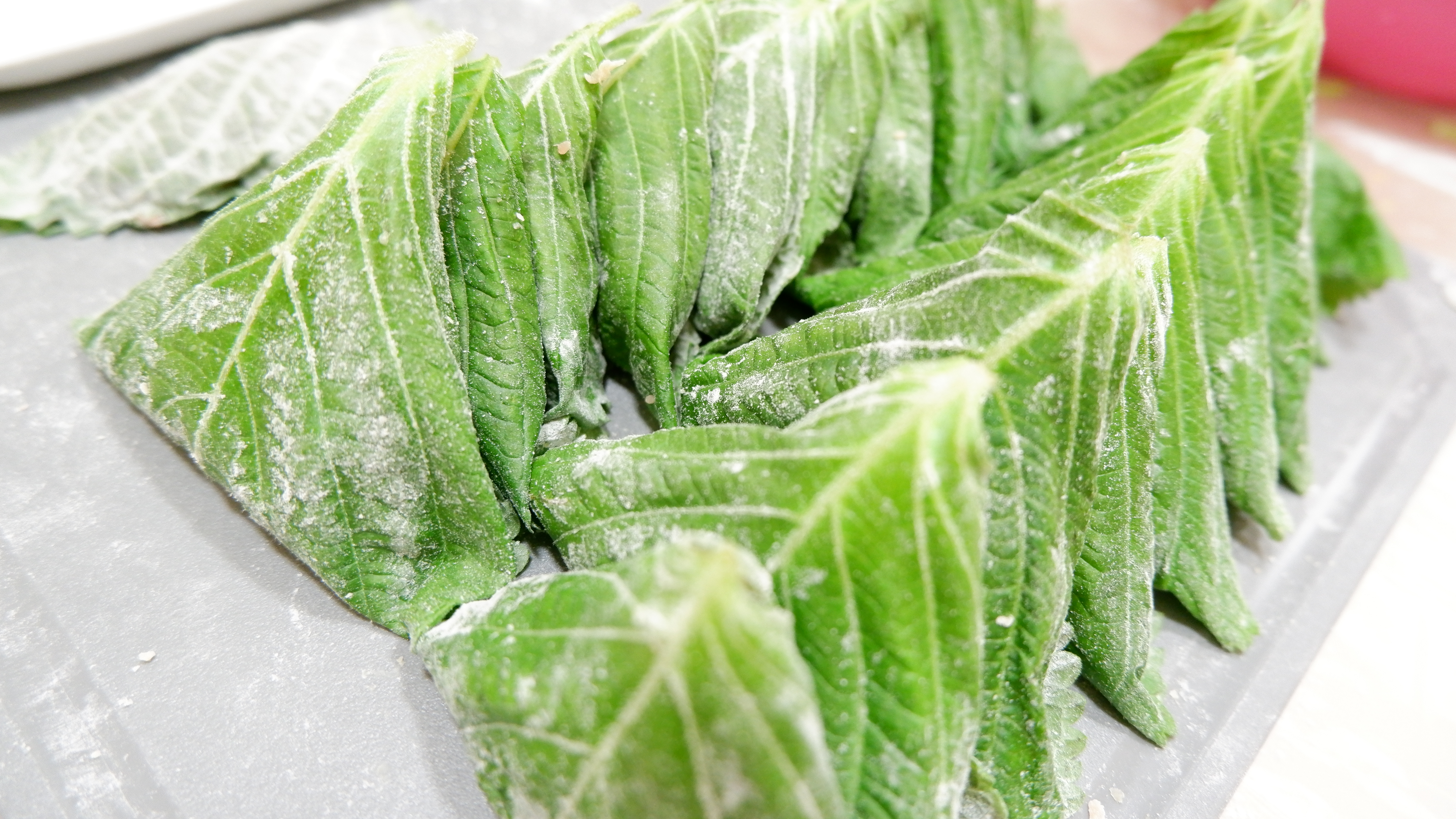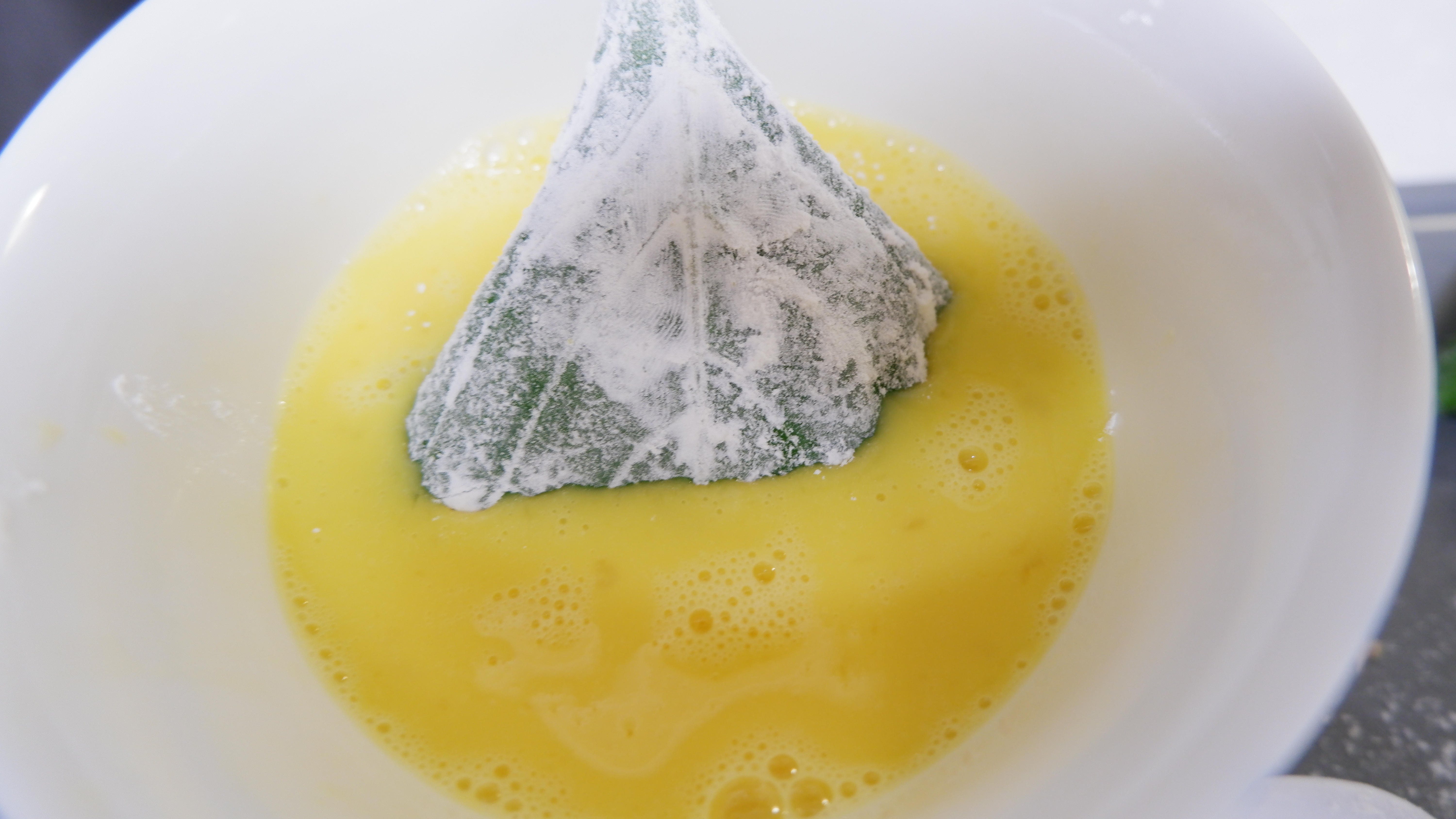10. 그다음 깻잎 뒷면에 부침가루를 묻히고 그위에 반죽 1큰술을 올려주고 둥근 부분 양쪽을 접고 위부분을 아래로 내리면 세모 깻잎전을 만들 수 있어요! (반죽을 너무 많이 넣으면 덜 익거나 익는데 시간이 오래 걸리기 때문에 적당량을 넣어주세요!)