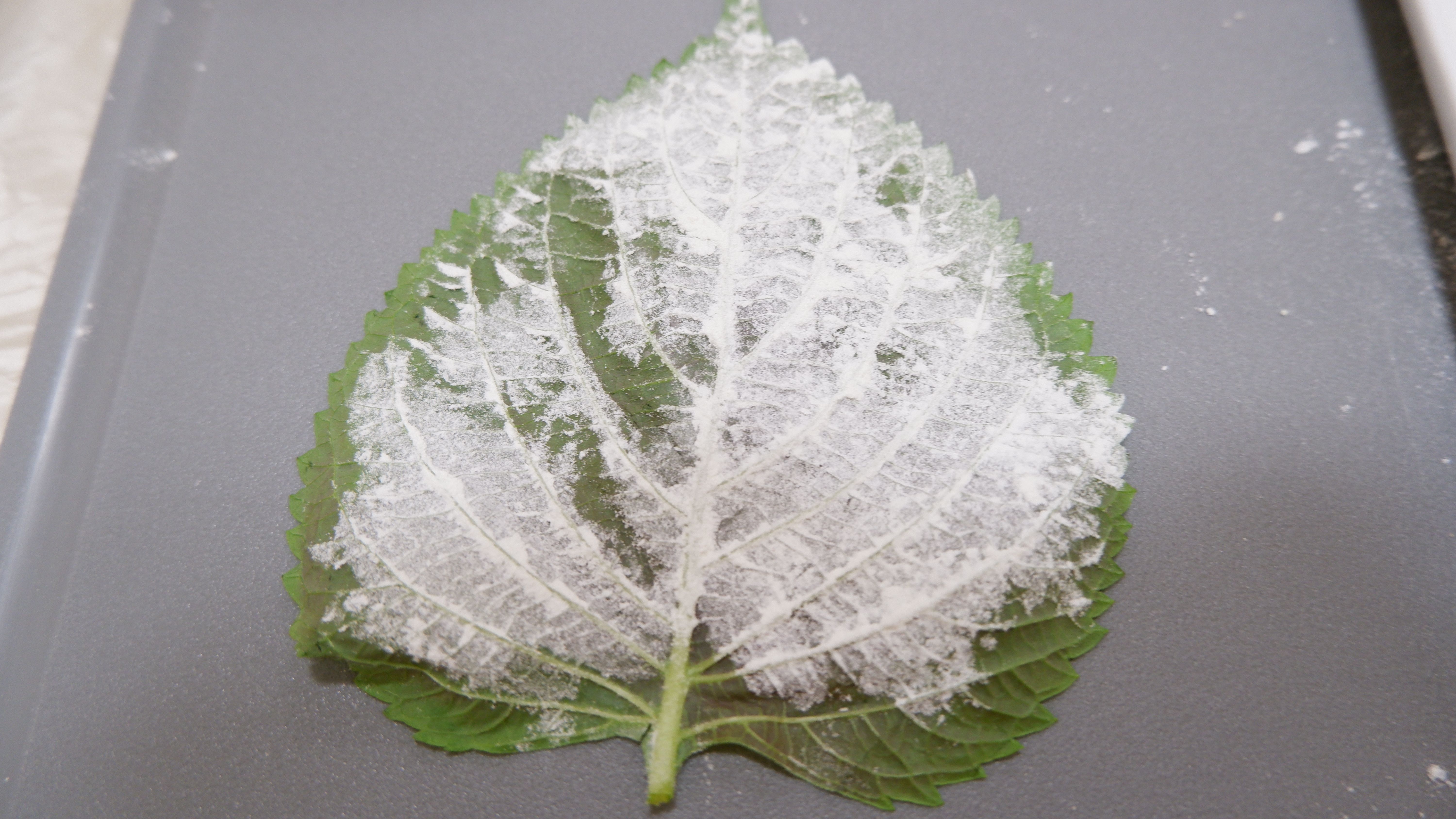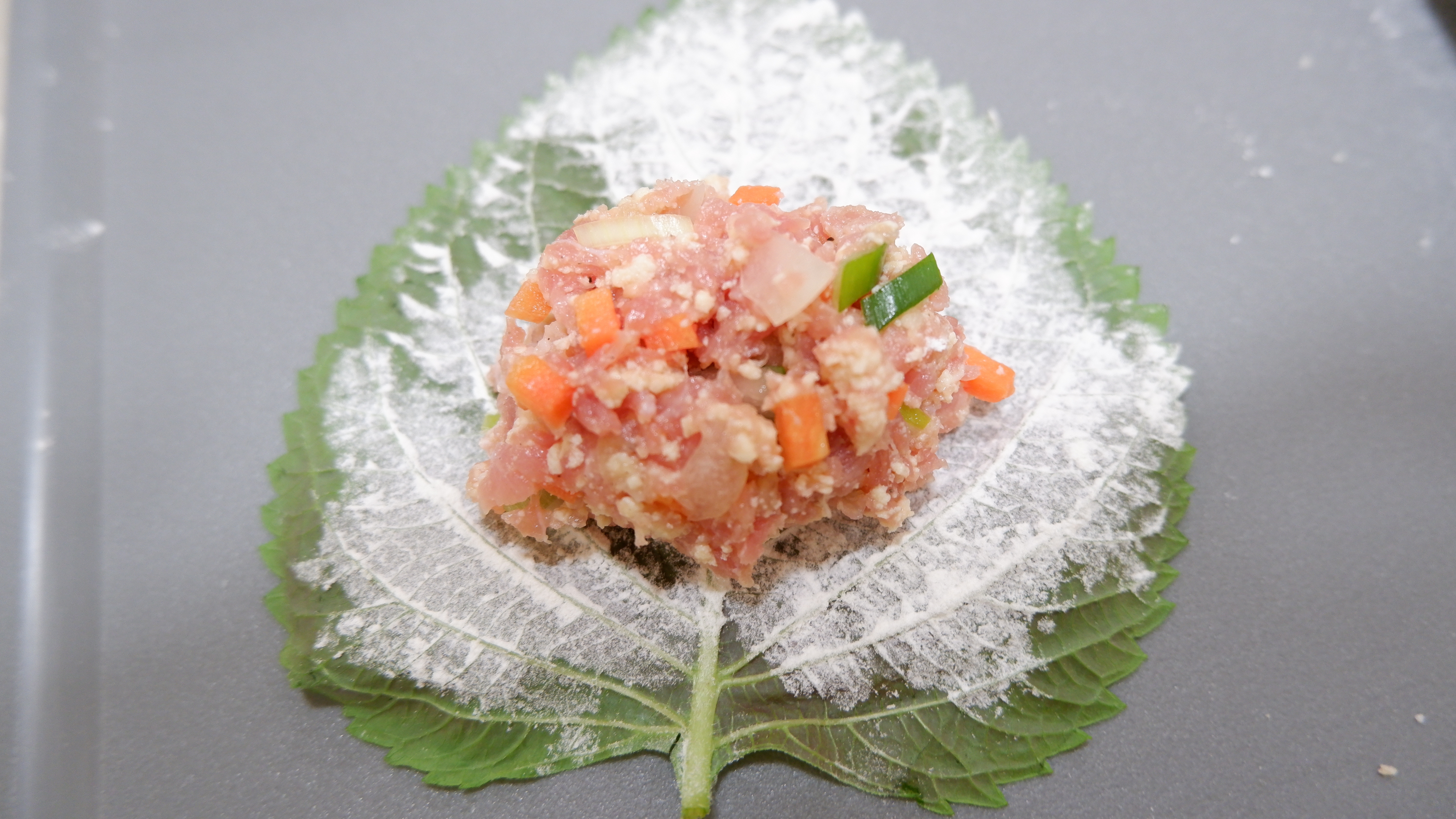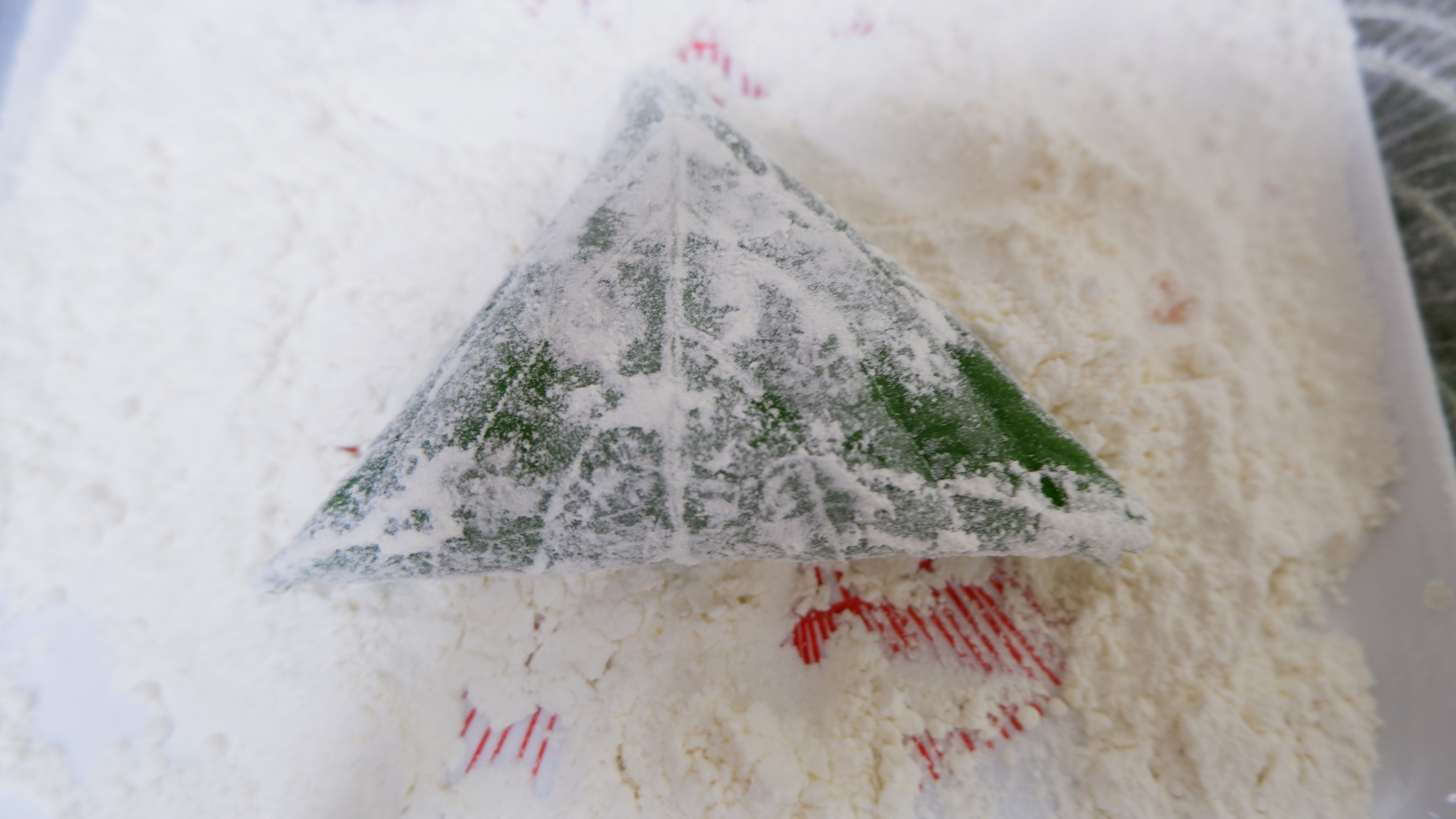 10. 그다음 깻잎 뒷면에 부침가루를 묻히고 그위에 반죽 1큰술을 올려주고 둥근 부분 양쪽을 접고 위부분을 아래로 내리면 세모 깻잎전을 만들 수 있어요! (반죽을 너무 많이 넣으면 덜 익거나 익는데 시간이 오래 걸리기 때문에 적당량을 넣어주세요!)