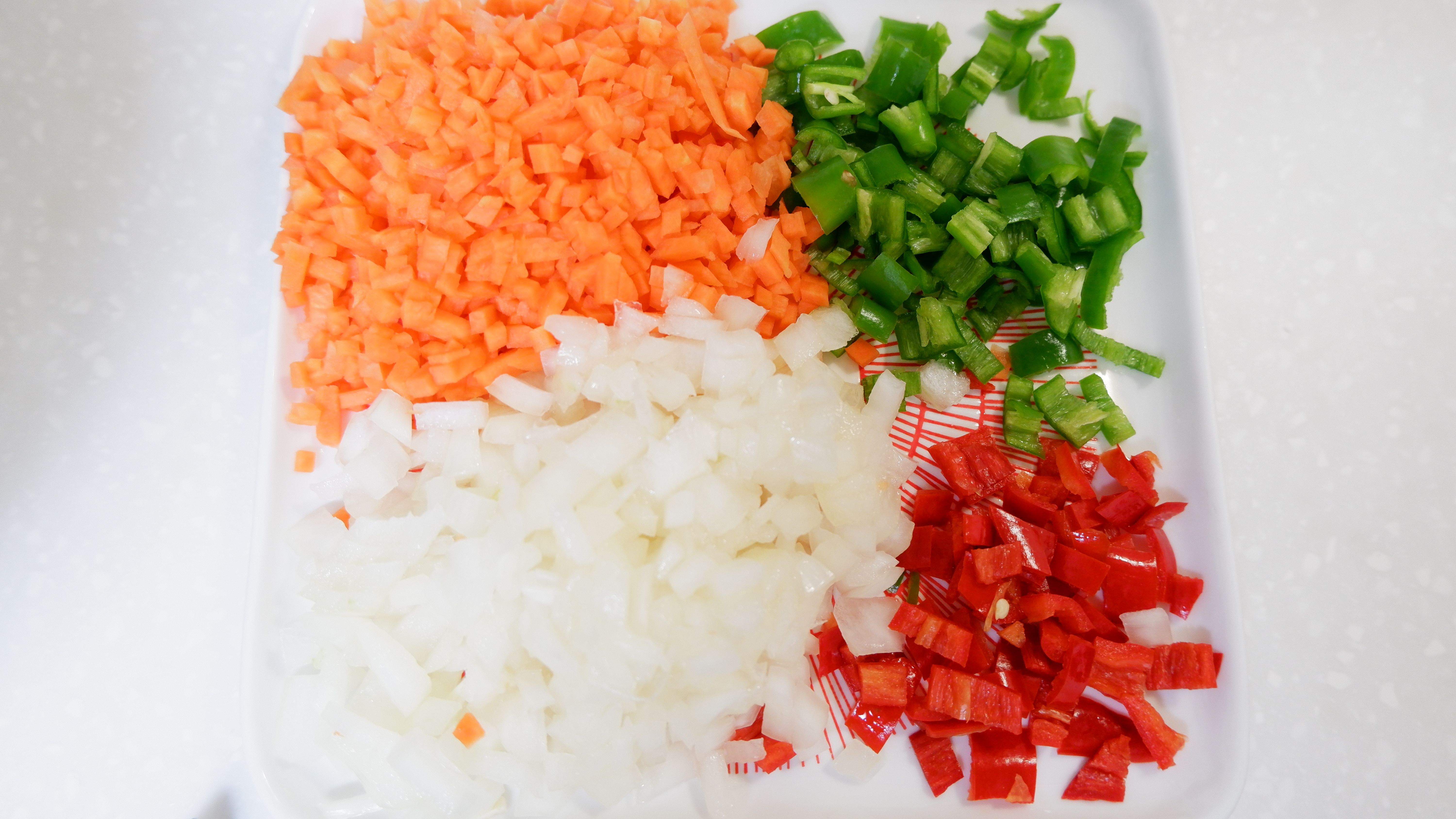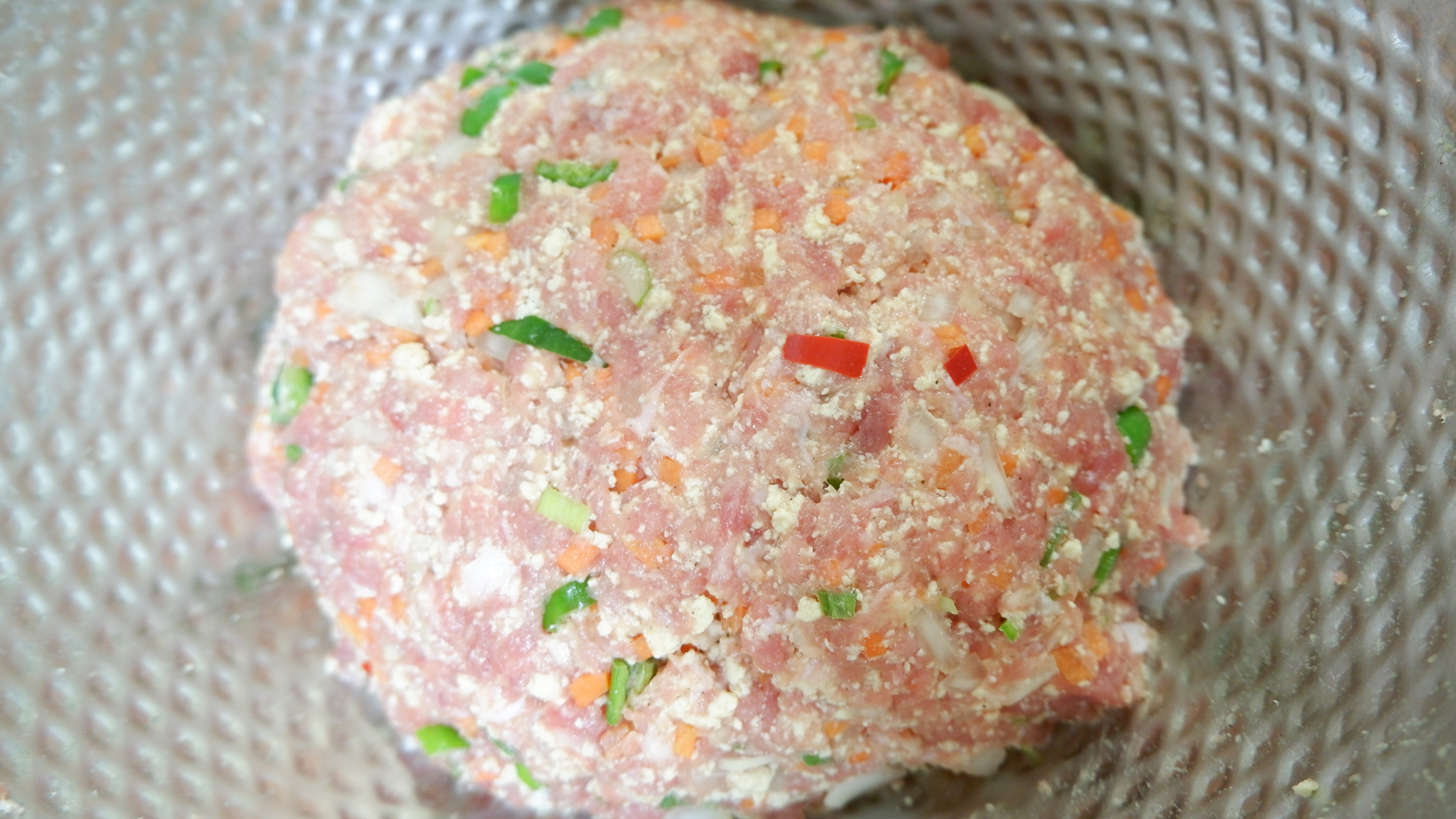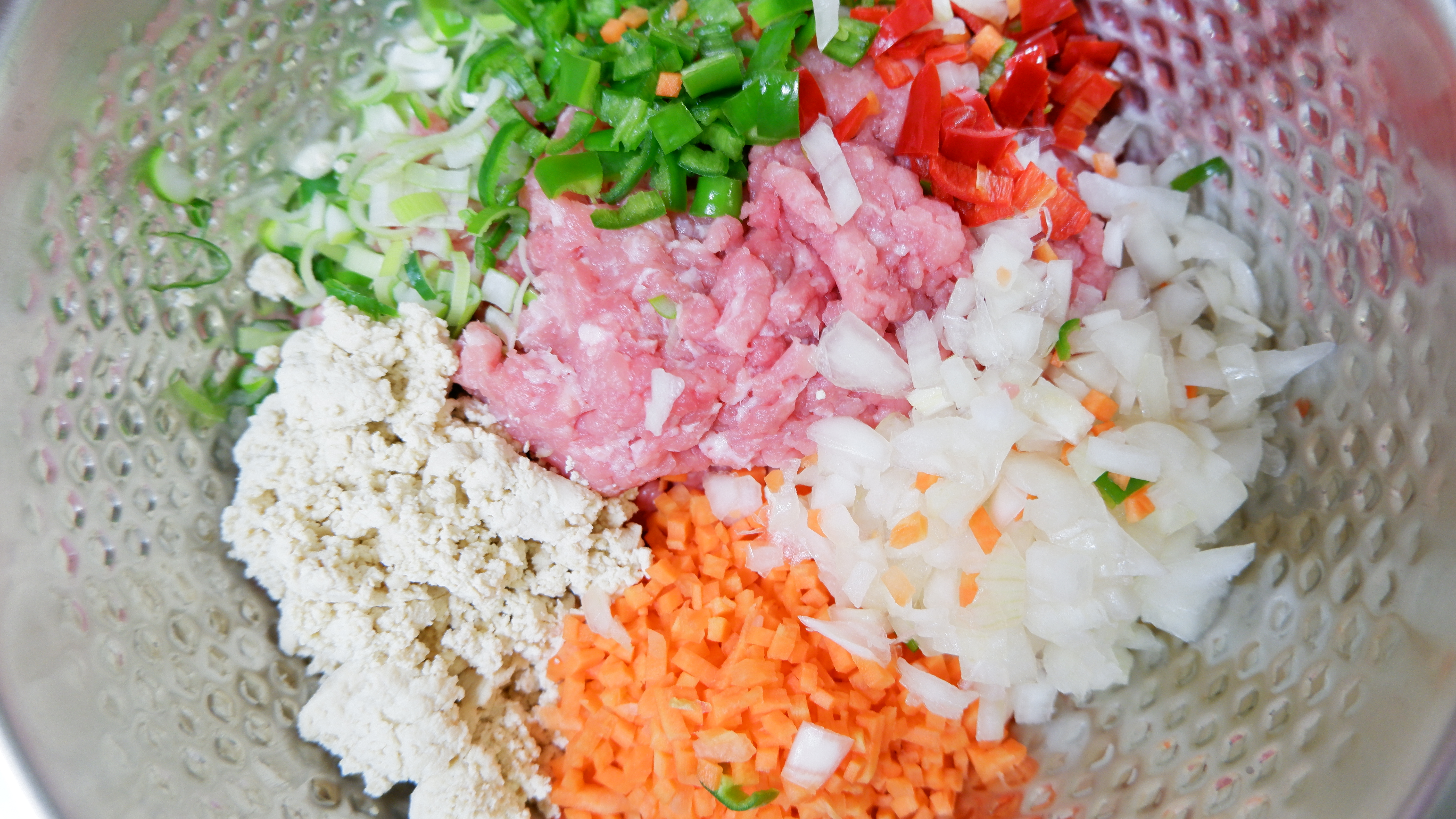 준비 재료 : 다짐육 돼지고기 700g , 두부 한 모 , 고추 2개 , 홍고추 1개 , 양파 1/2개 , 당근 1/3개 , 대파 1대 , 계란 1개