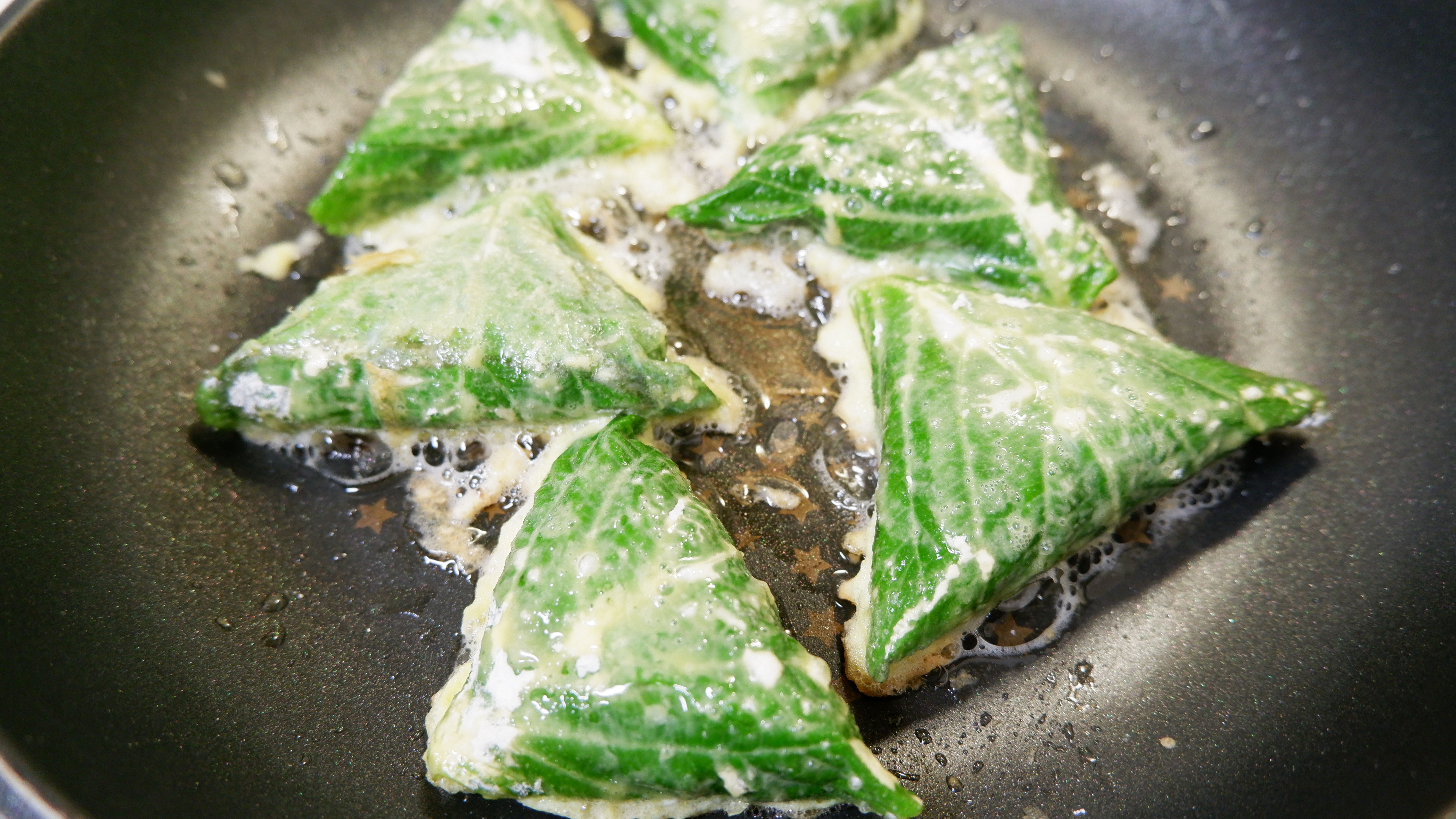13. 돼지고기가 익는데 시간이 걸리기 때문에 약불에 천천히 익혀 주셔야 해요! 앞뒤로 노릇노릇하고 표면이 탄탄해지면 세모 깻잎전 완성!