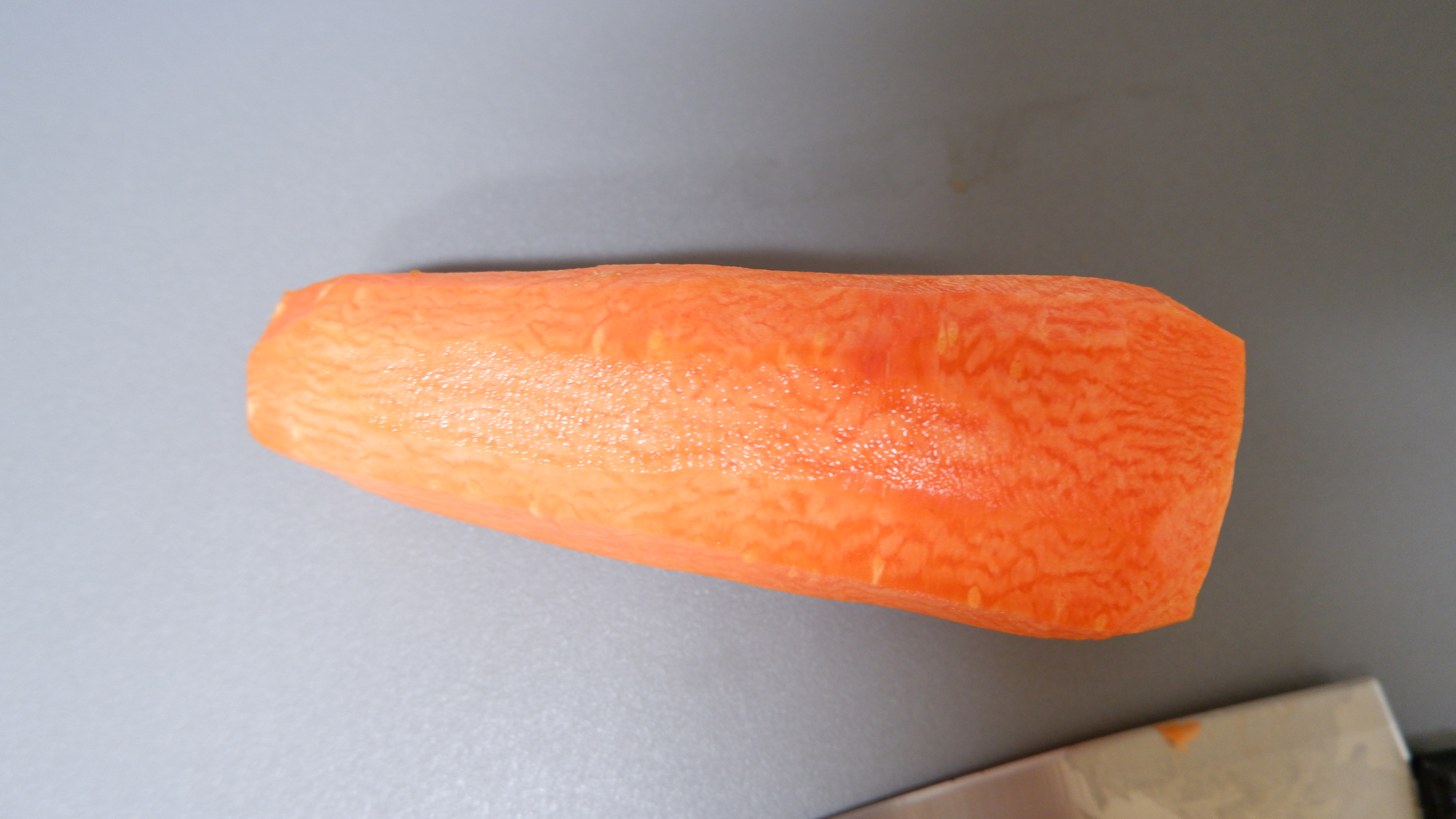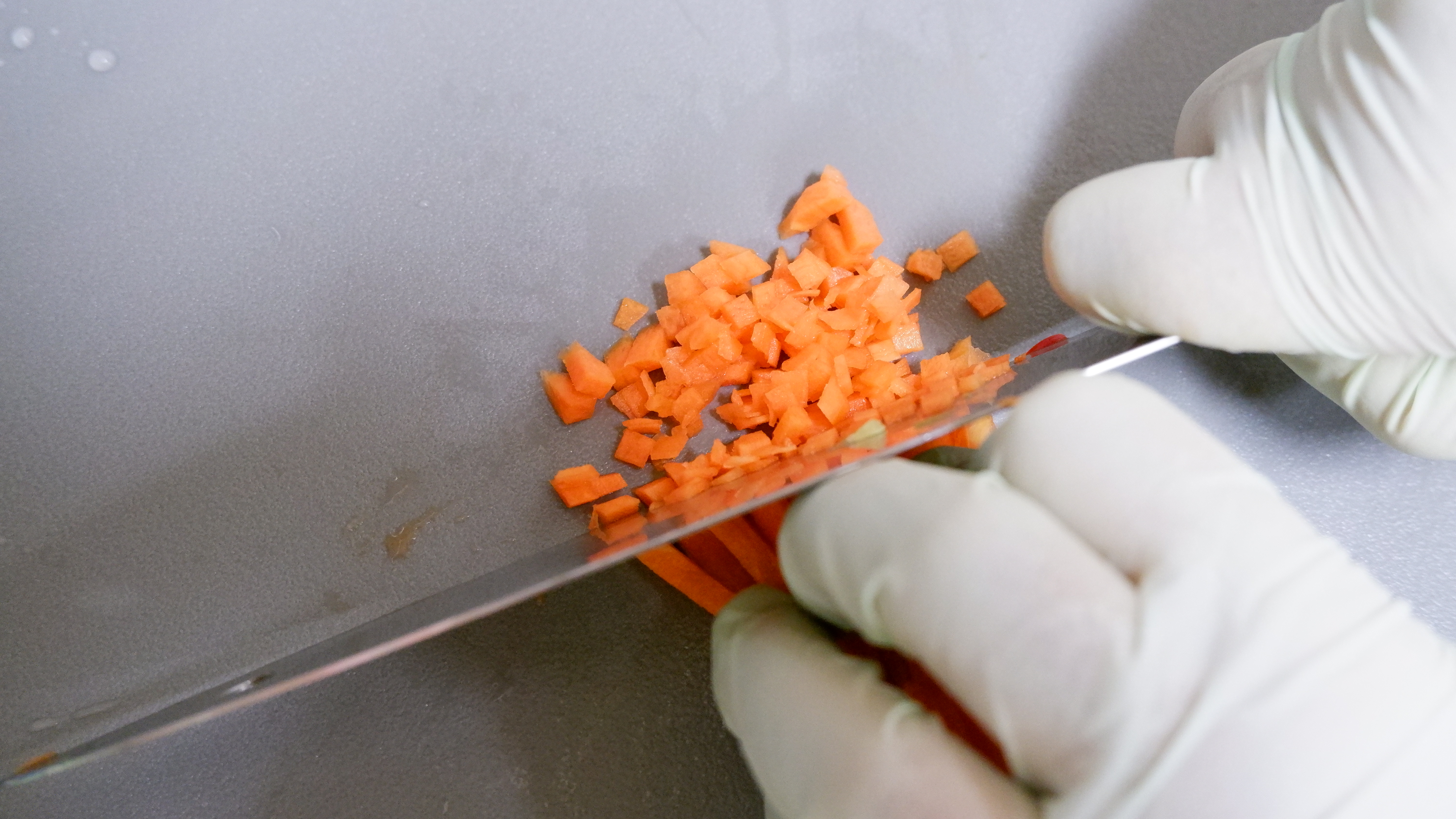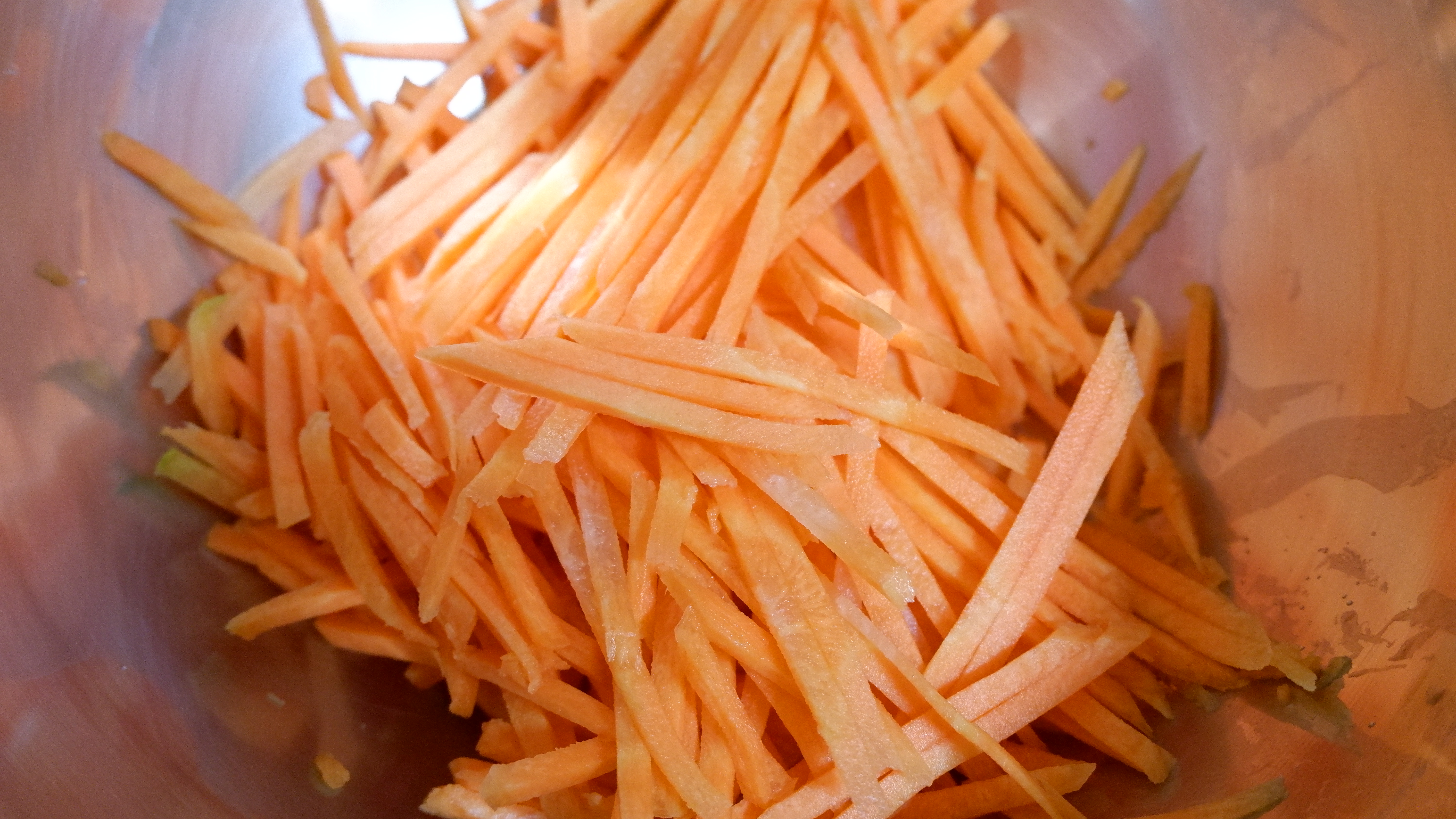 2. 당근은 껍질을 벗기고 1/3개 만 채칼을 이용해 채를 썬 후 잘게 썰어줍니다. (이렇게 해야 당근을 쉽게 다질 수 있어요!)