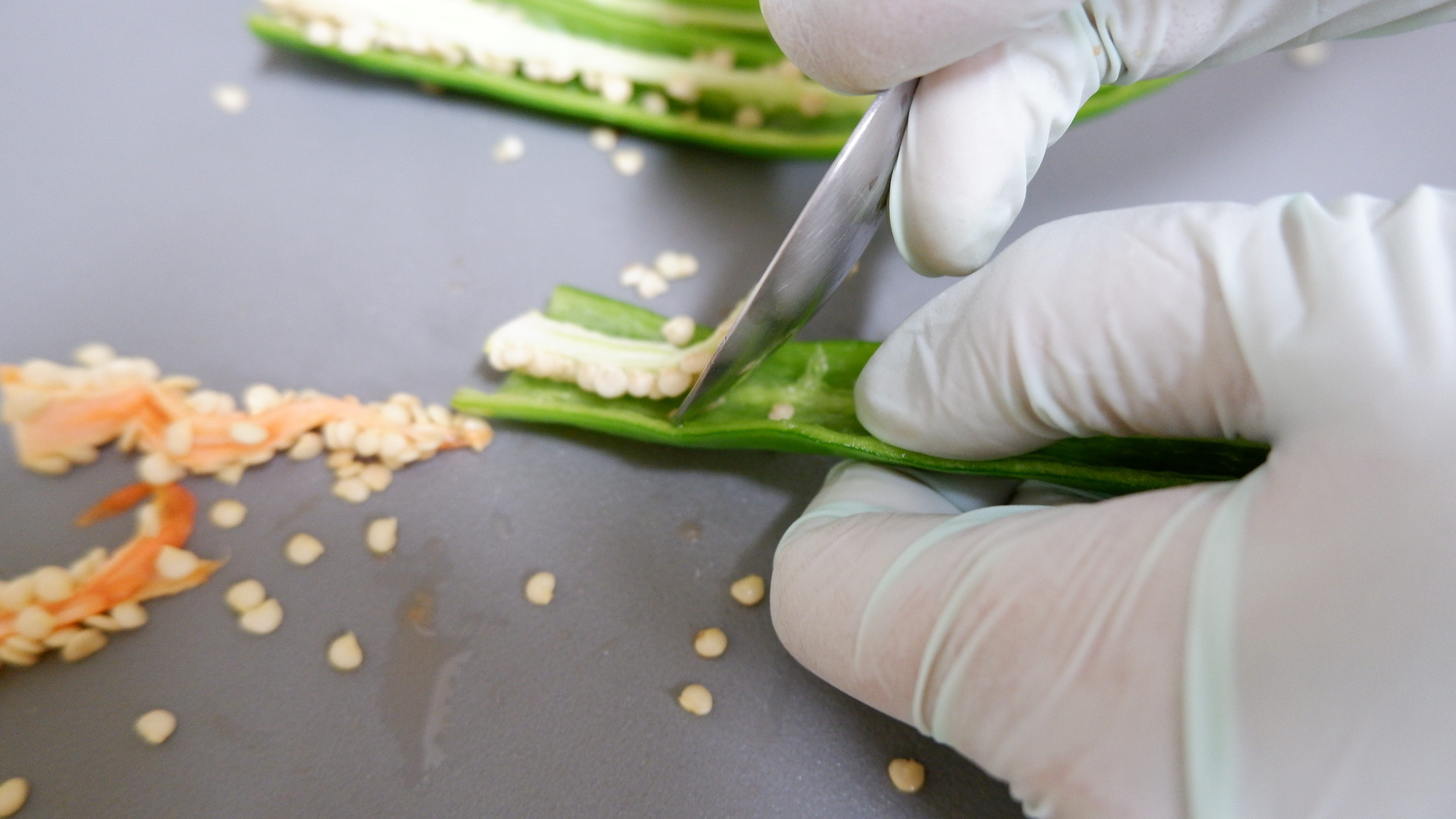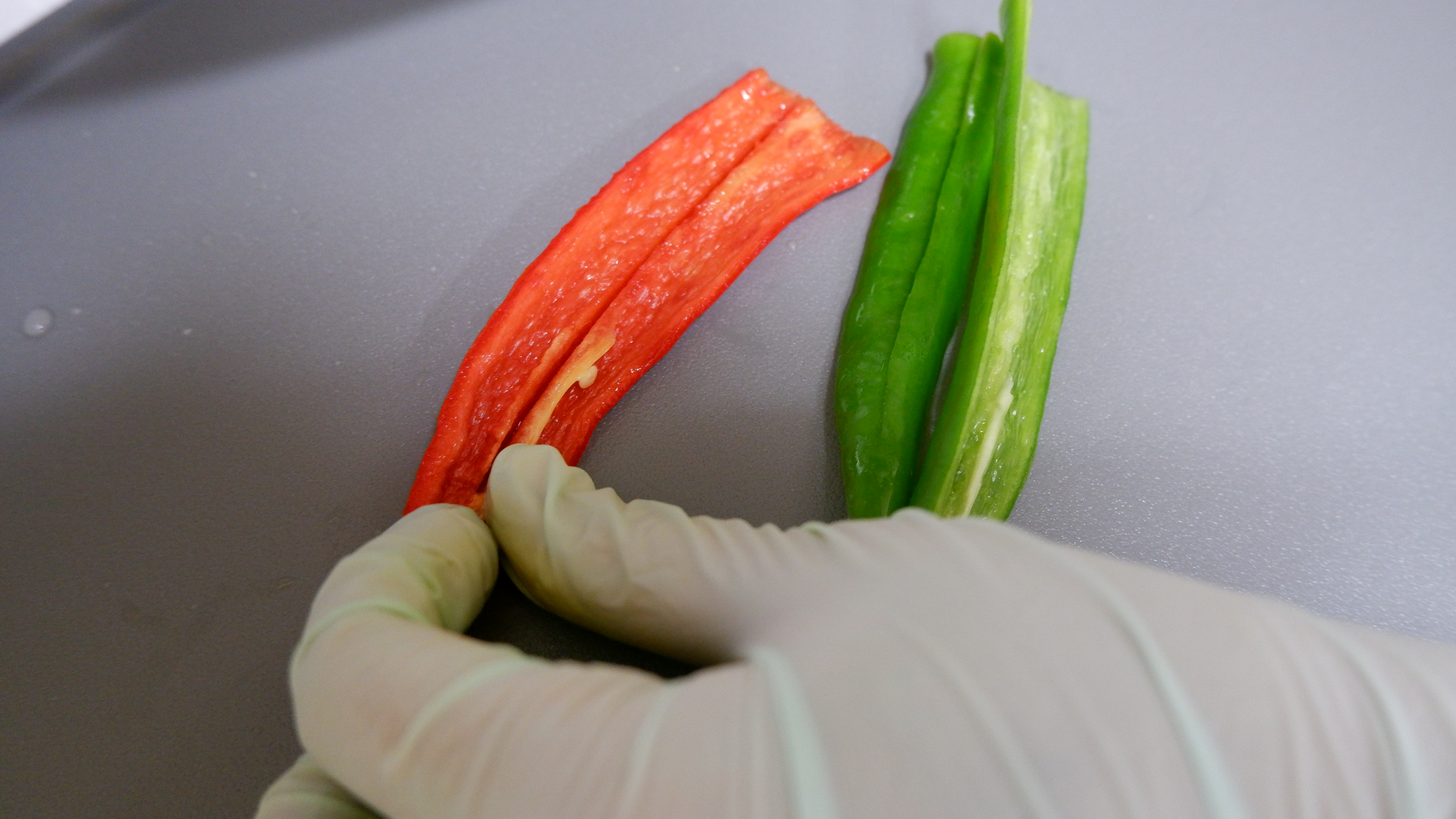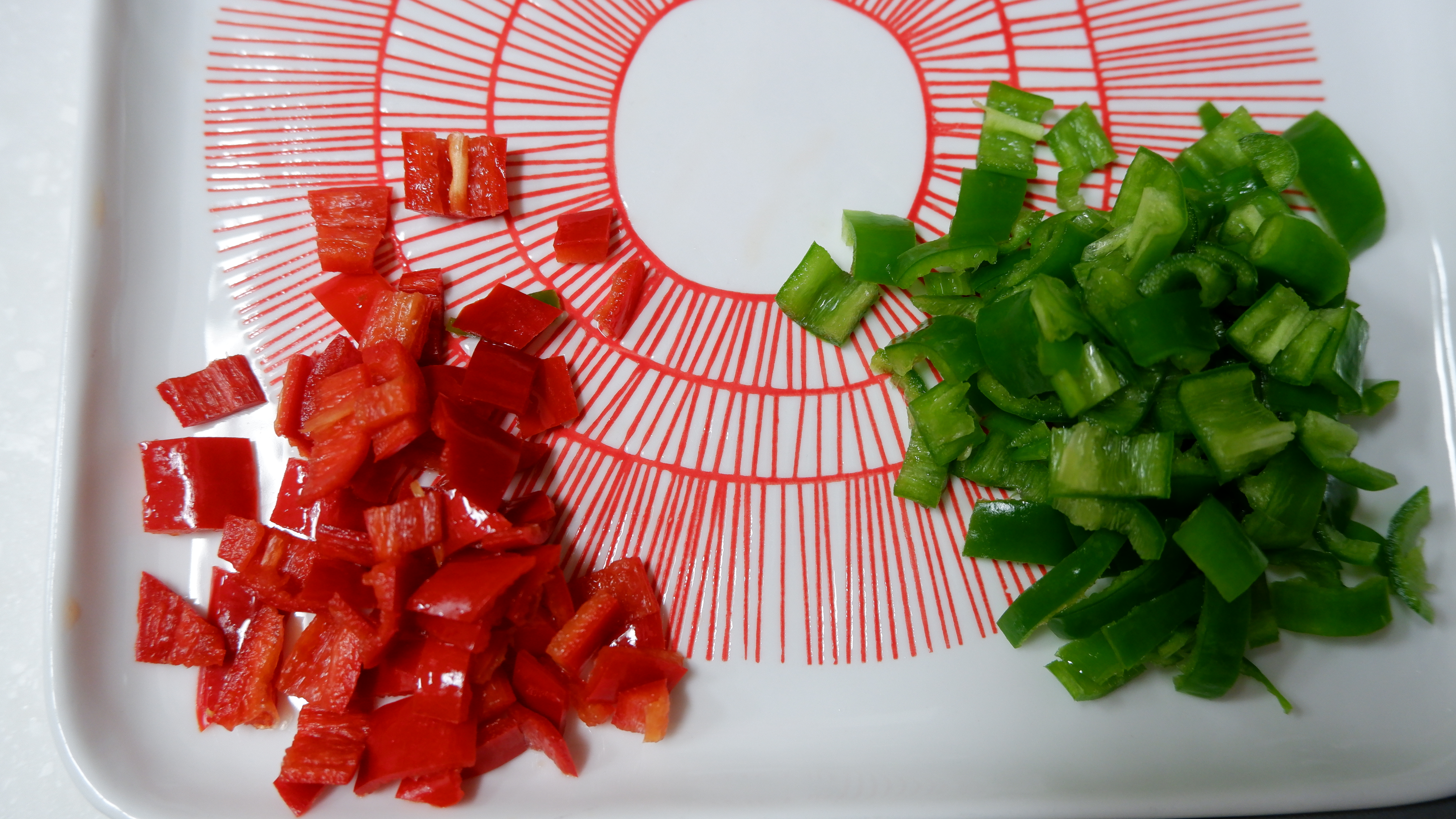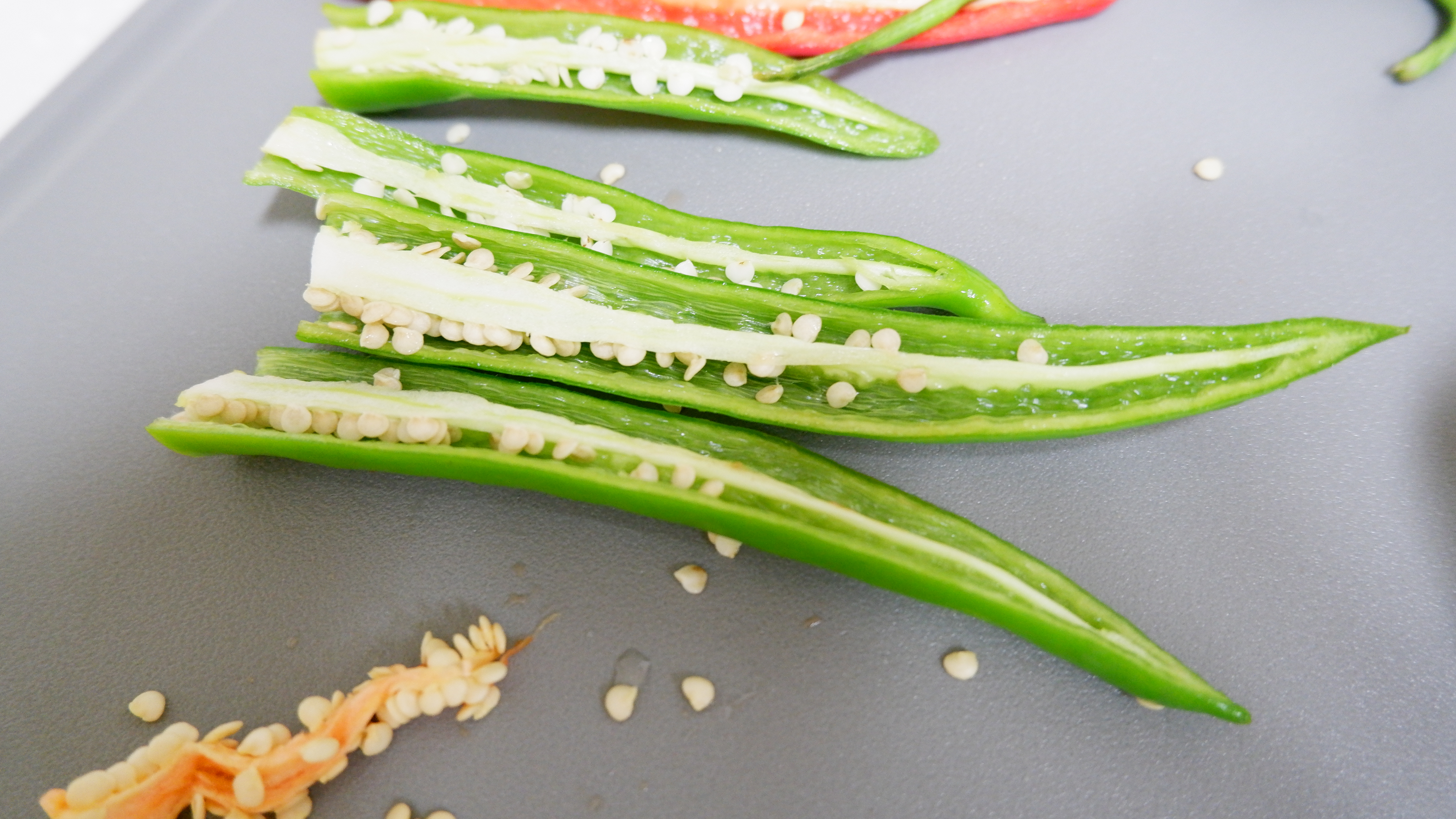 1. 먼저 풋고추 2개와 홍고추 1개를 깨끗이 씻어 준 후 윗부분은 잘라내주고 반으로 갈라 씨를 제거해줍니다.(씨는 숟가락을 사용하면 쉽게 제거할 수 있어요!) 씨를 제거한 후 다시 반을 잘라 잘게 썰어 주세요!
