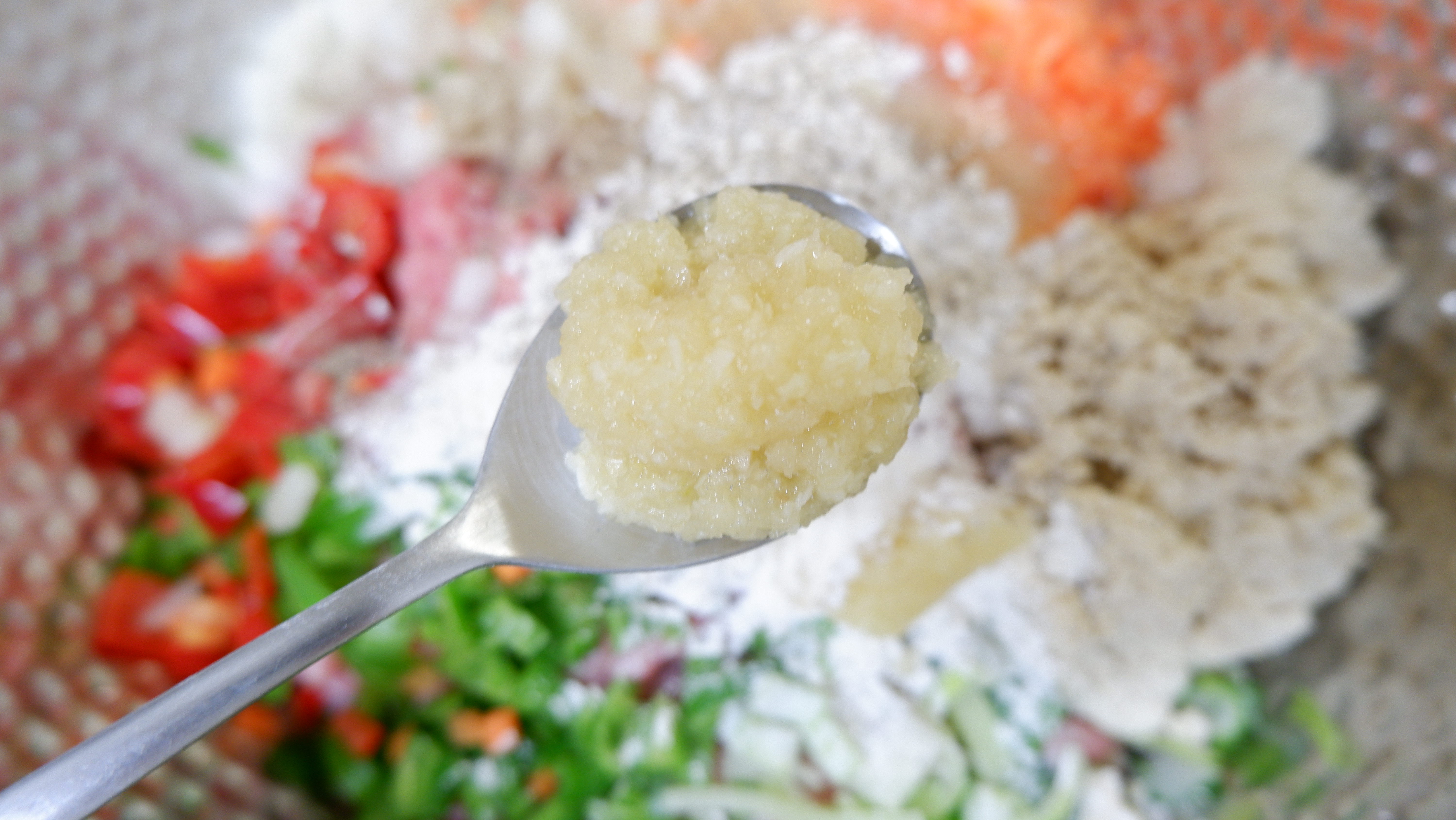 8. 그다음 계란 1개 , 부침가루 2큰술 , 간 마늘 1큰술 , 소금 반 큰 술 , 후춧가루 1 티스푼을 넣어주고 골고루 섞어 주면서 잘 치대어 주면 끝!
