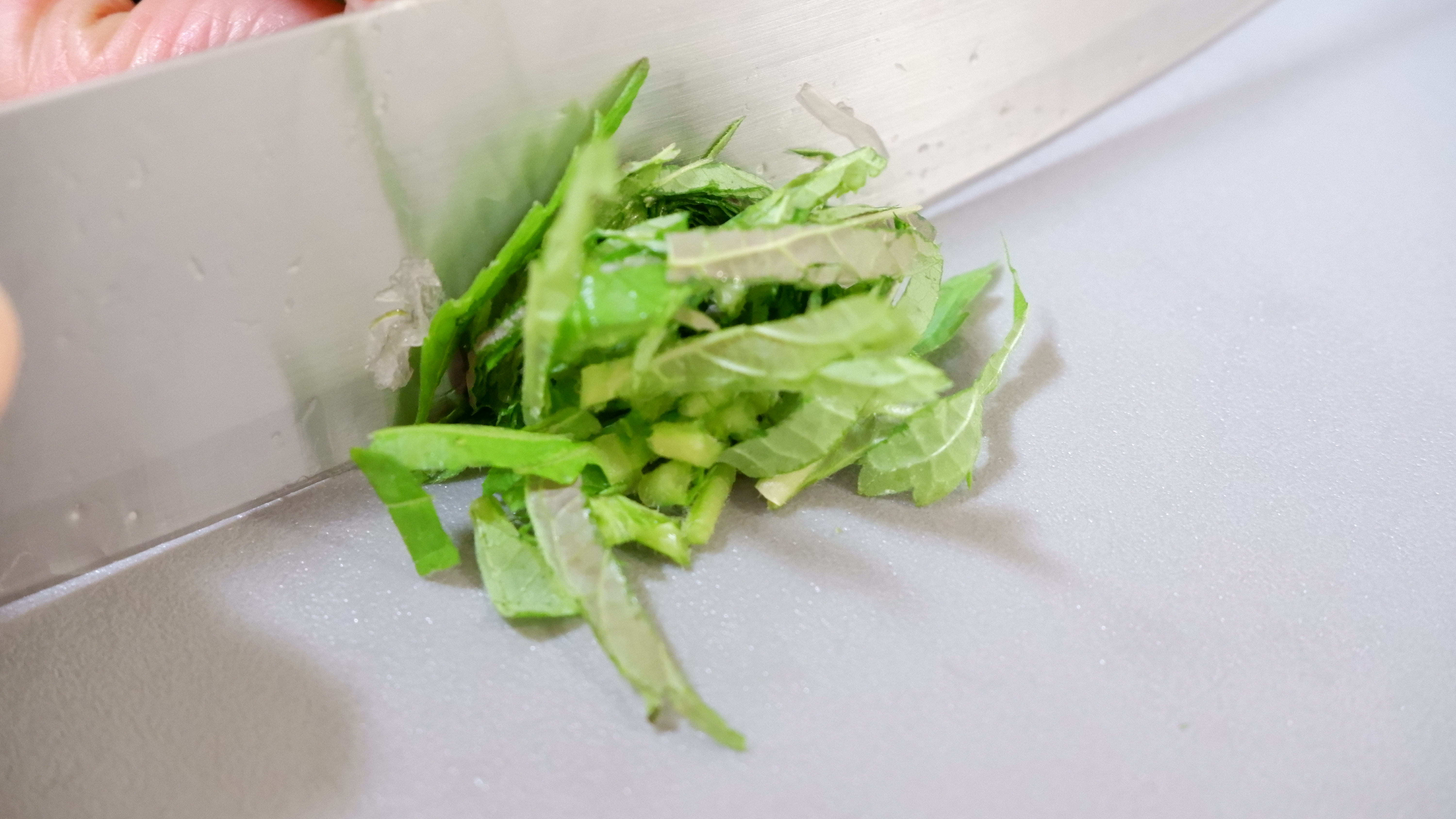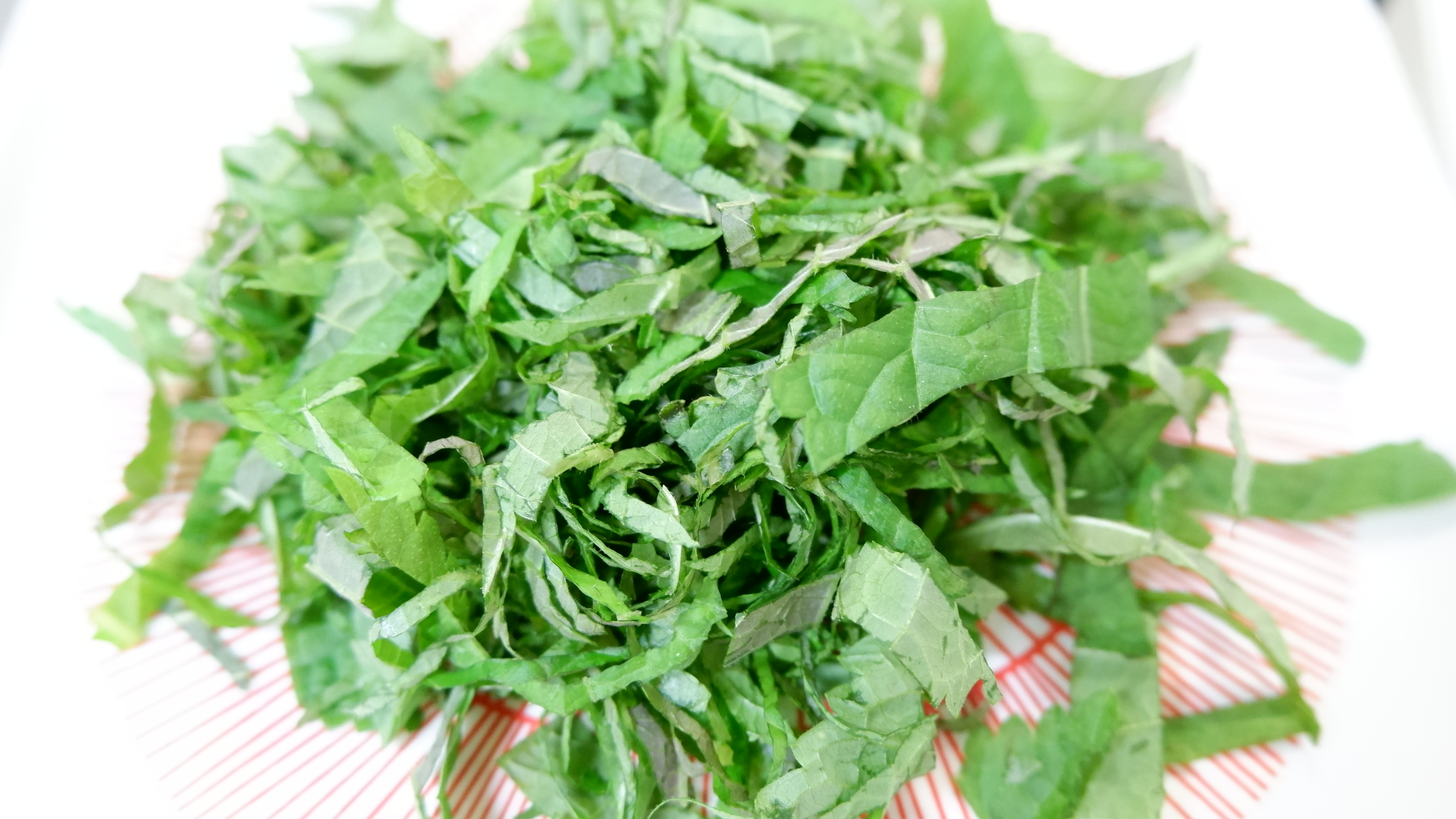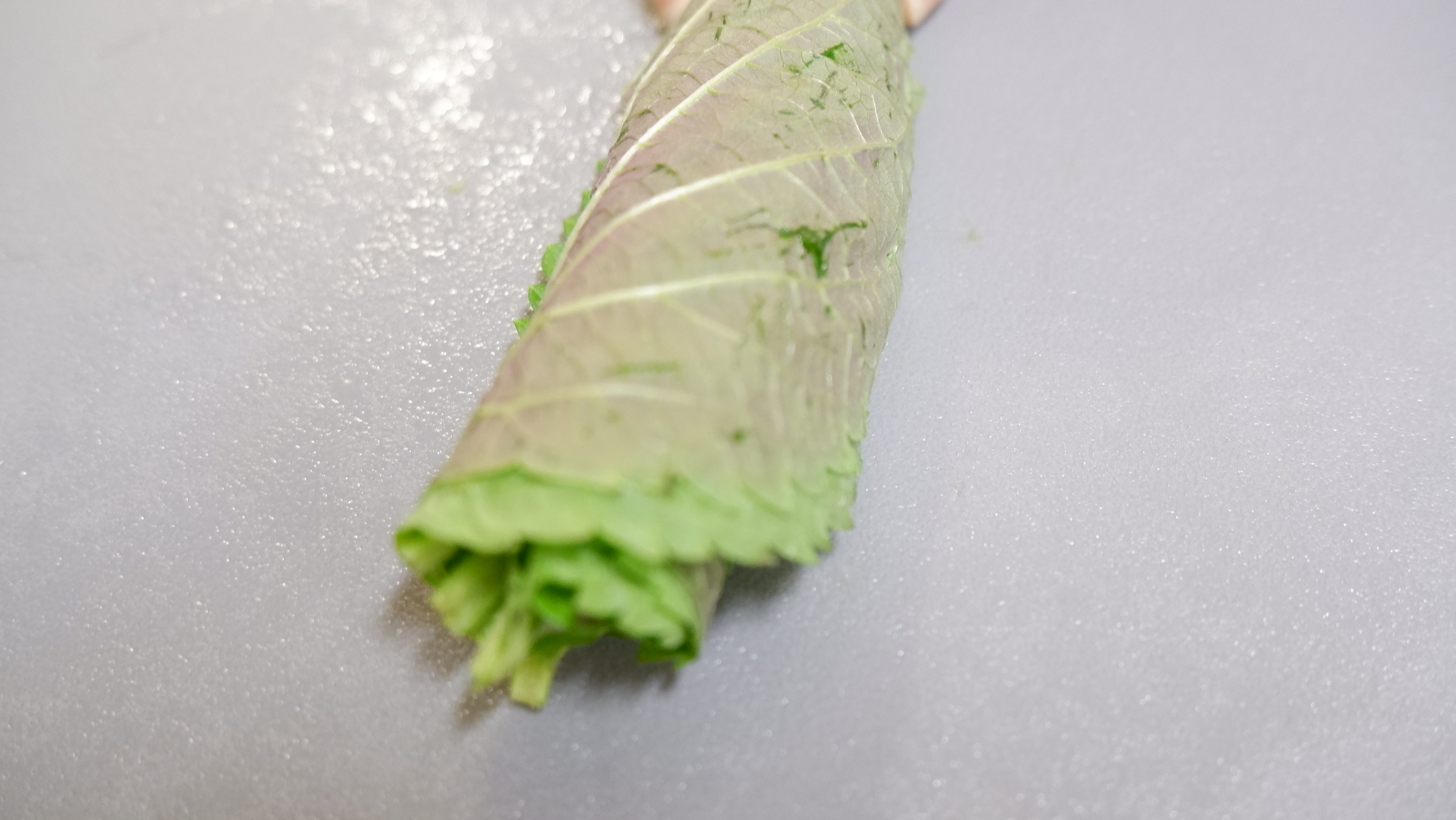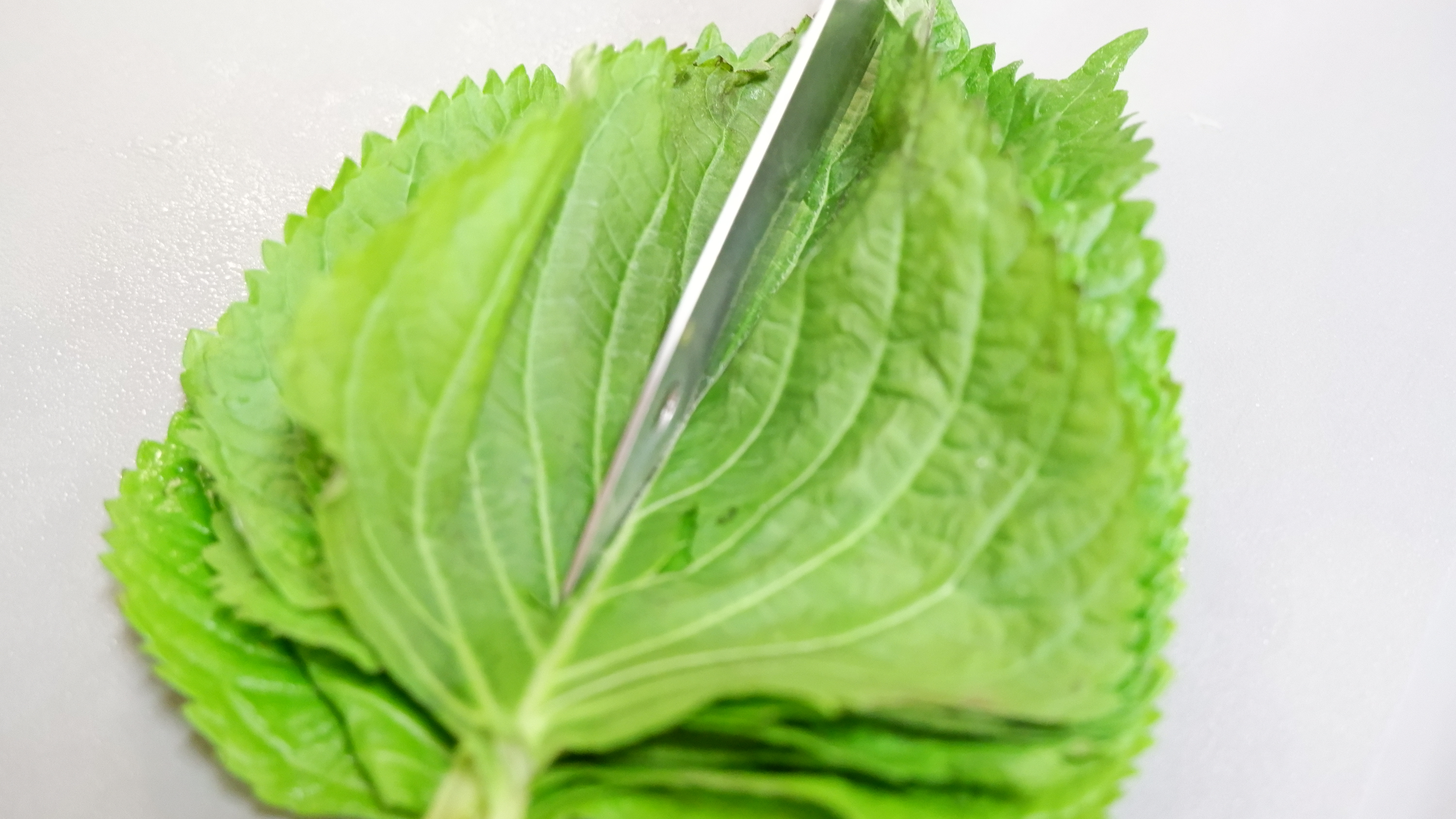 5. 깻잎은 흐르는 물에 씻어내고 물기를 잘 턴 후 반을 잘라 얇게 썰어 주세요!