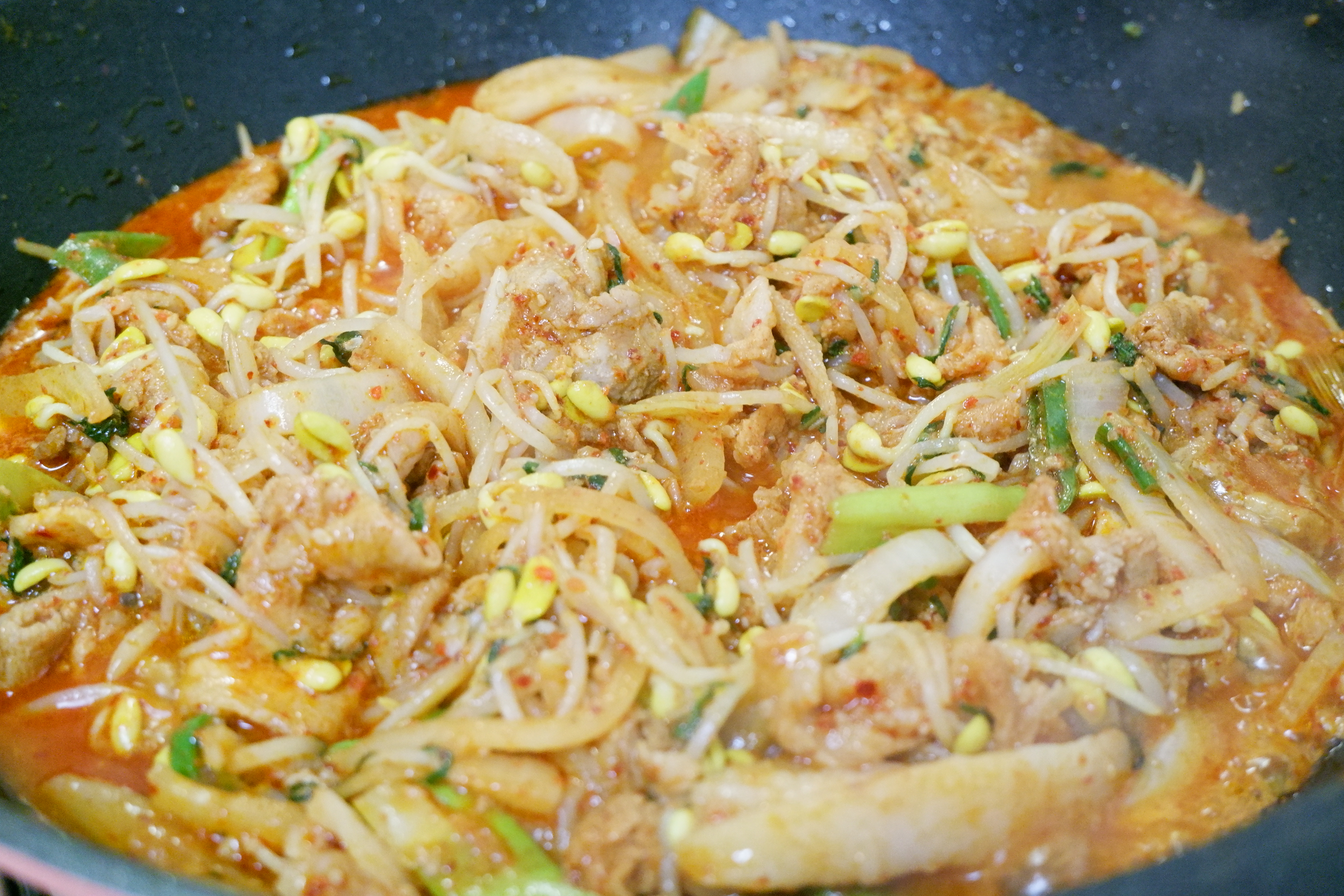8. 마지막으로 만들어둔 양념장을 부어주고 불은 중불보다 센 불에 맞춘 뒤 콩나물이 숨이 죽고 수분이 나올 때까지 기다립니다.