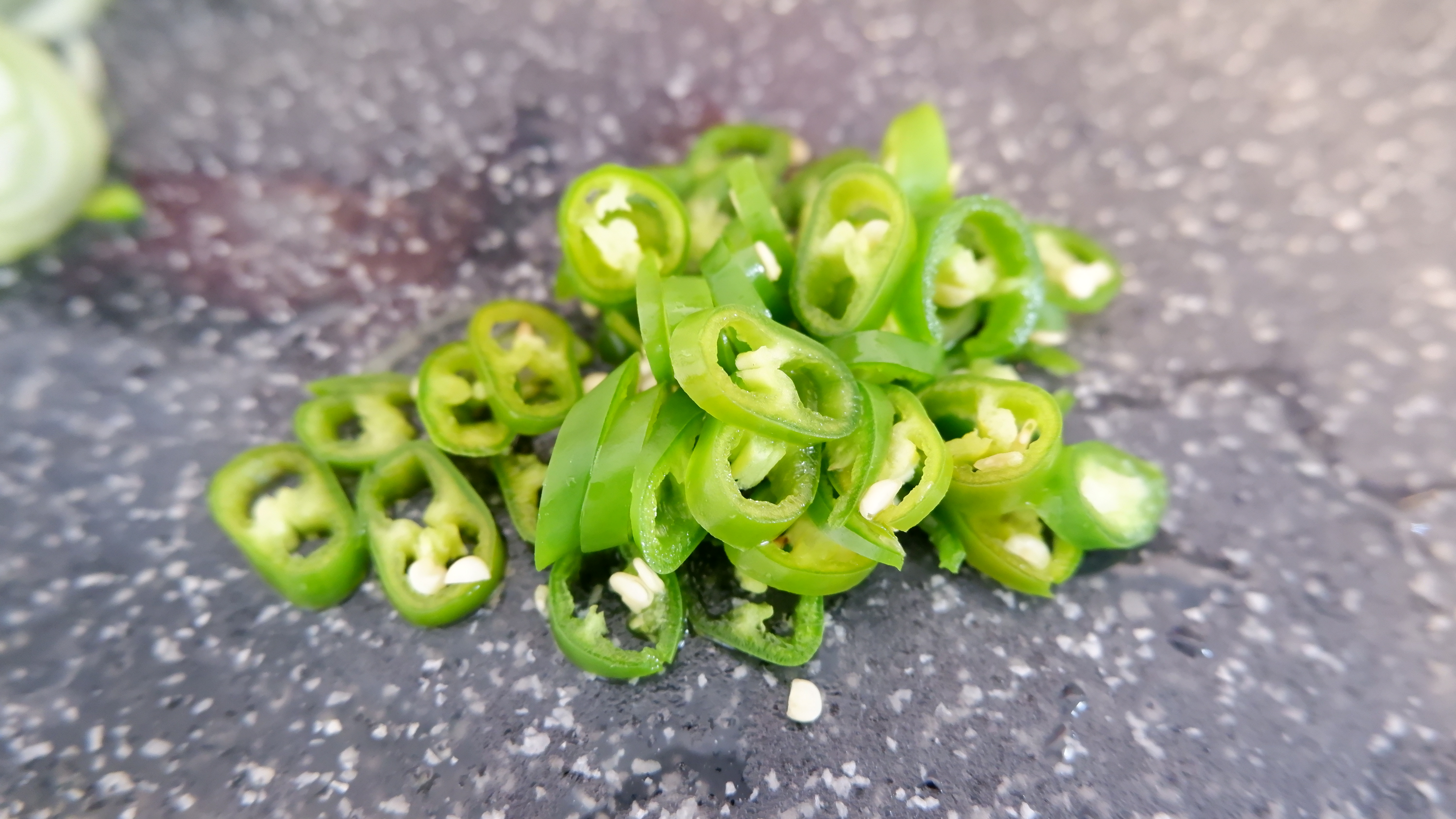 3. 칼칼한 맛을 더하기 위해 청양 고추 1~2개를 깨끗이 씻어 송송 썰어주세요~ ( 아이와 함께 먹는다면 청양고추는 생략해주셔도 됩니다.)