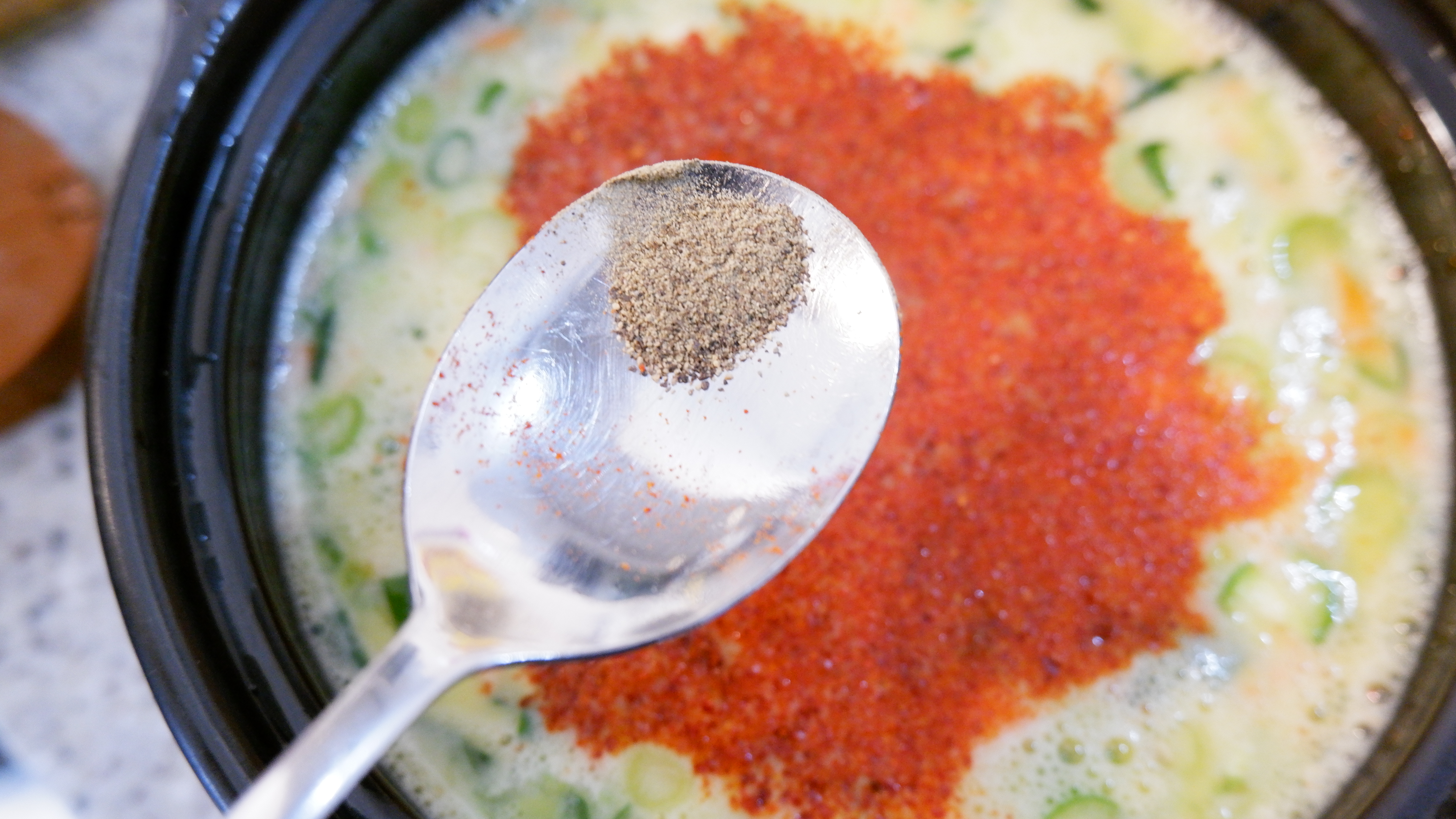 3. 그다음 고춧가루 1큰술 , 참기름 1큰술, 간장 1큰술 , 소금 반 큰 술 , 후춧가루 약간 넣고 다시 한번 저어줍니다.