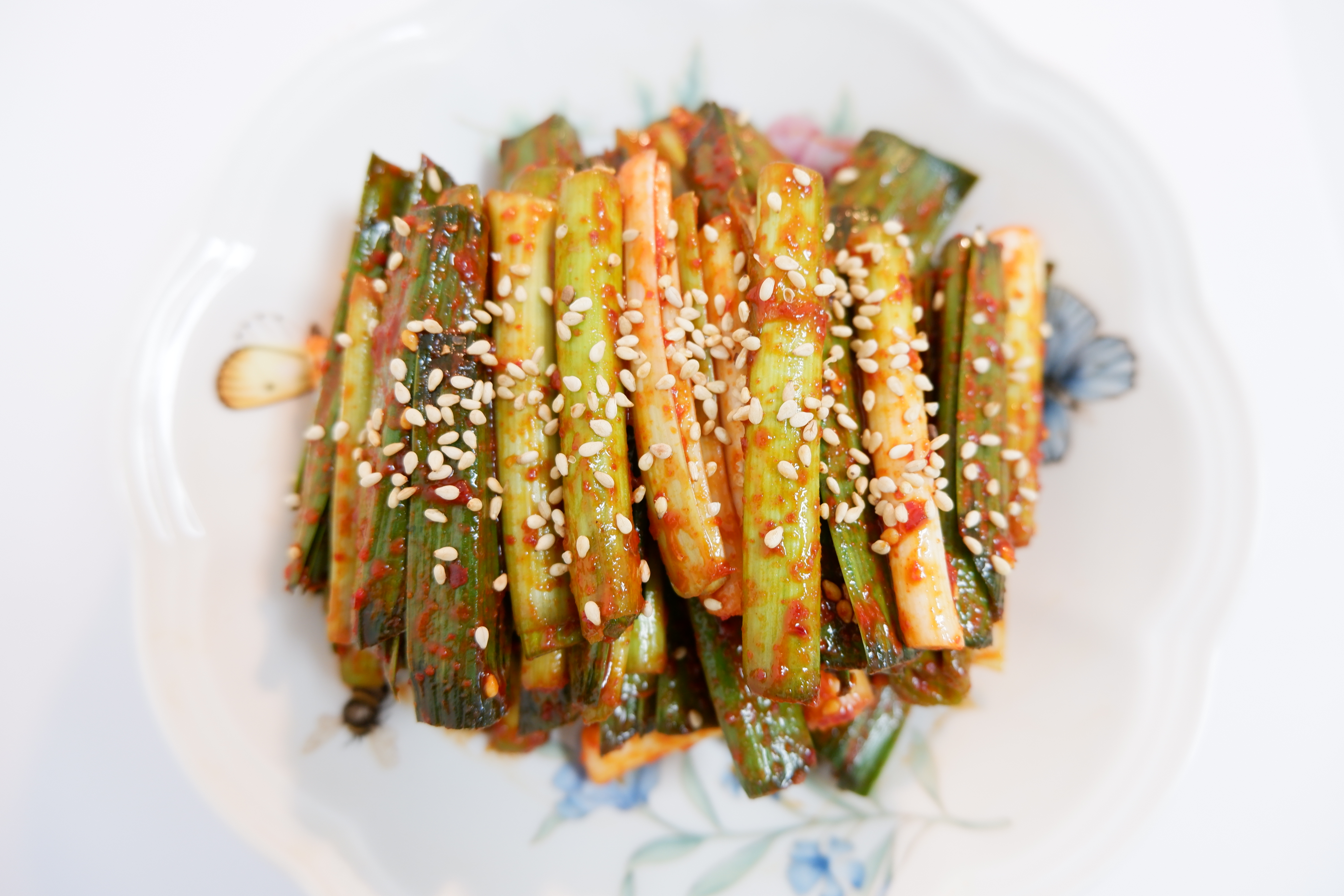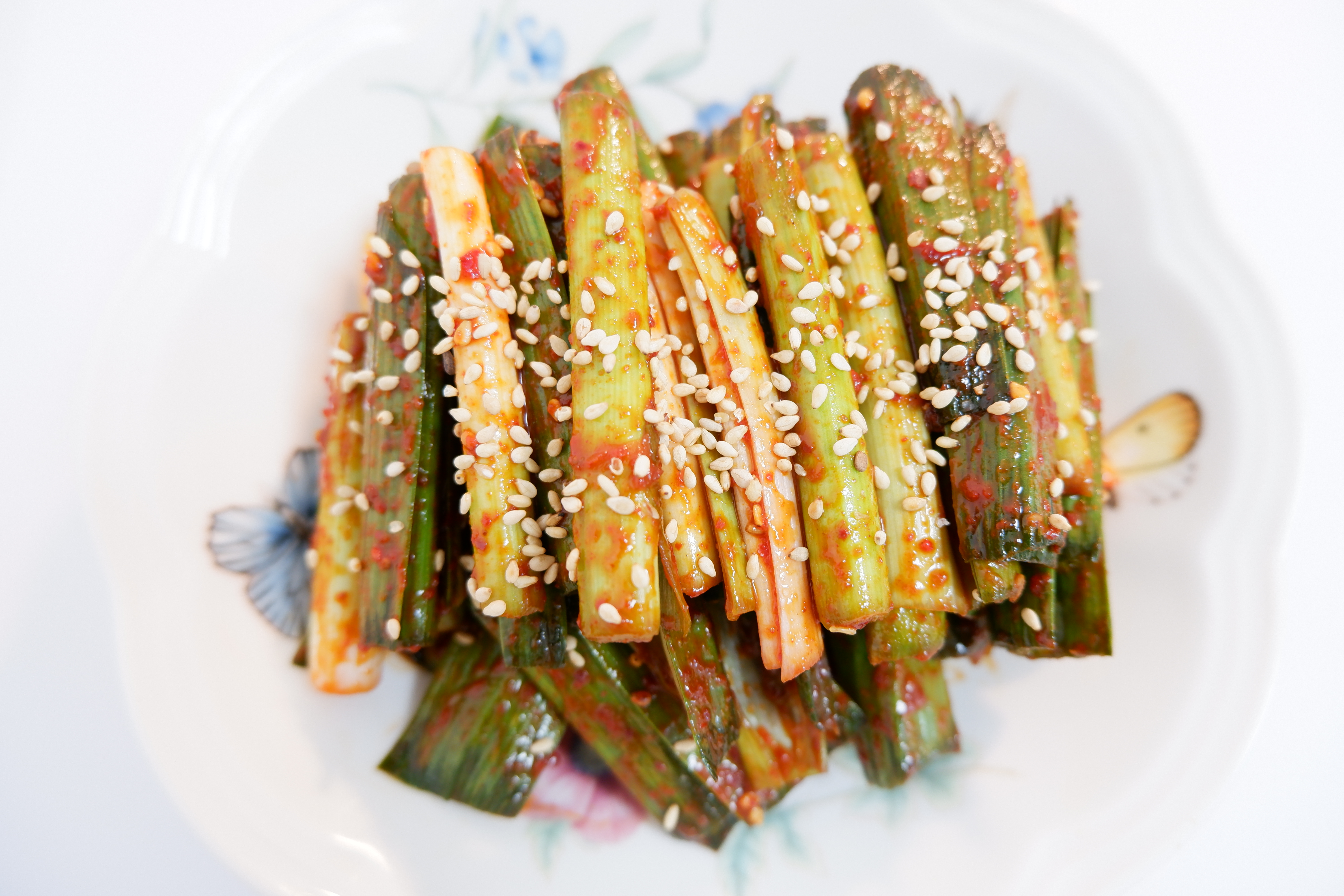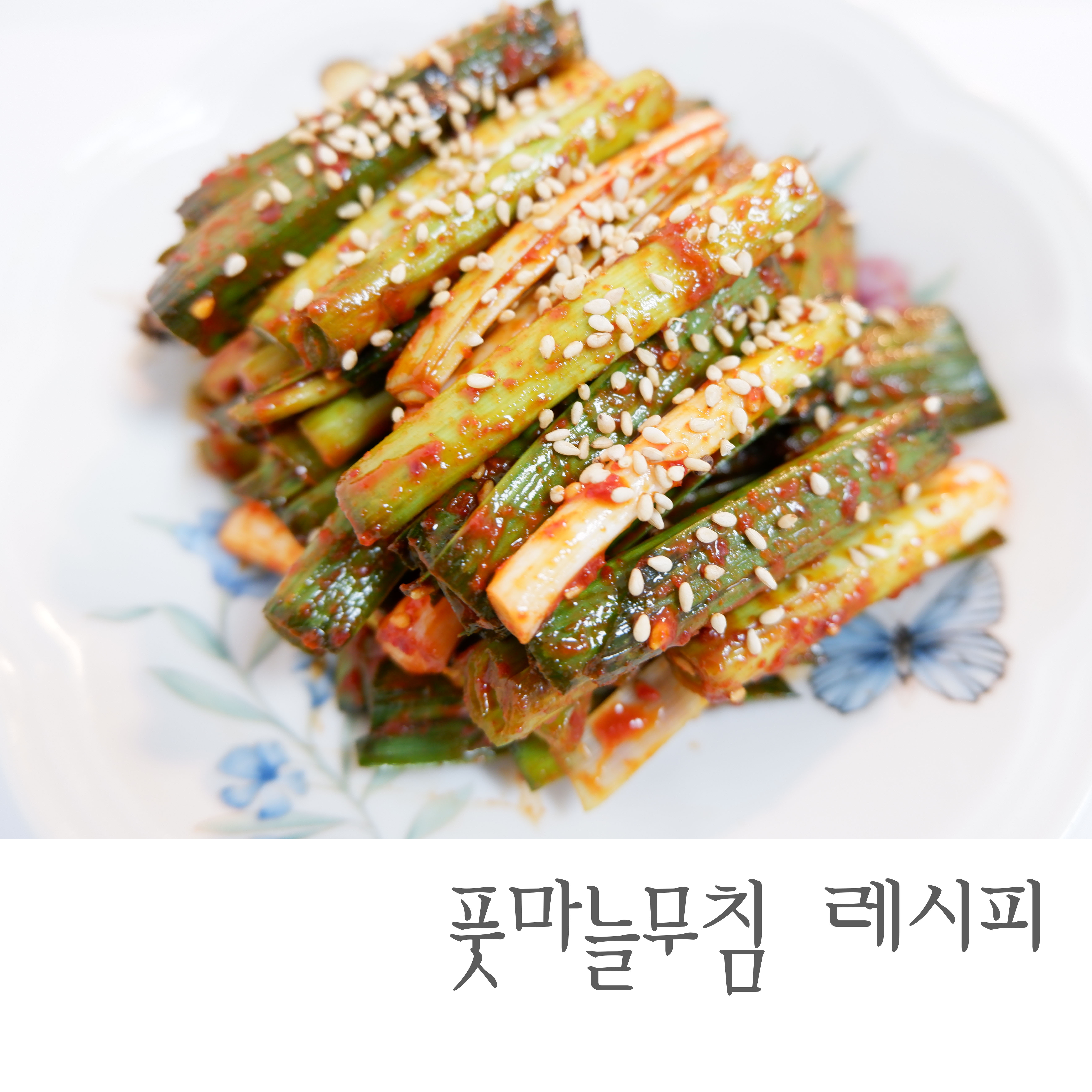 자! 이렇게 맛있게 무쳐진 풋마늘 무침을 접시에 먹기 좋게 담고 통깨 솔솔 뿌려주면 끝!