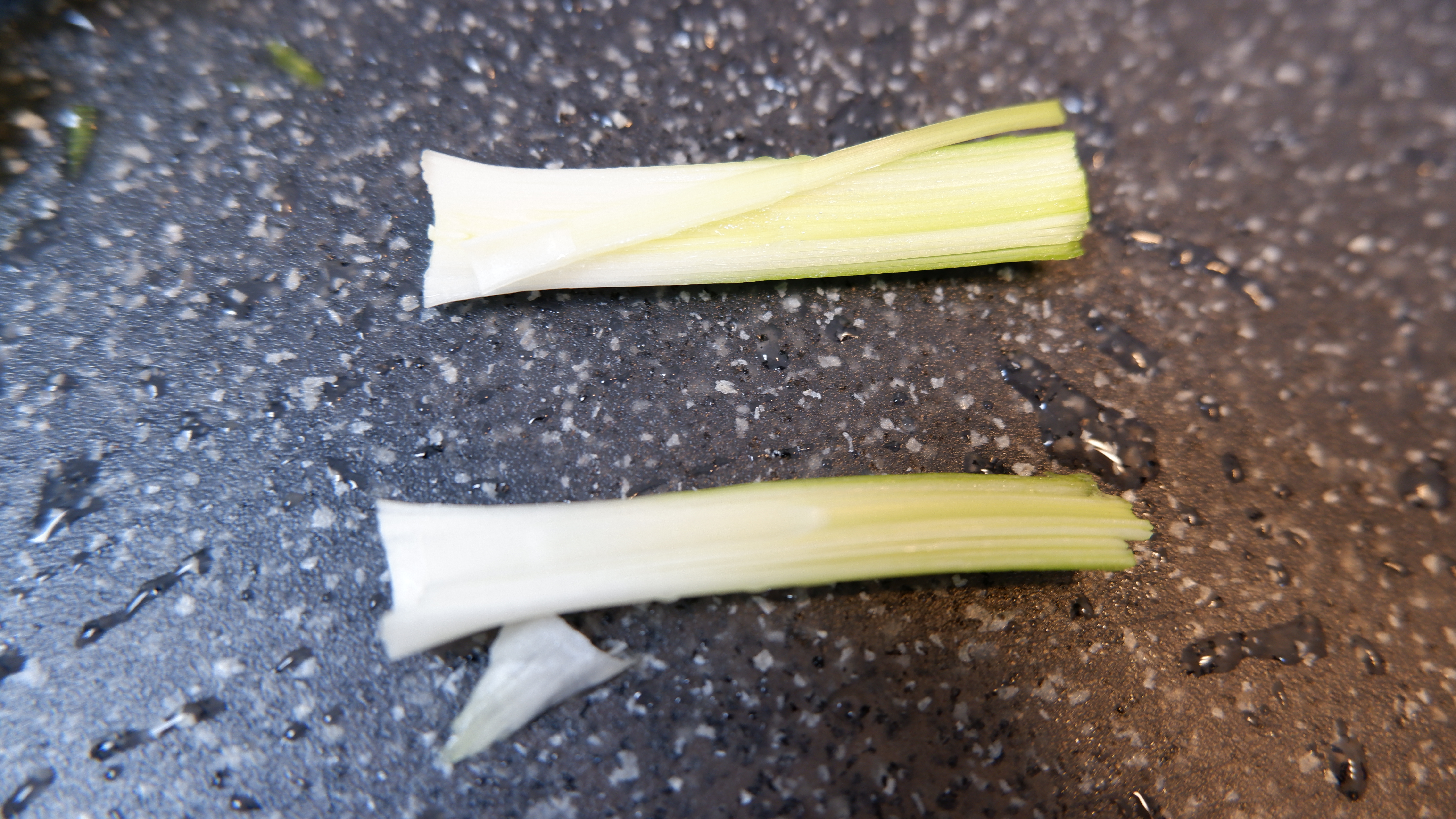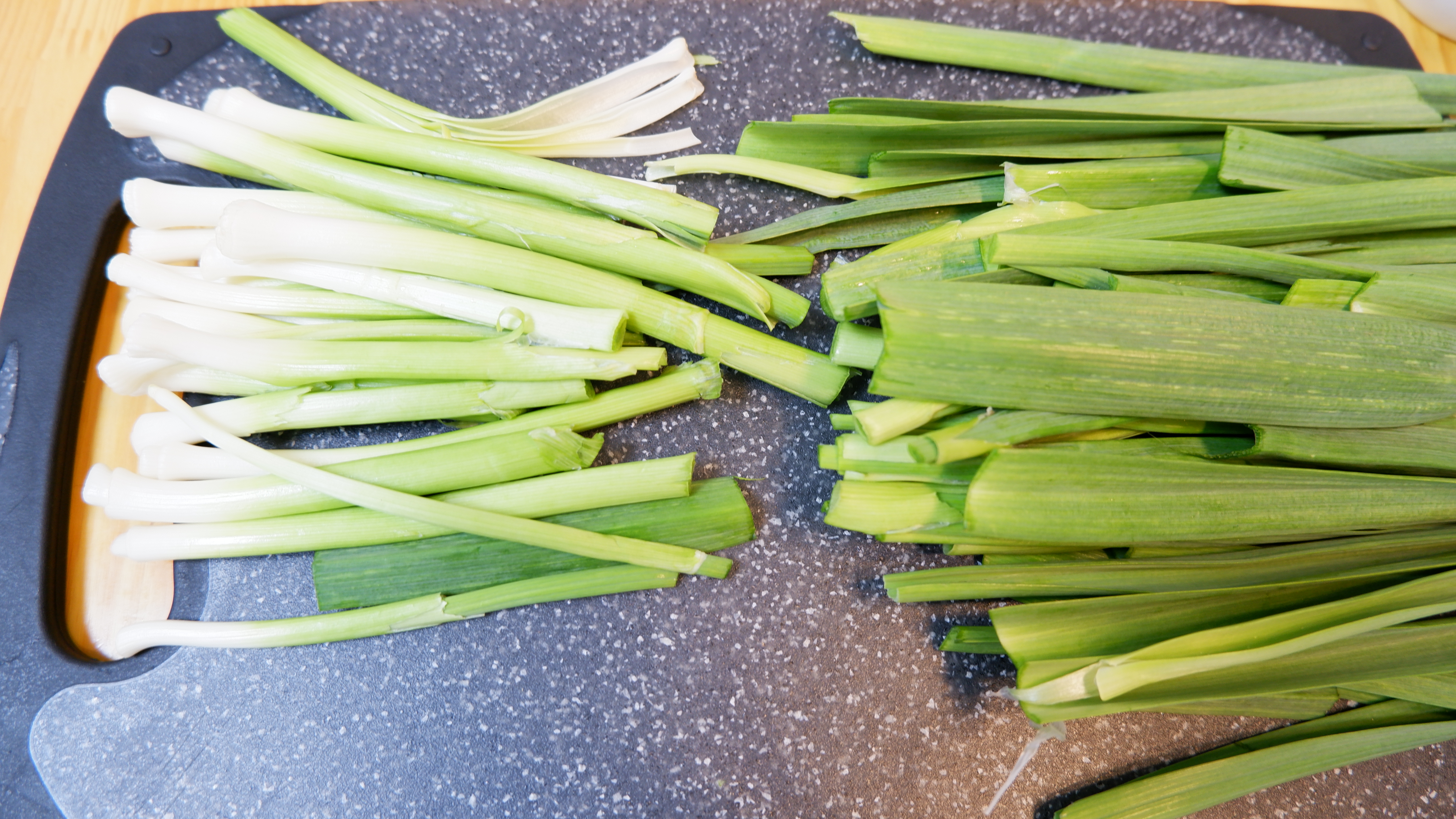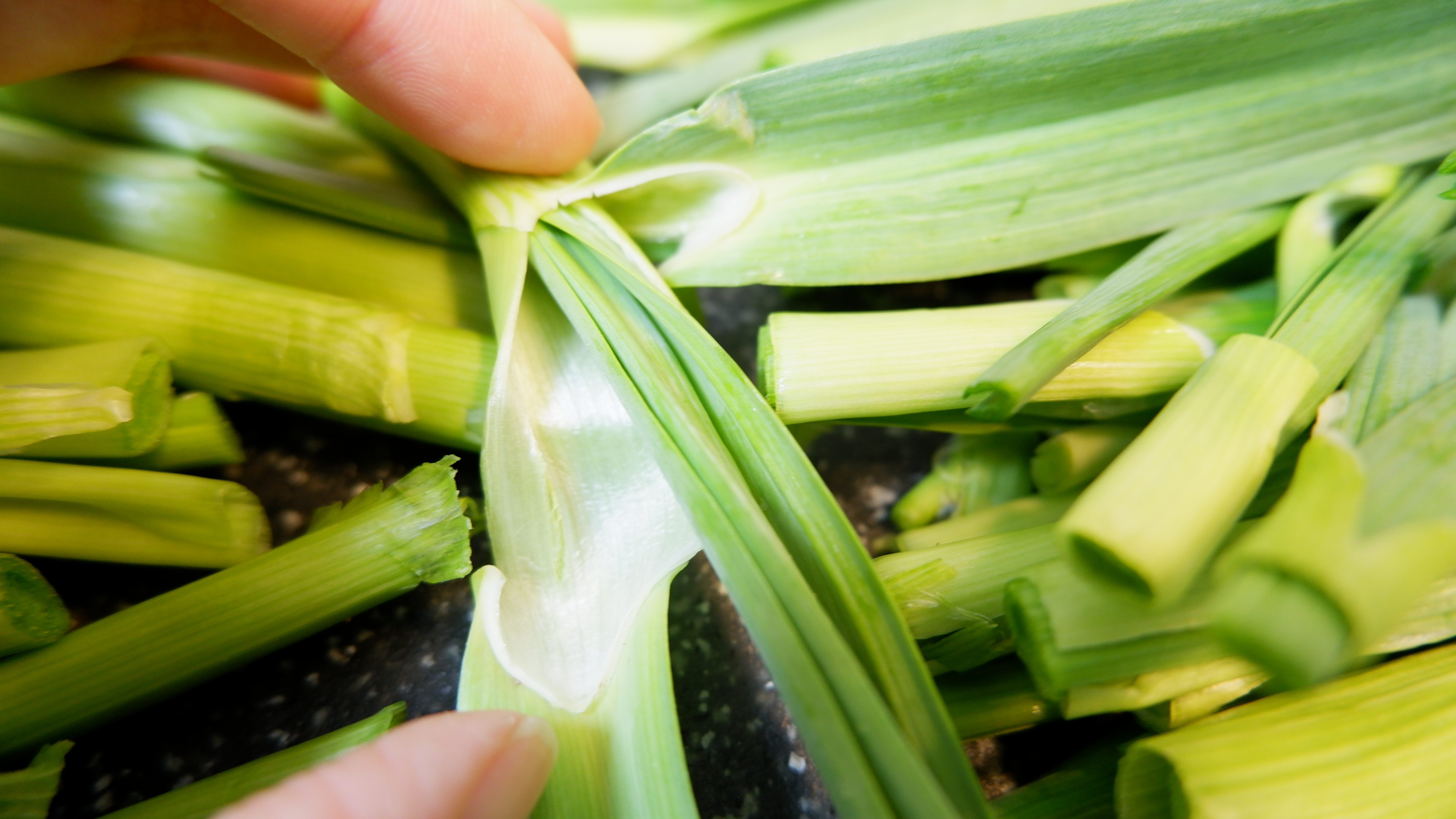 3. 구석구석 흙이 많은 풋마늘을 수월하게 씻기 위해 반을 썰어 줄기 따로 잎 따로 씻어 줍니다.