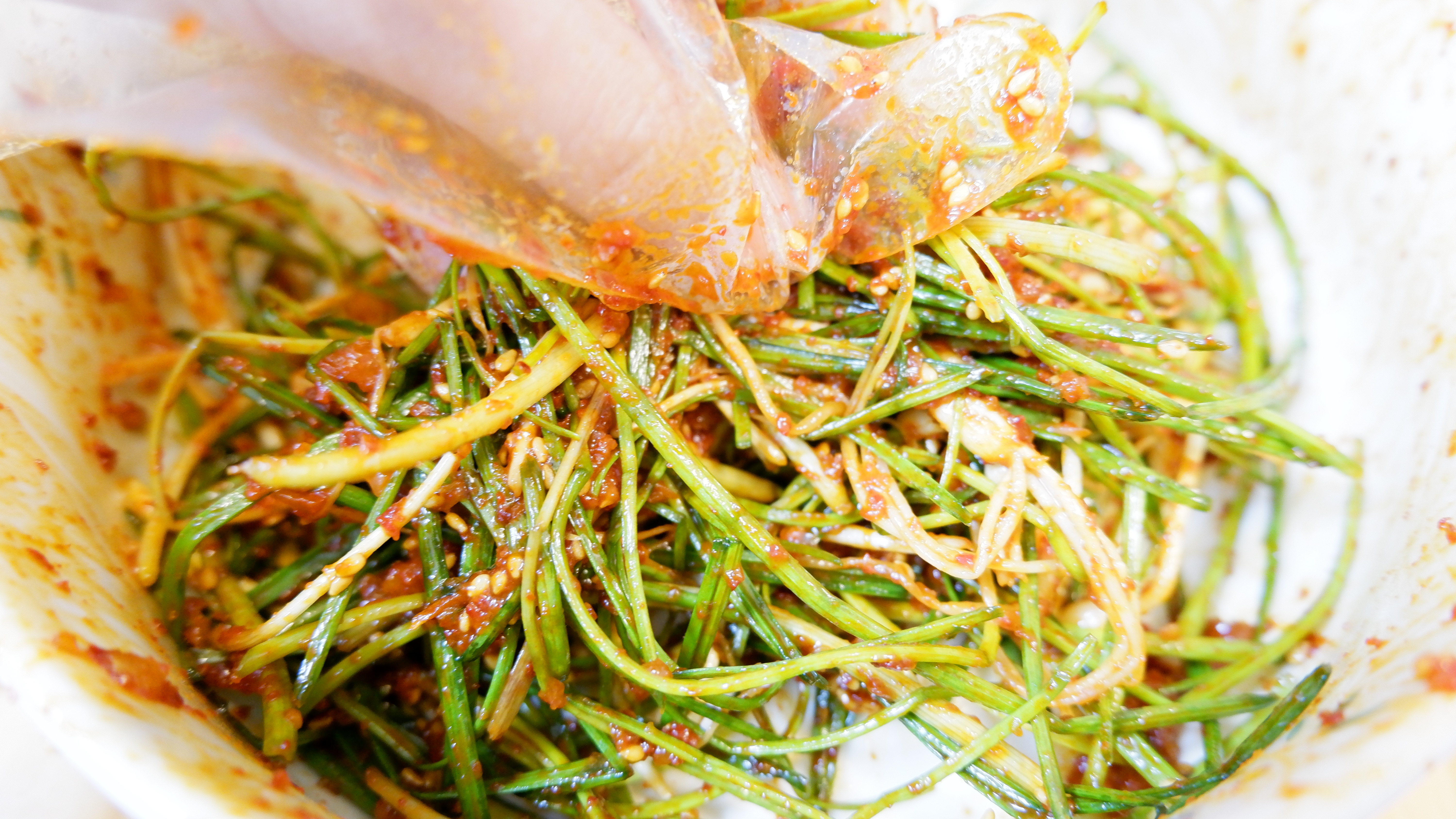 5. 믹스 볼에 달래와 양념장을 넣고 설렁설렁 뒤적거리며 맛있게 무쳐줍니다.