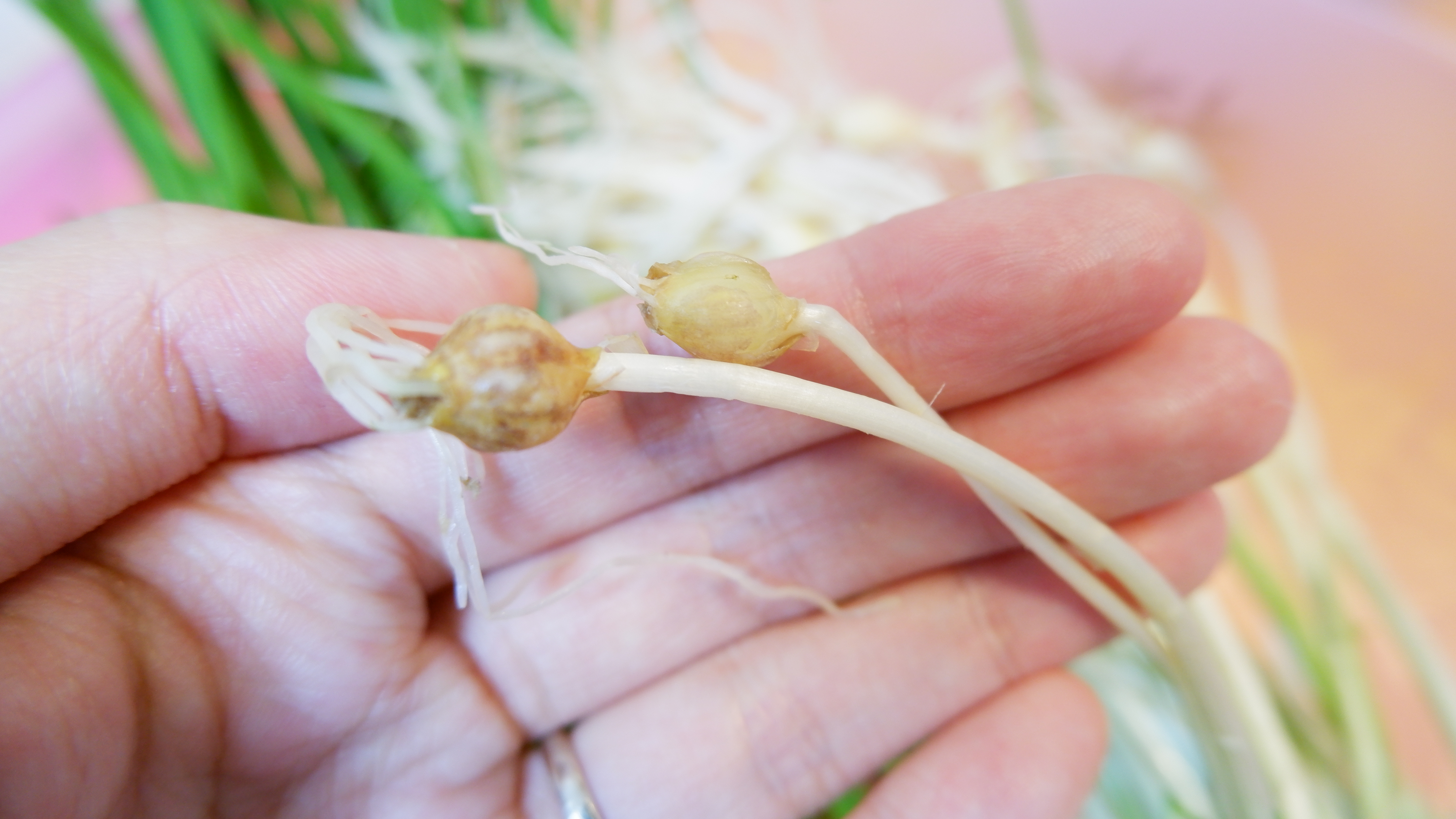 2. 달래를 손질할 차례인데 달래 손질하는 방법은 달래 알뿌리 부분 껍질을 제거해야 해야 하는데 껍질을 쉽게 벗기기 위해선 뿌리 부분만 물에 약 5분간 담가 두면 껍질이 불어 쉽게 벗겨낼 수 있어요~! 뿌리 부분에 검은 게 붙어 있다면 손톱으로 떼어내주세요!