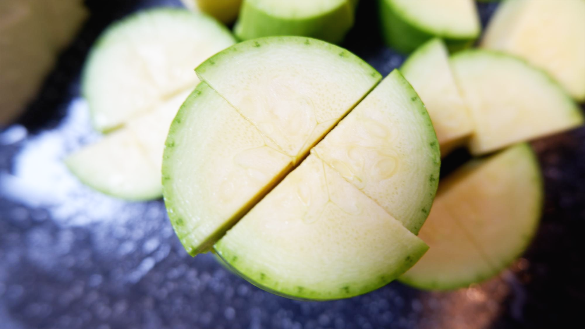 2. 두부 한모는 흐르는 물에 씻어내고 너무 크지 않게 썰어주고 호박 (작은 사이즈) 한 개도 흐르는 물에 씻어준 후 4 등분해서 썰어주세요~ 고추 한 개도 깨끗하게 씻어낸 후 송송 썰어 주고 팽이버섯도 손질해줍니다.