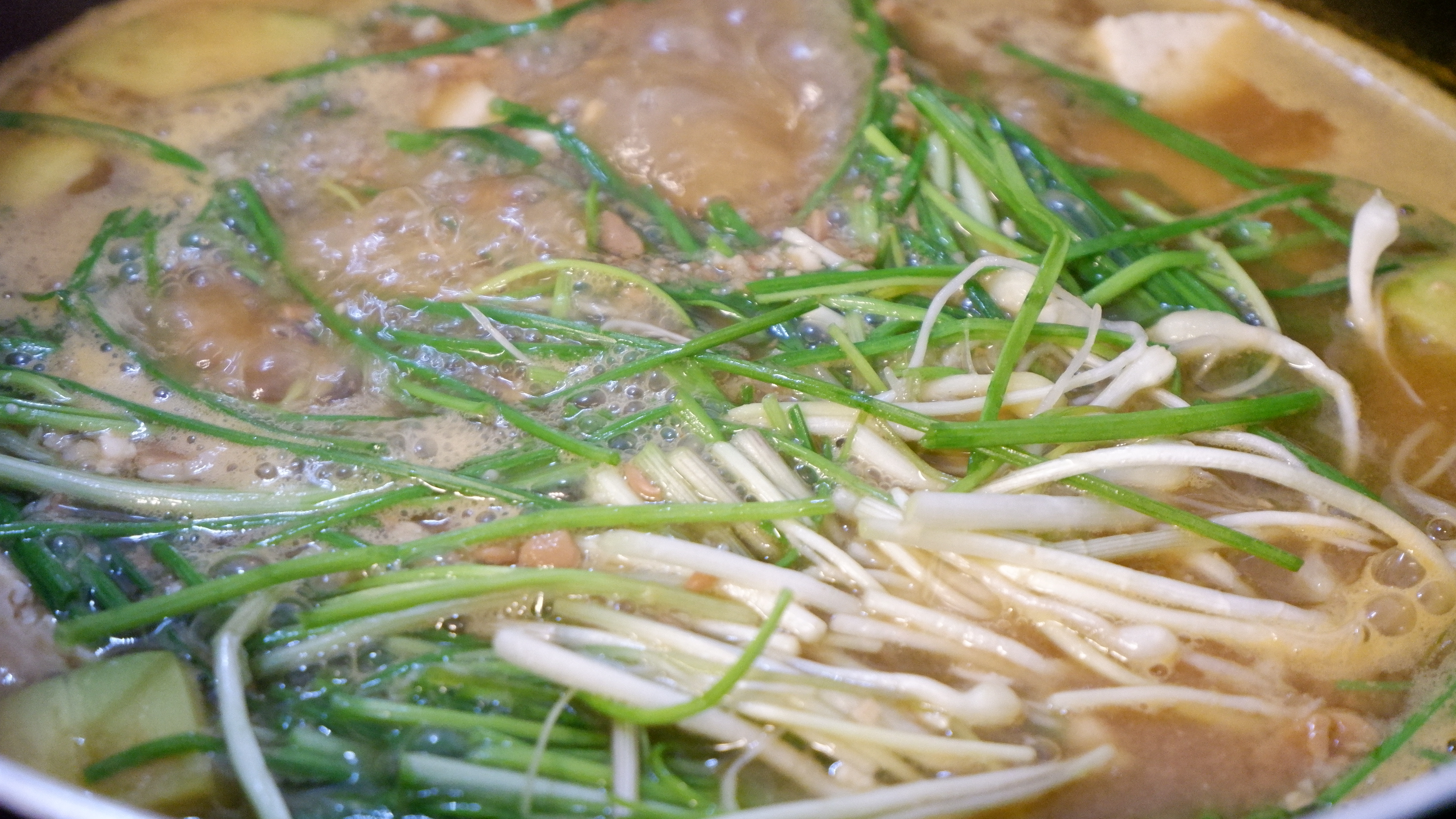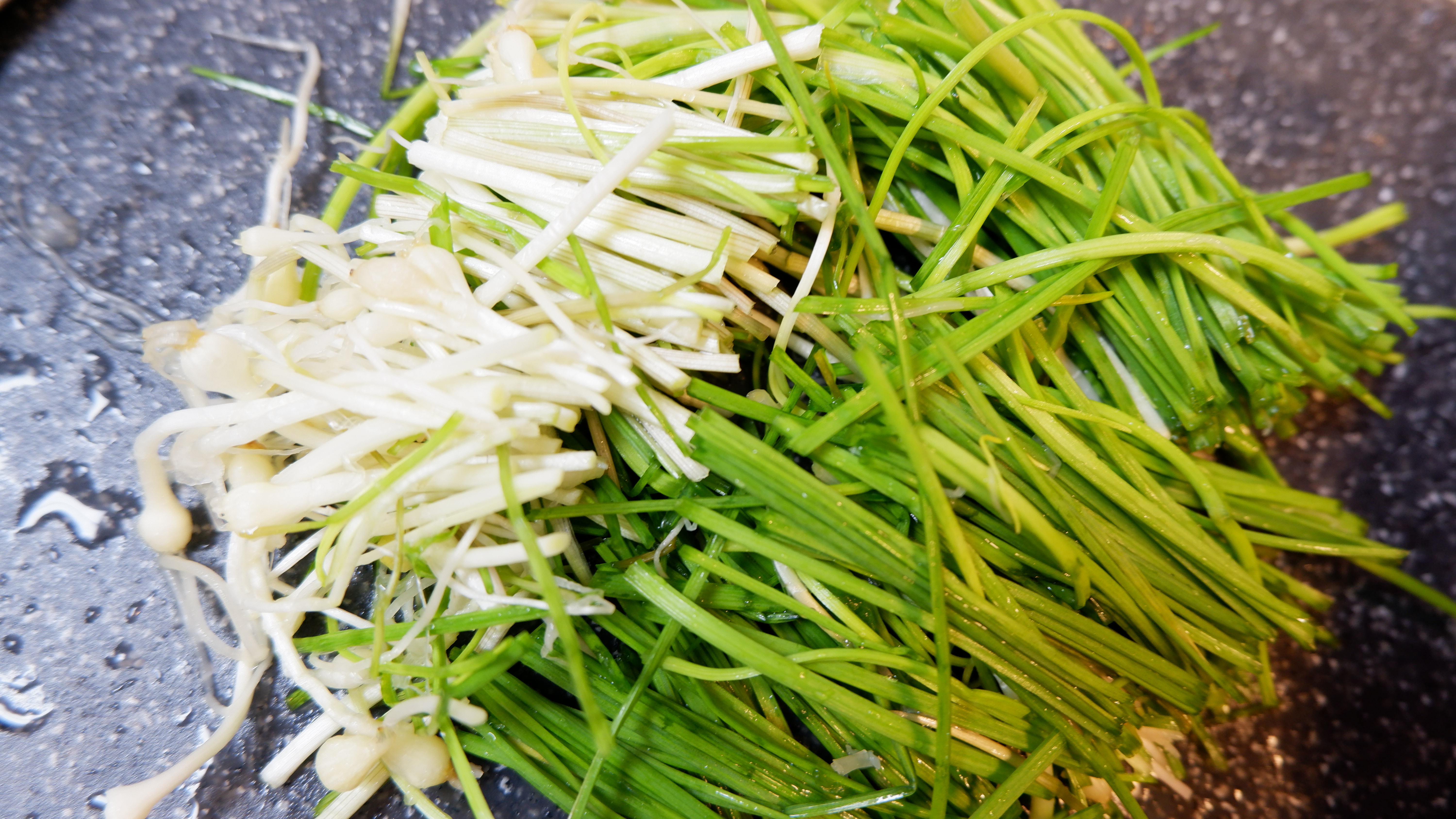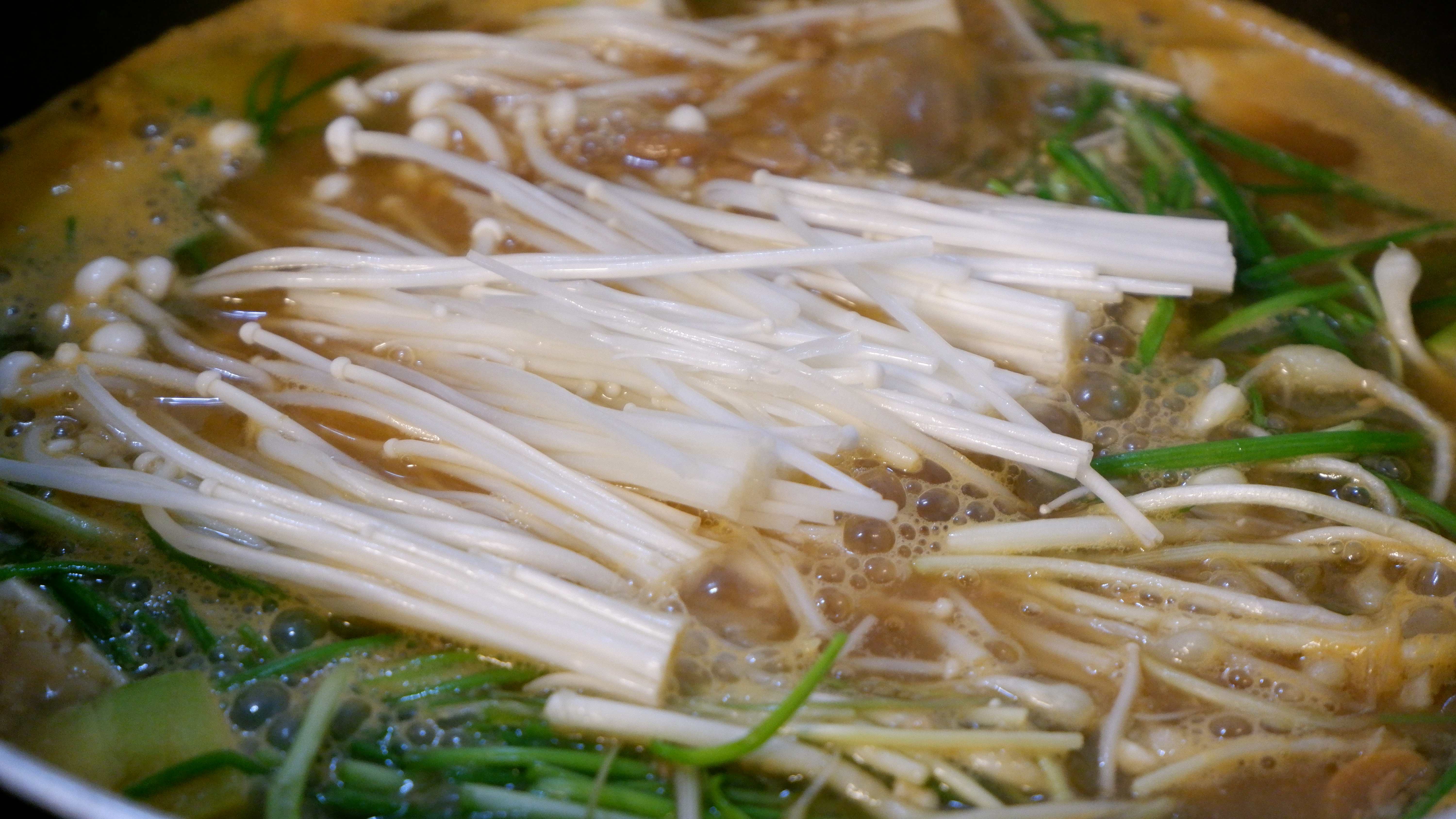 6. 호박이 잘 익어 간다면 달래와 팽이버섯을 넣어줍니다. ( 전 달래를 푹 익힌 것을 좋아하지만 달래의 식감이 살아 있는 걸 원하신다면 된장국을 끓이고 마지막에 달래를 올려 드시면 돼요!)
