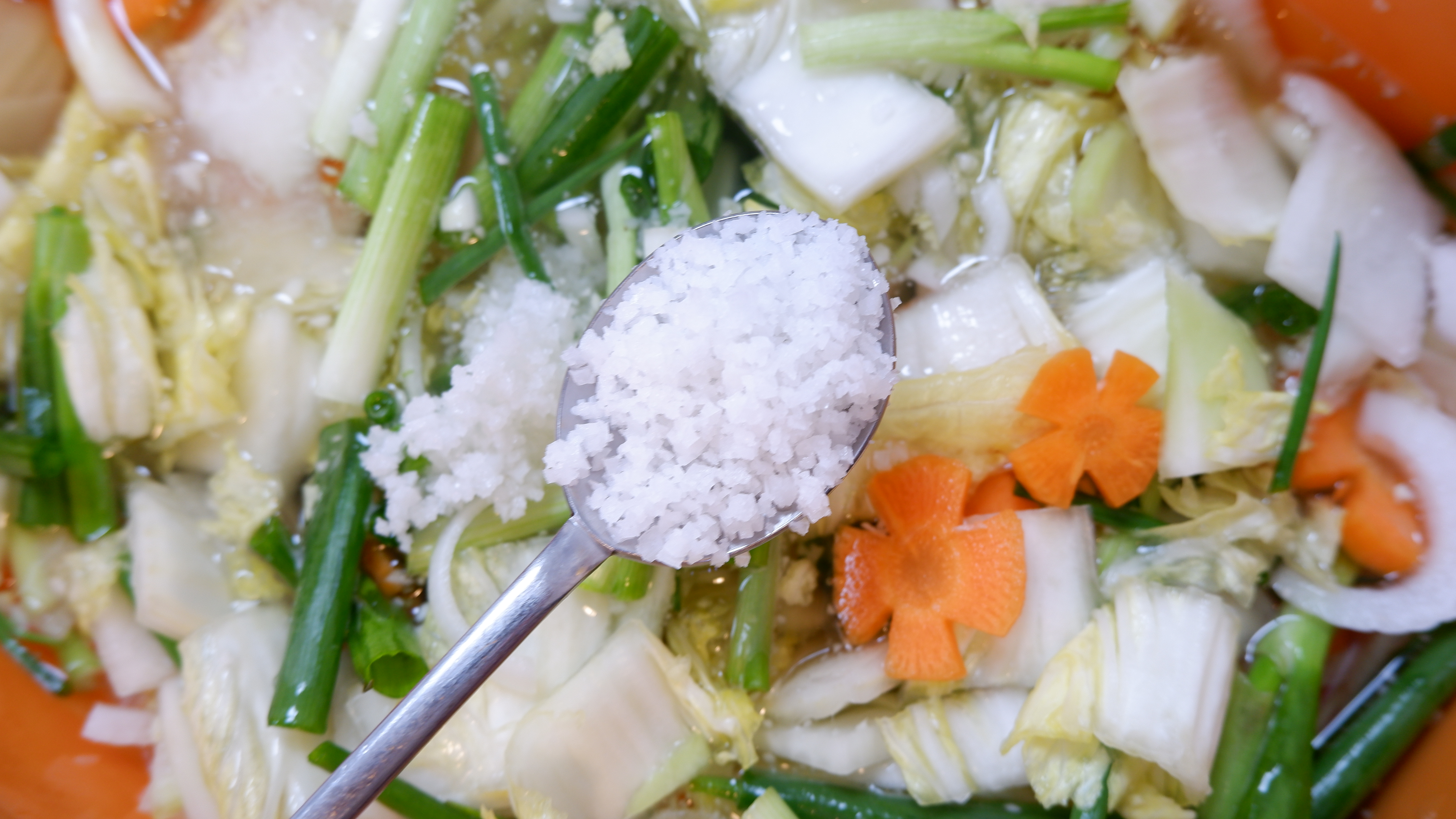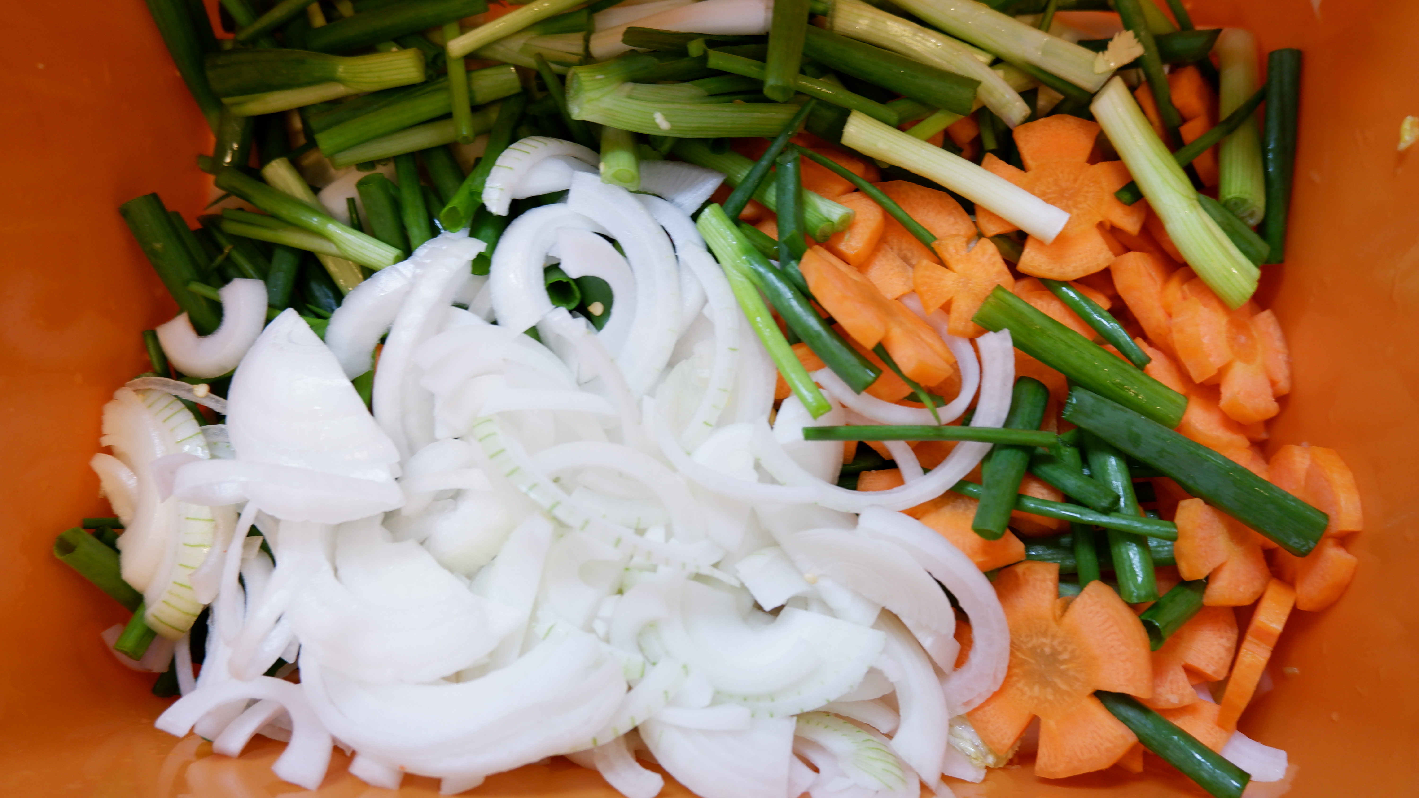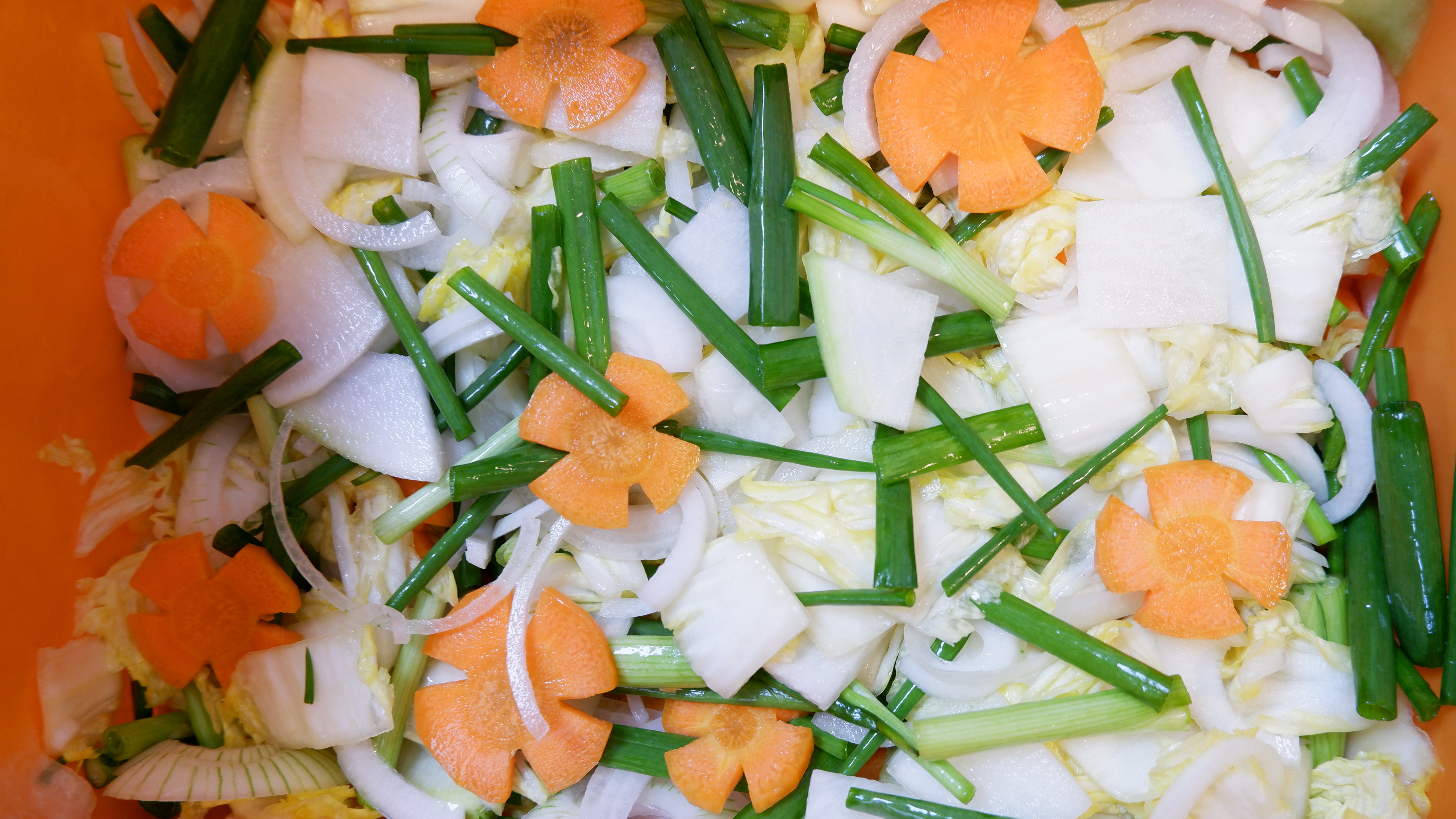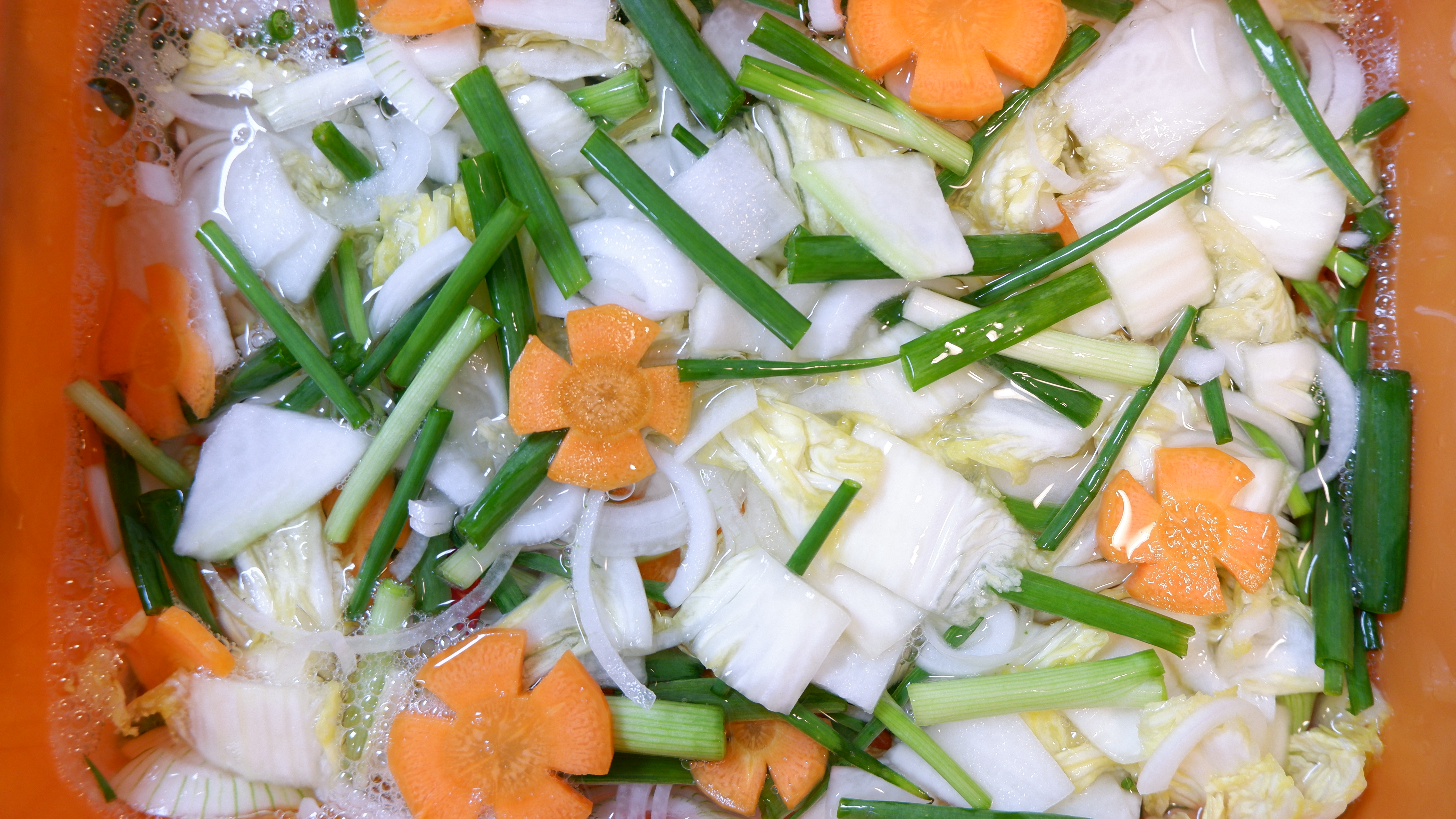 6. 배추와 무가 잘 절여졌으면 쪽파 , 당근 , 양파를 넣고 잘 섞어주세요~ 절이면서 생긴 물은 버리거나 씻어내시면 절대 안 돼요!
