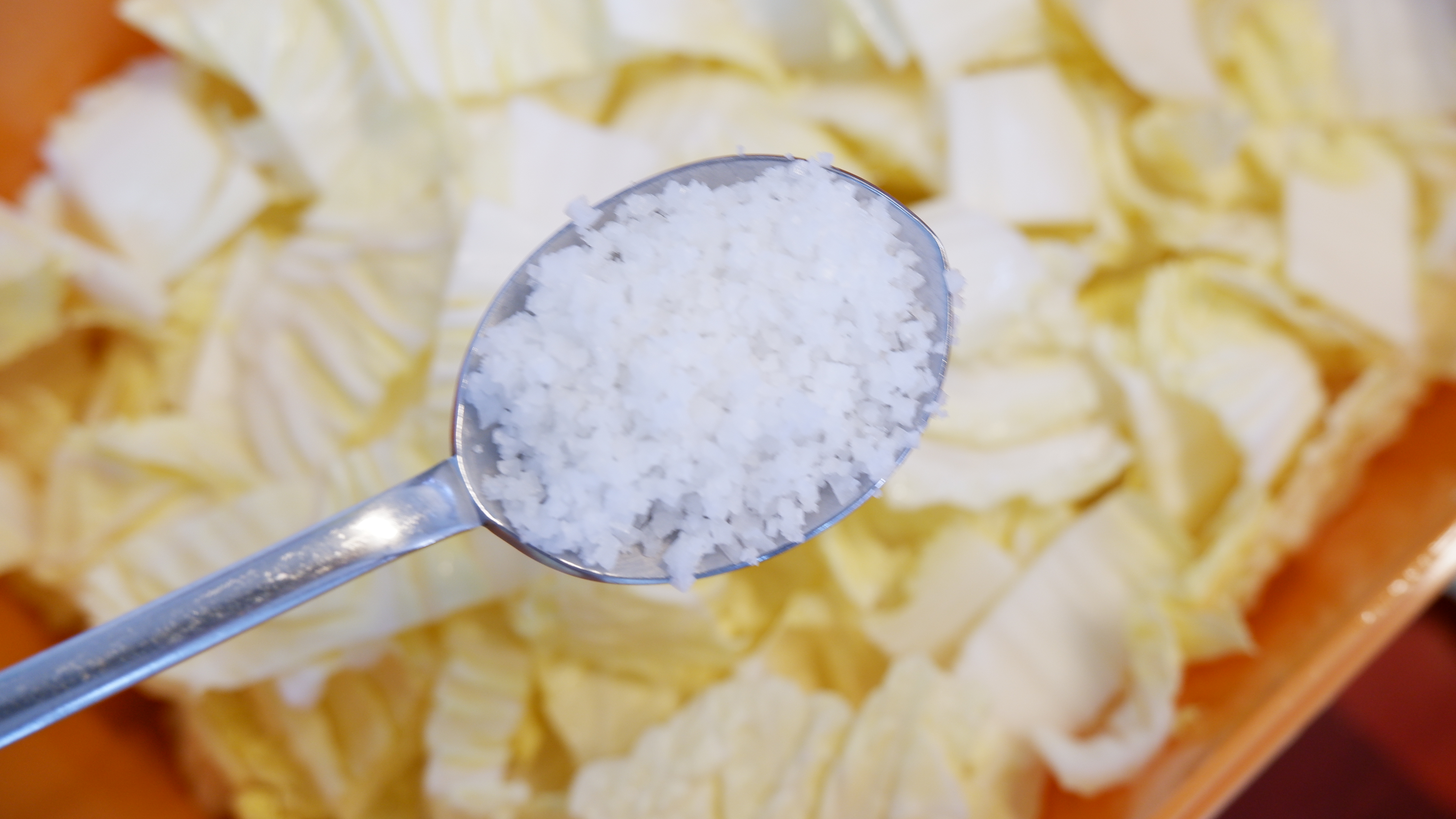 5. 모든 재료가 준비됐다면 배추와 무를 절일 차례인데 나박김치를 담을 용기에 배추와 무를 넣고 천일염 3큰술을 넣은 후 버무려주고 30분간 절여 줍니다. (전 용기 12L를 사용했어요!)
