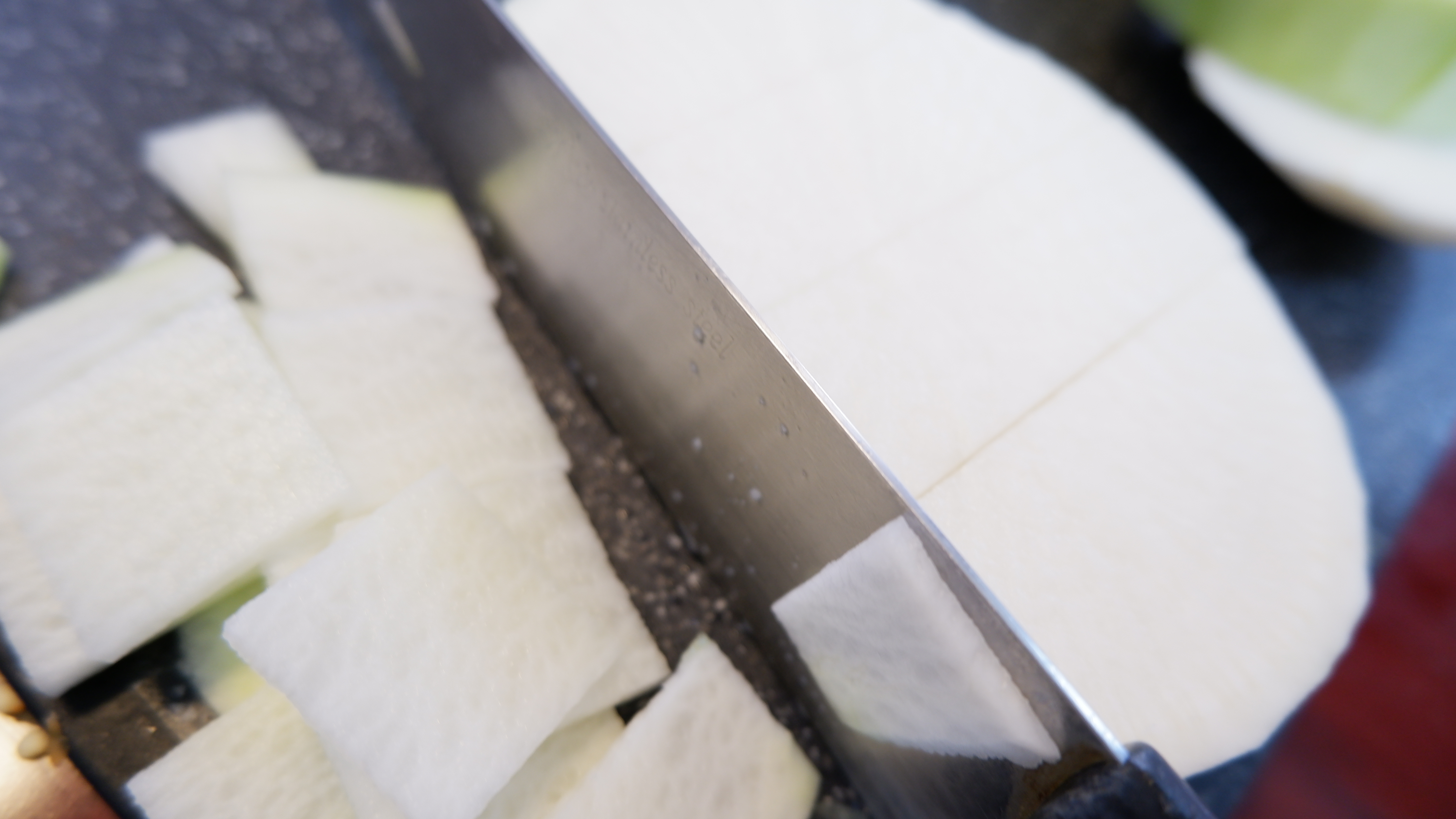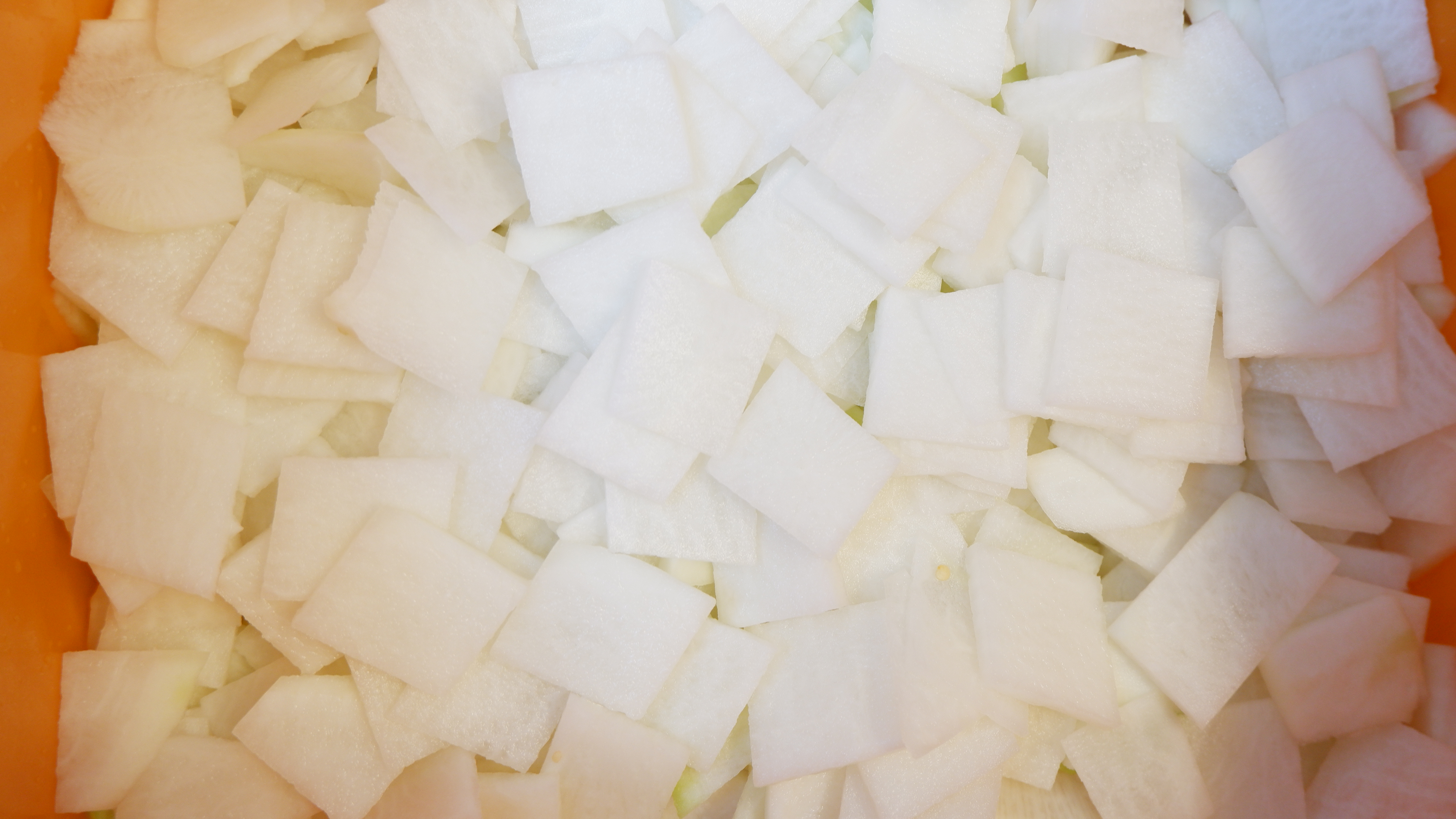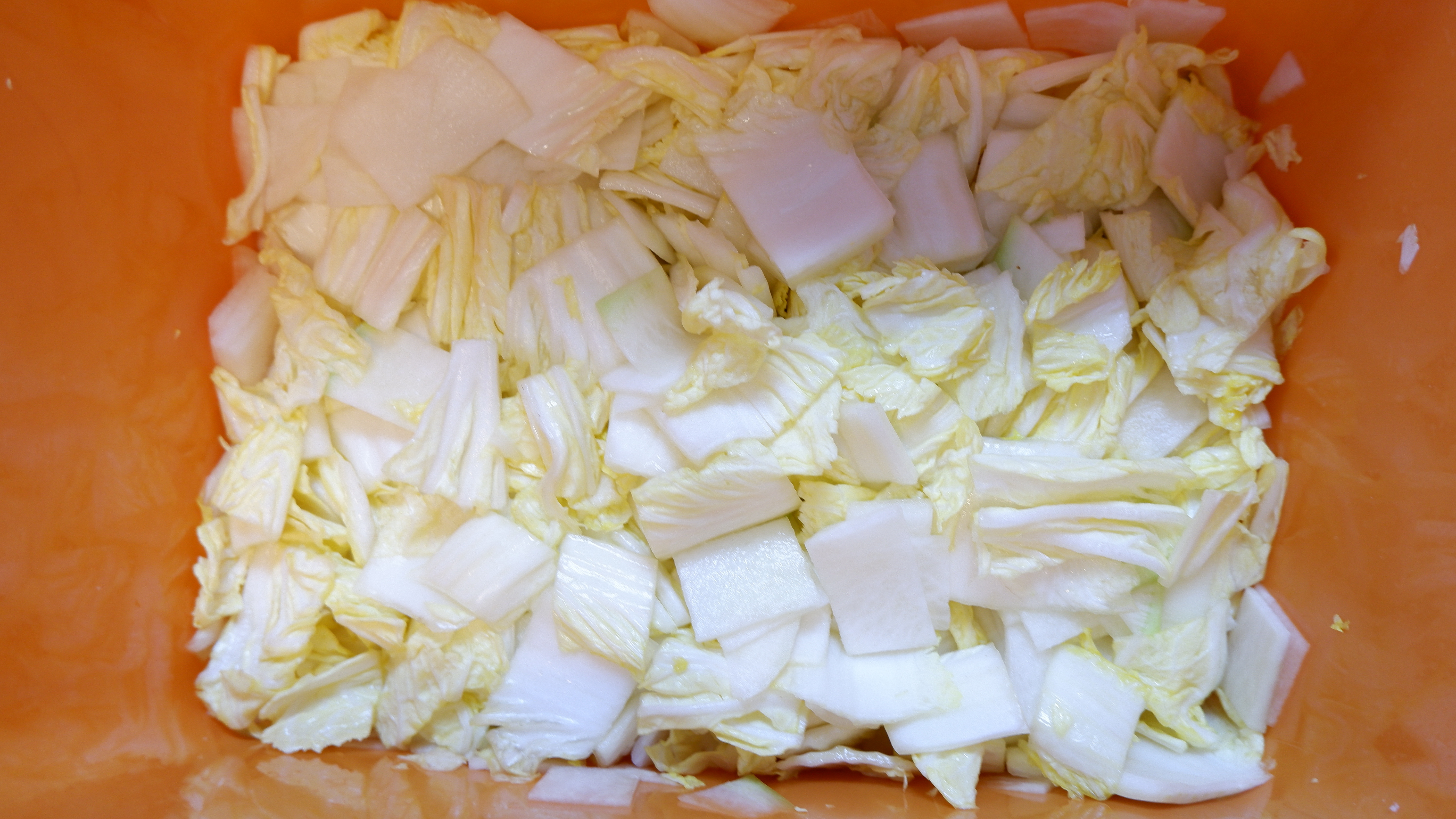 3. 무와 배추는 나박하게 썰어주는데 무는 적당한 크기로 토막을 내고 무의 굵기에 따라 3~4등분으로 썰어준 후 얇고 나박하게 썰어주고 배추도 반으로 가른 후 나박하게 썰어줍니다.