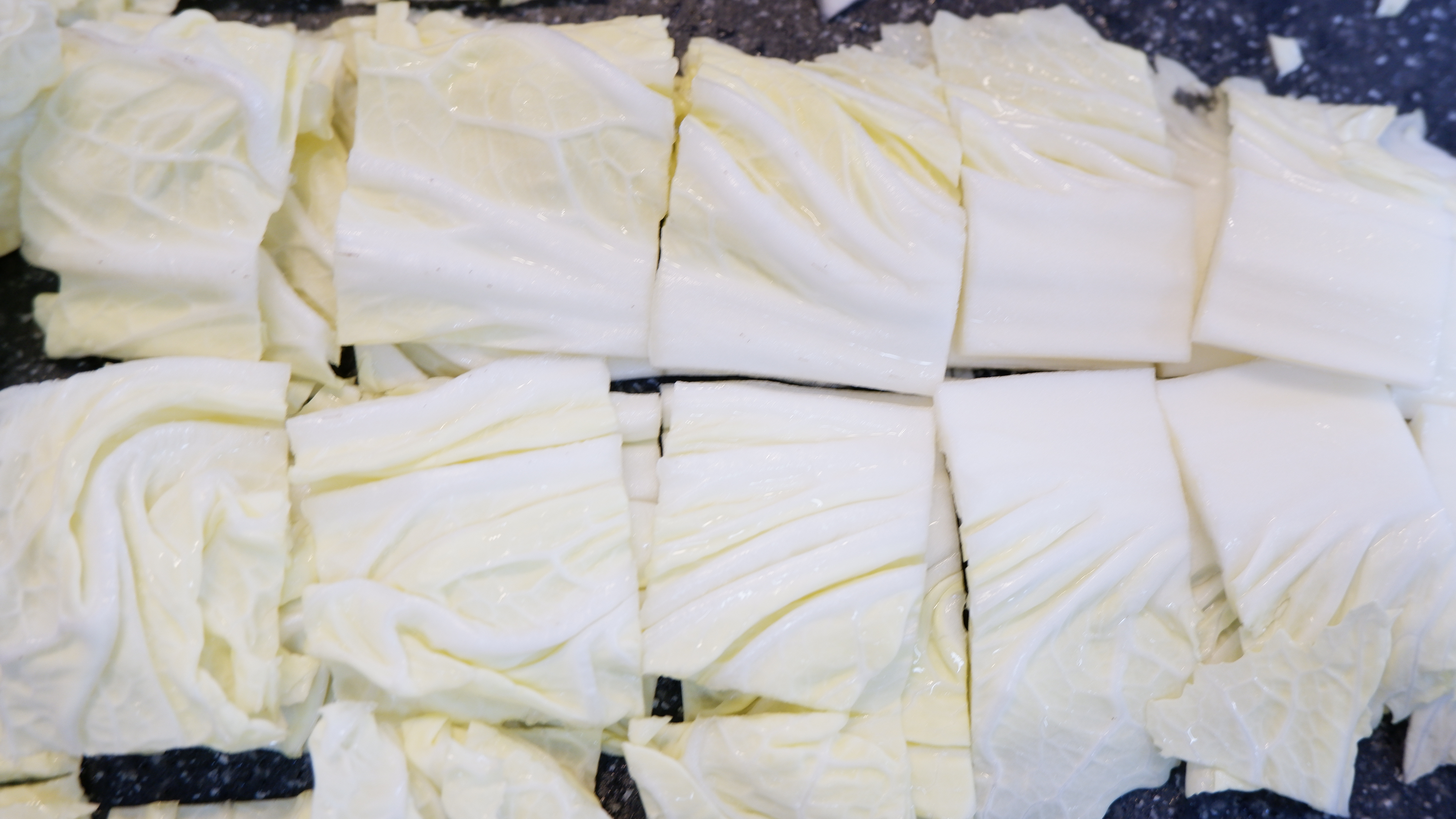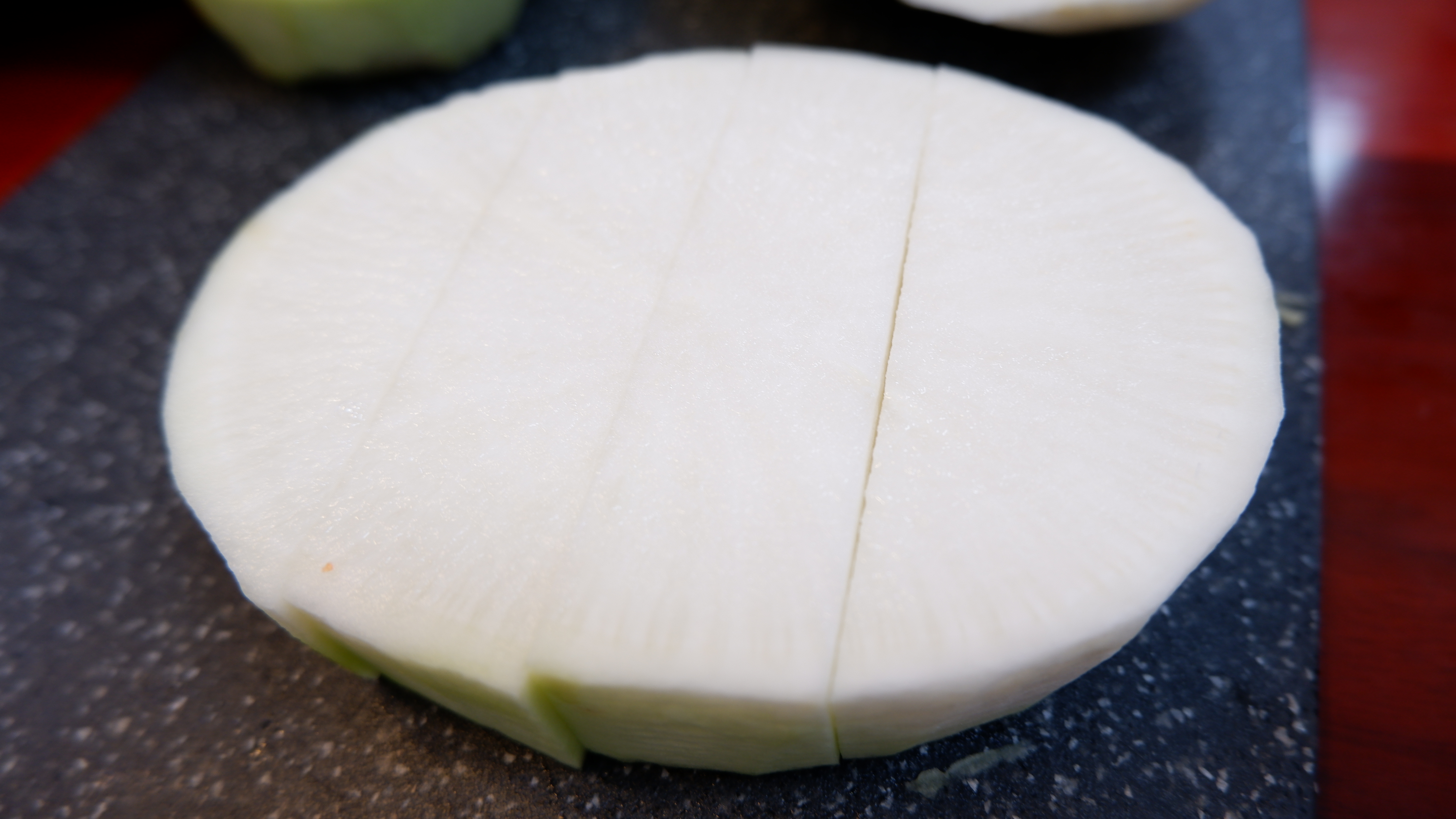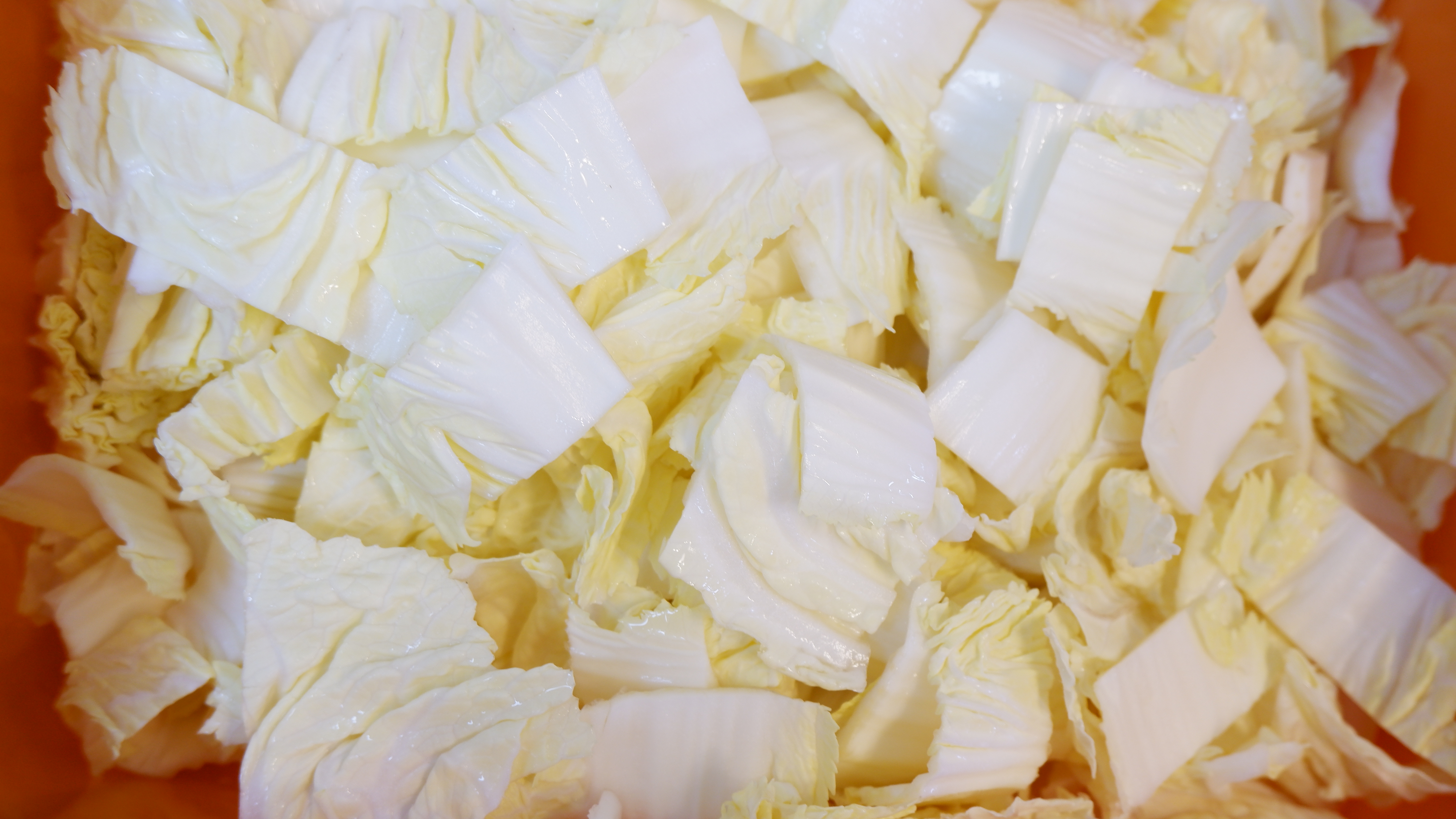 3. 무와 배추는 나박하게 썰어주는데 무는 적당한 크기로 토막을 내고 무의 굵기에 따라 3~4등분으로 썰어준 후 얇고 나박하게 썰어주고 배추도 반으로 가른 후 나박하게 썰어줍니다.