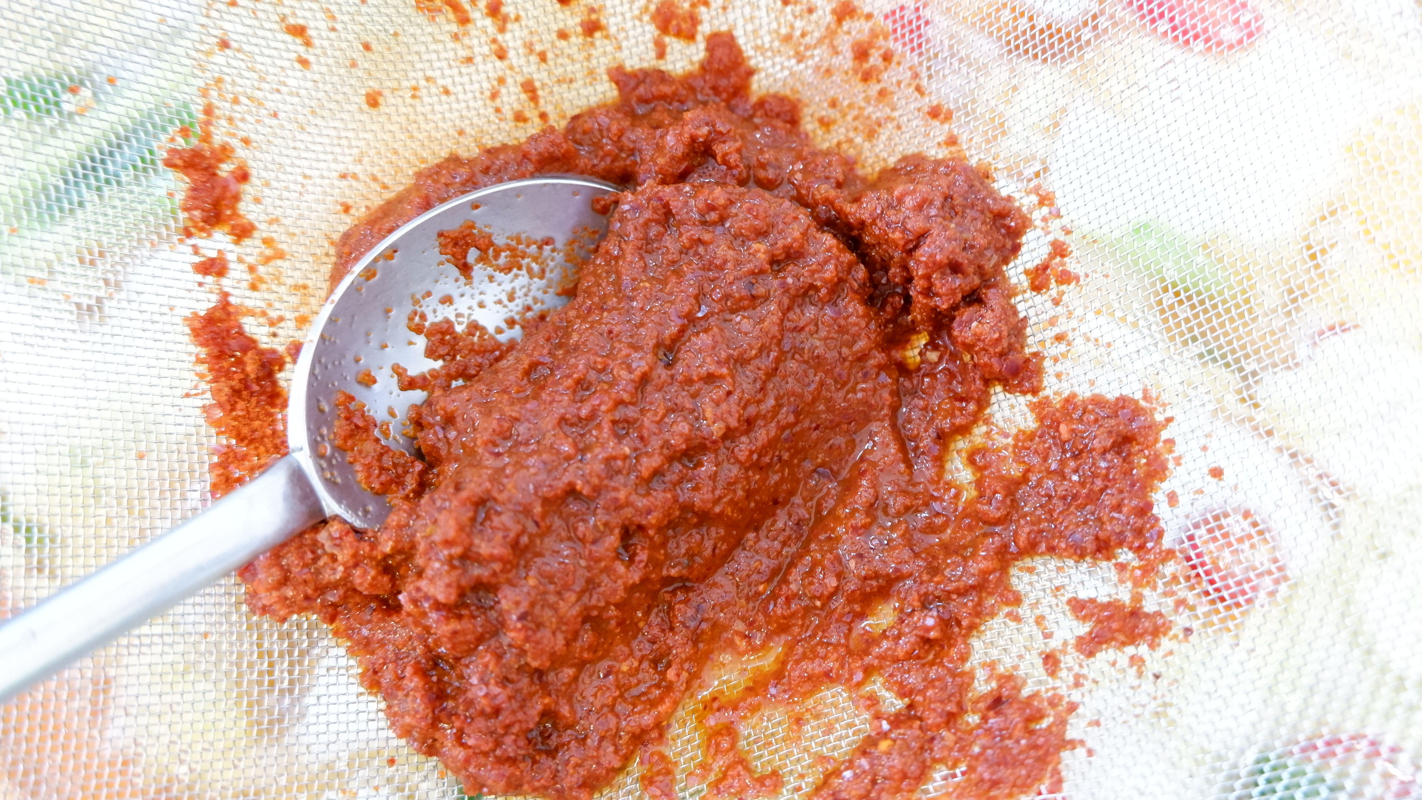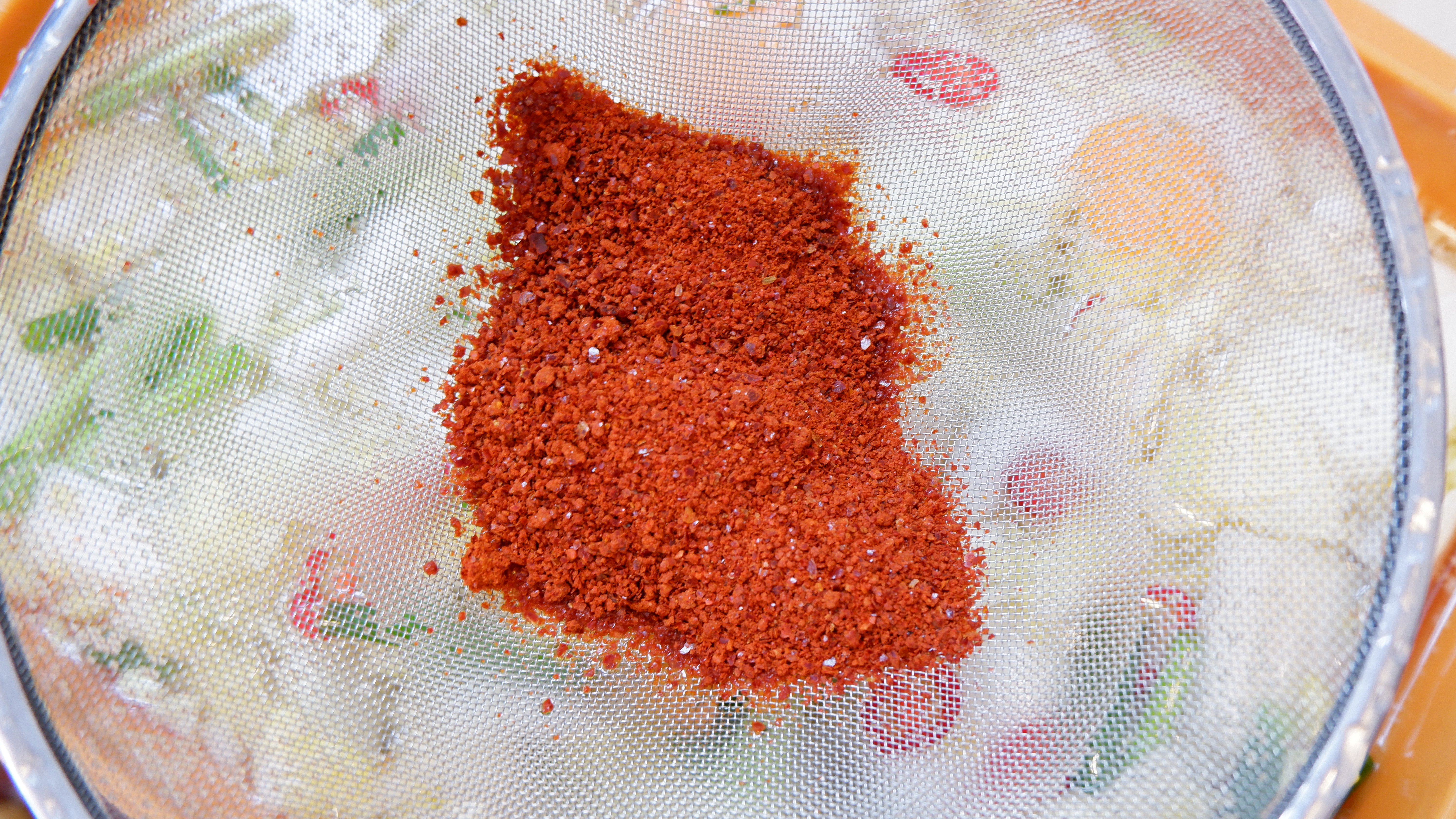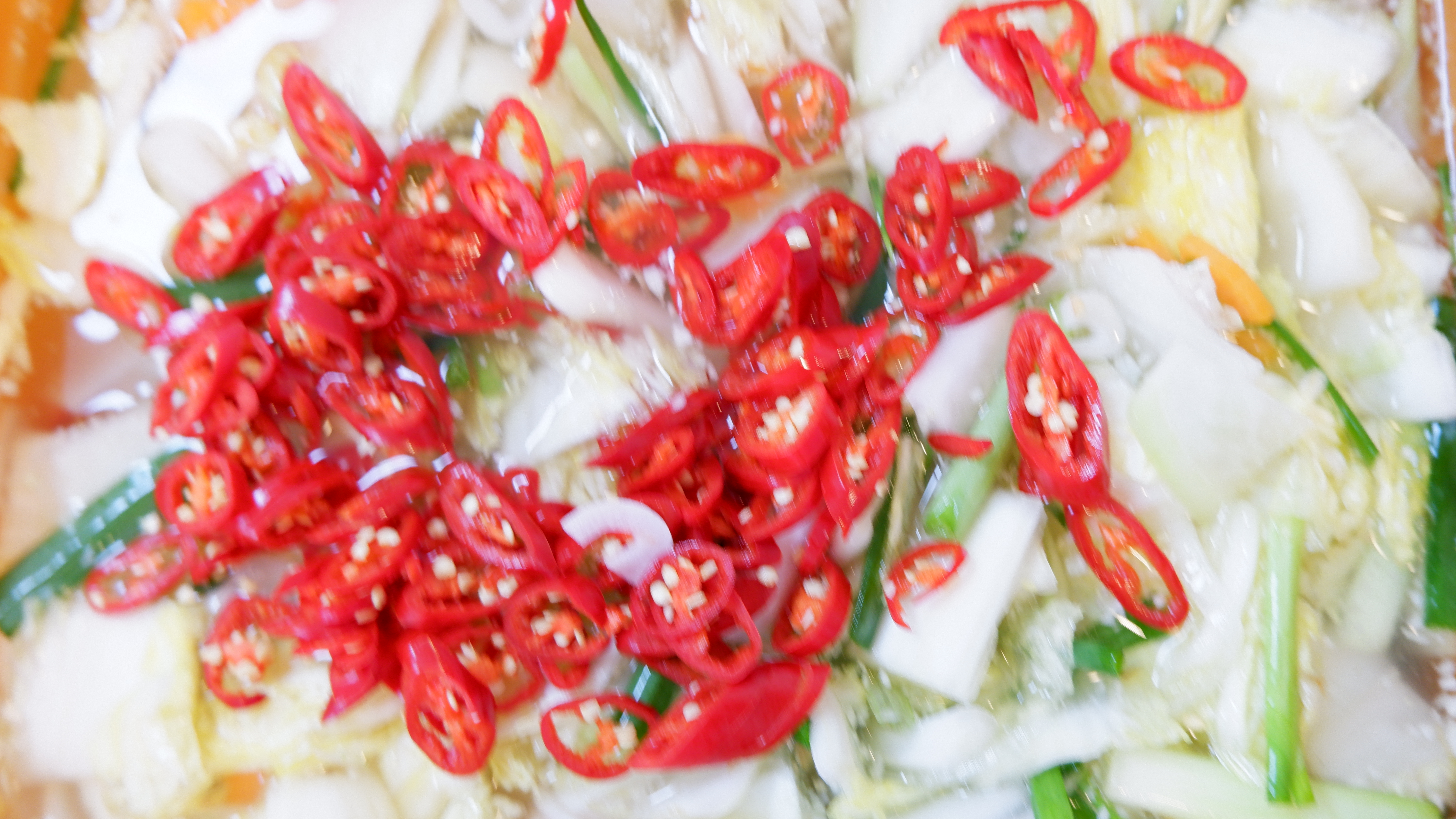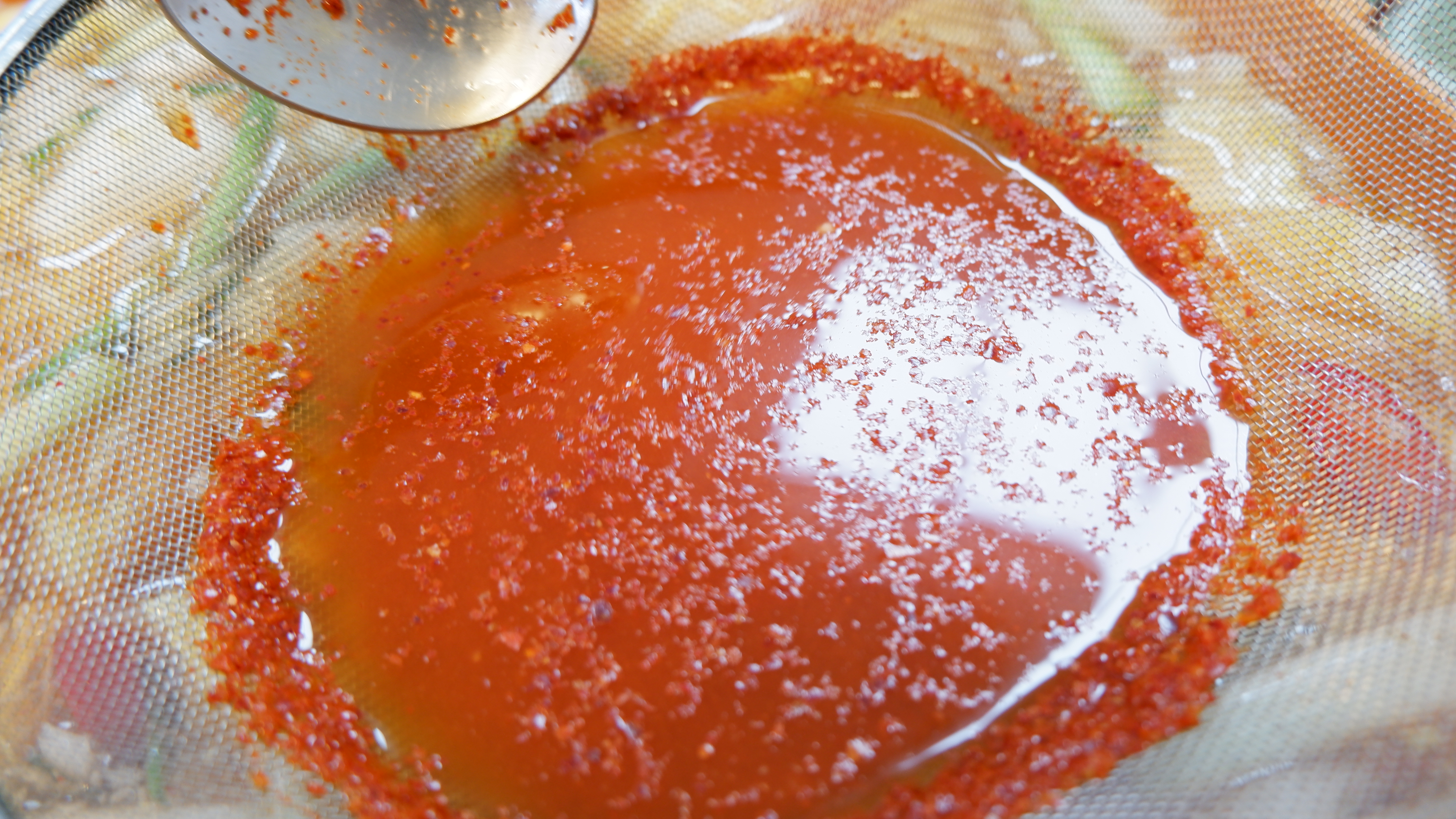 8. 송송 썰어둔 홍고추를 넣고 원하는 맵기에 따라 고춧가루 5~10큰술을 체망에 걸러 넣어 고춧가루가 뜨지 않는 깨끗한 국물을 만들어 줍니다.
