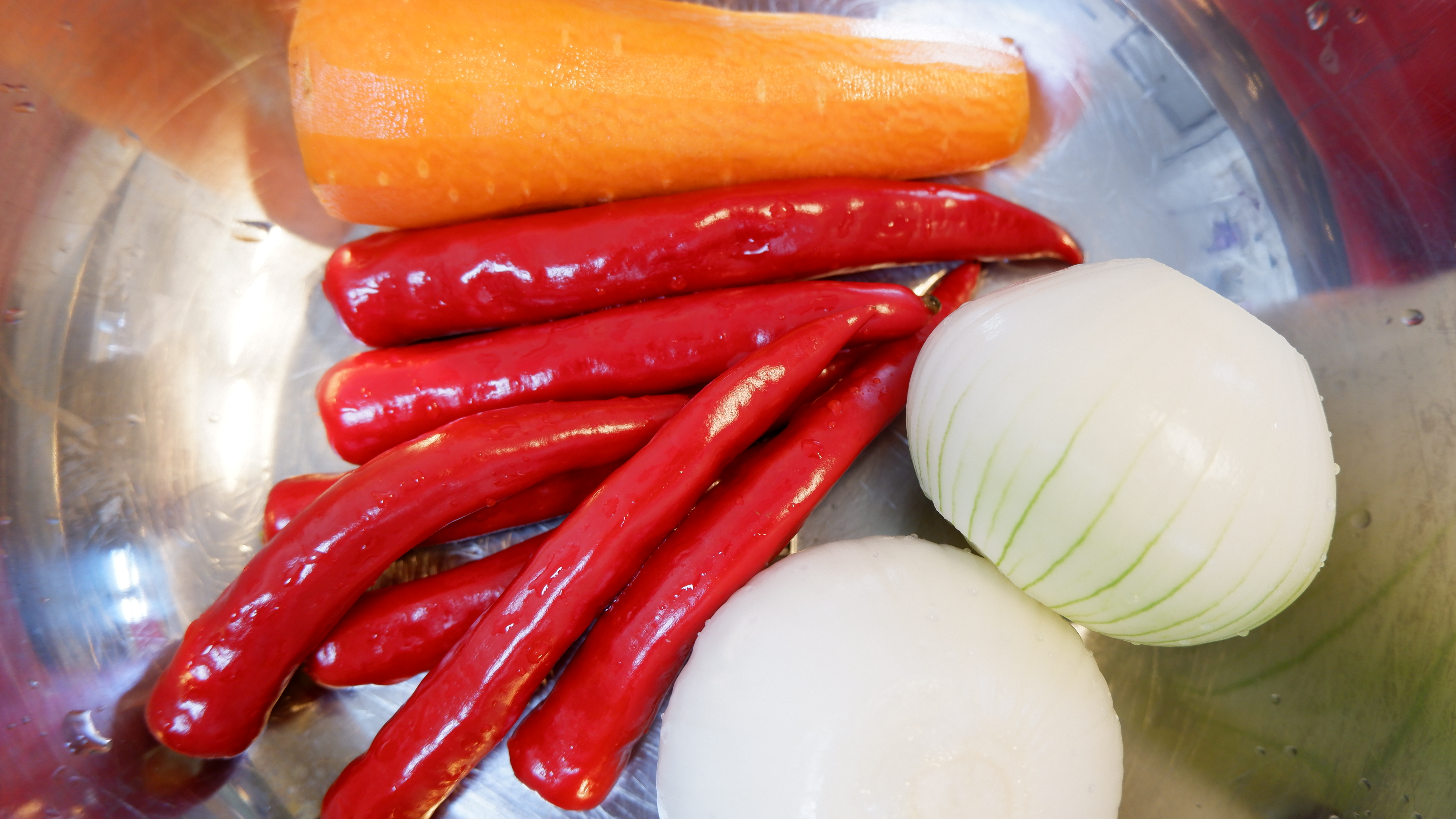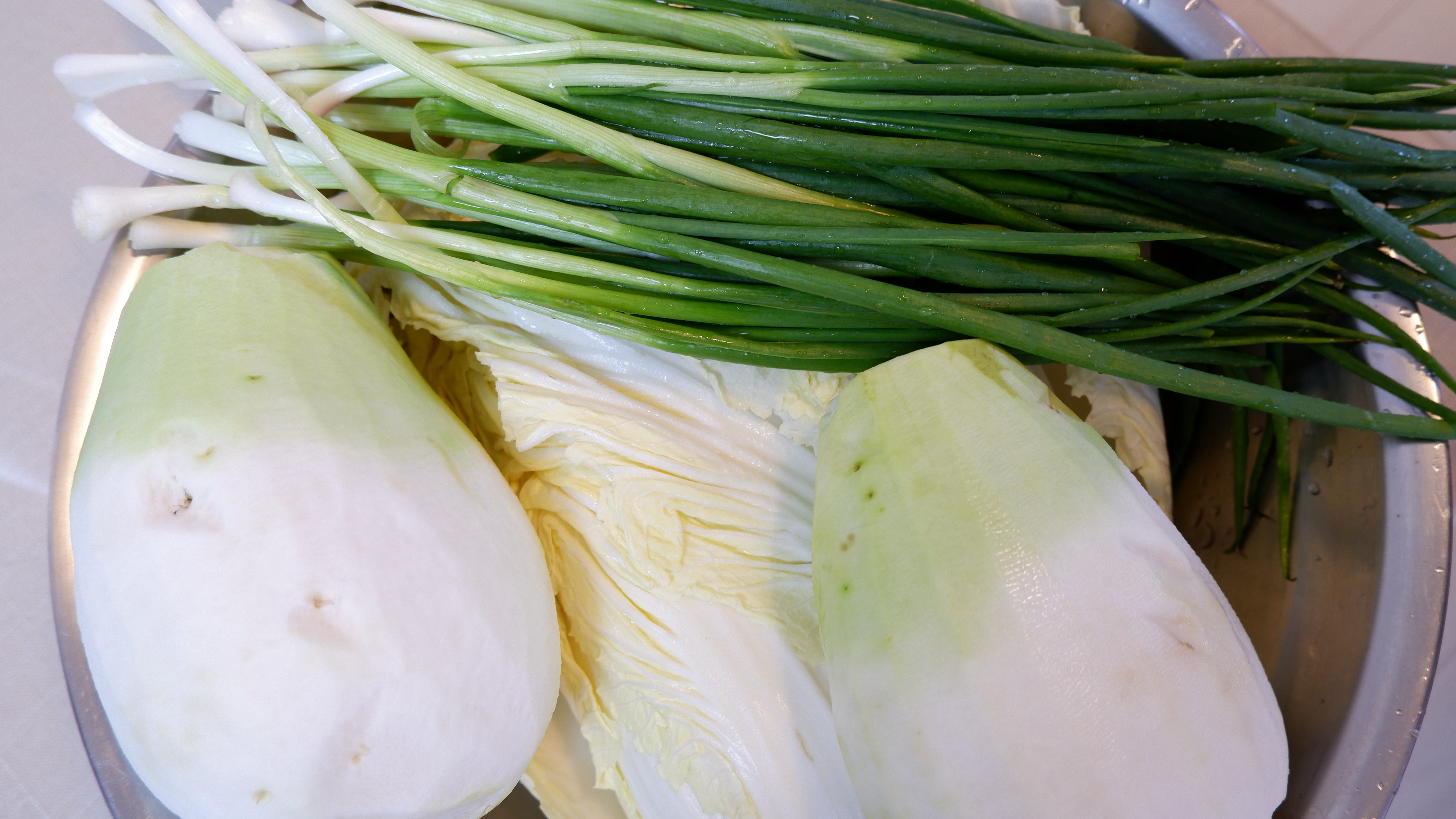 필요한 재료 : 쪽파 한 줌 , 무 2개 (2kg) , 당근 2개 , 홍고추 6~7개 , 양파 2개 , 알배추 1 포기 (1.5kg)