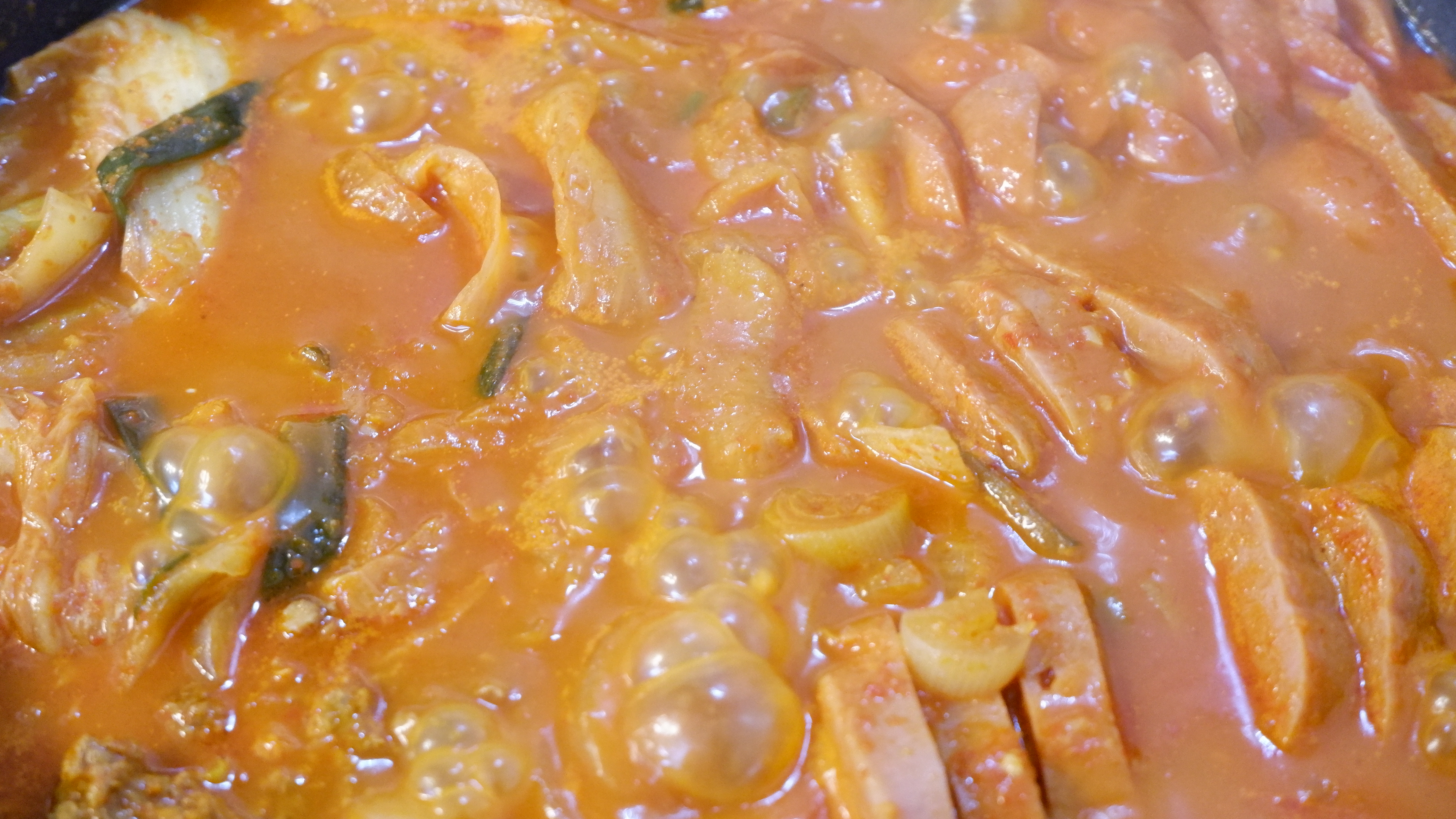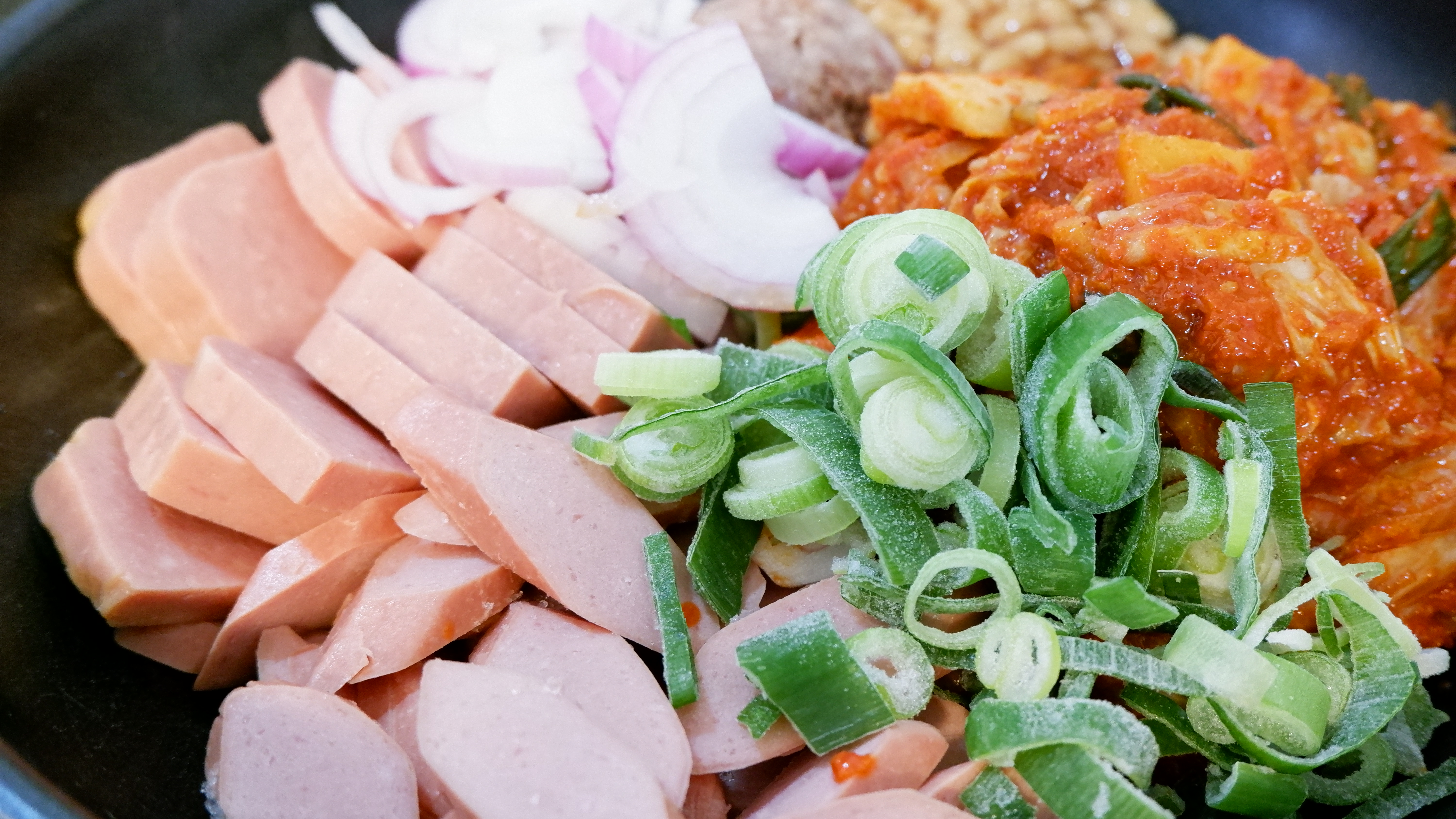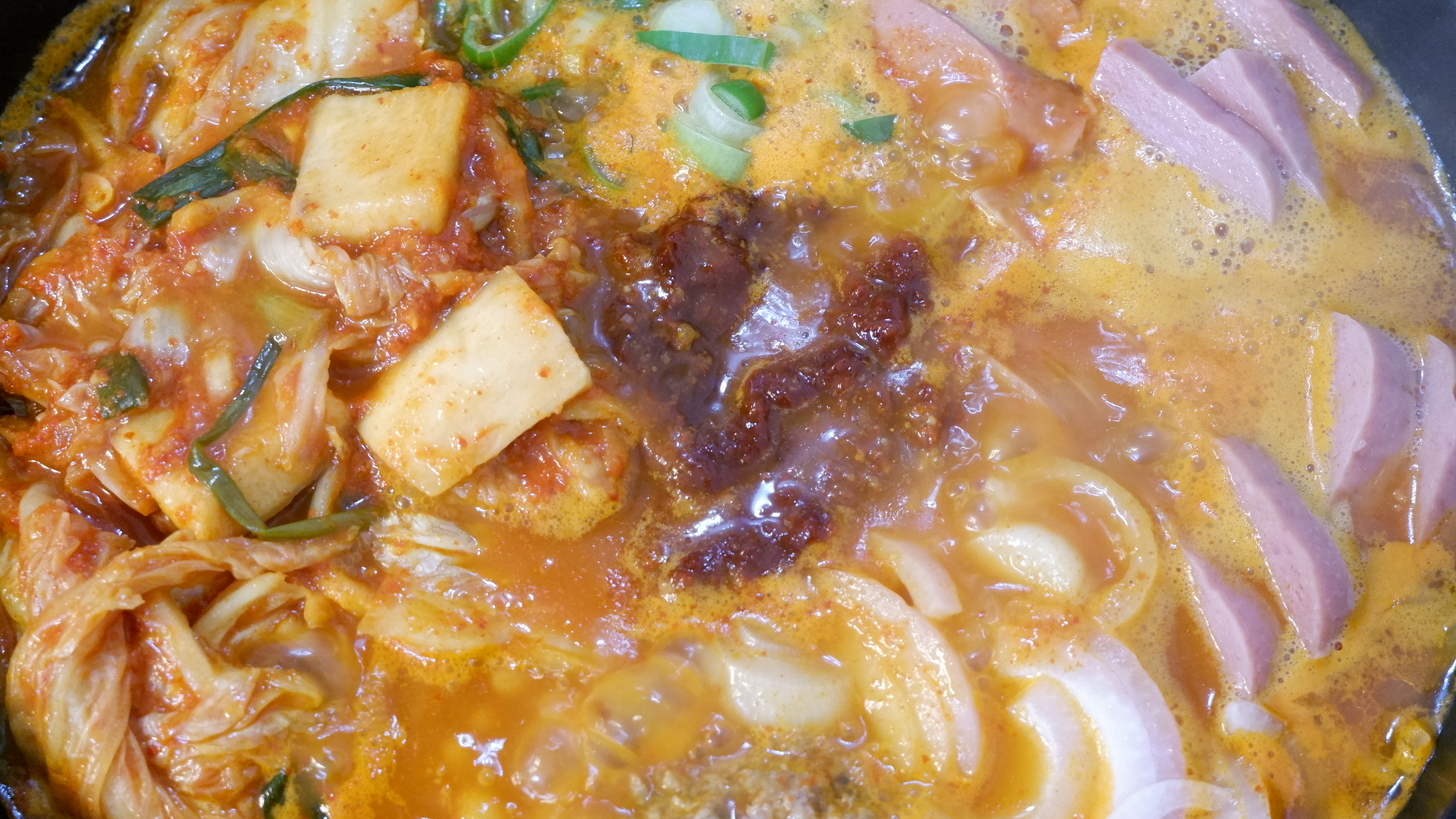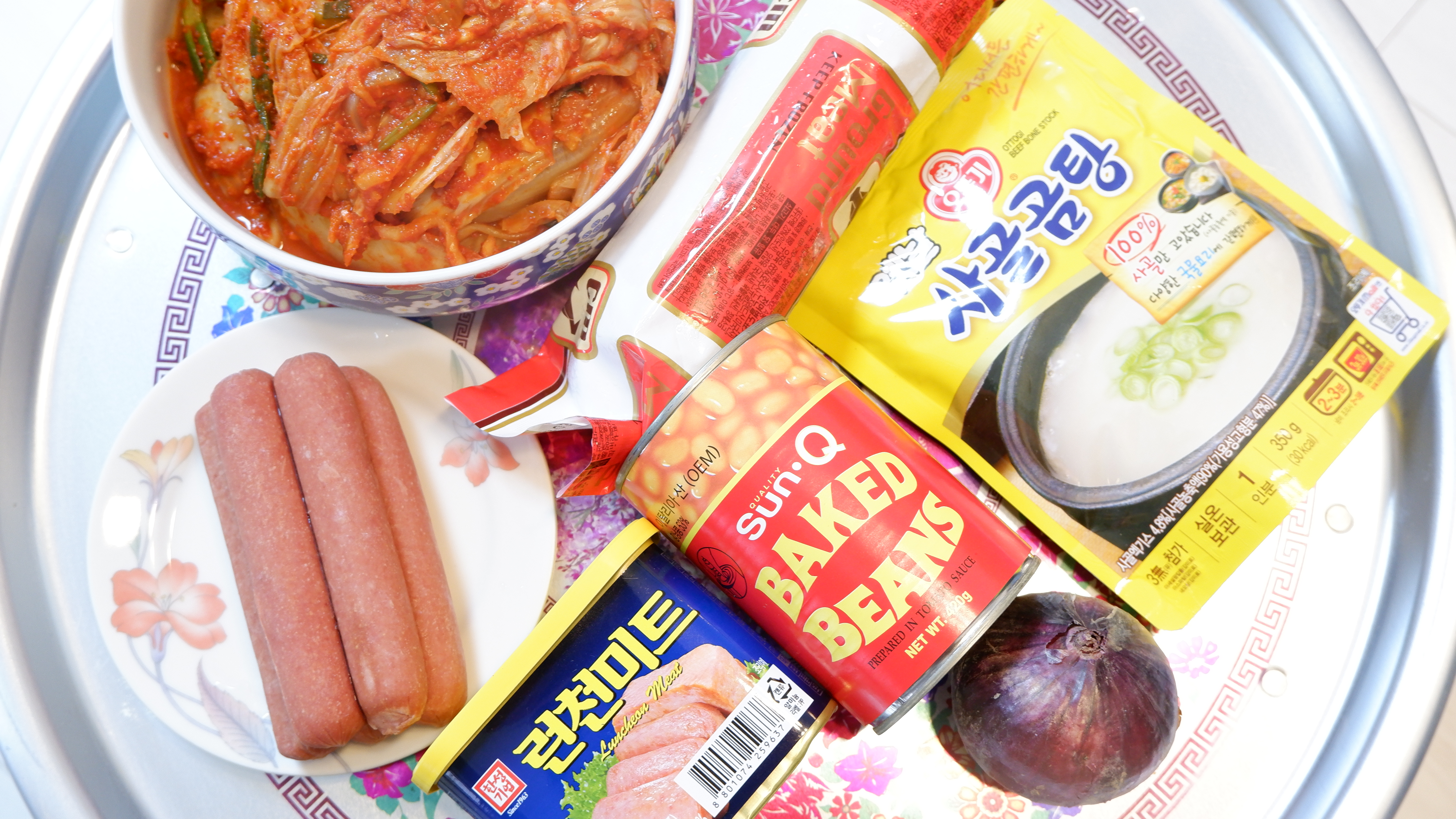 필요한 재료 (4~5인분) : 신김치 반 포기 ( 600~ 700g) , 스팸 340g , 소시지 5개 , 사골육수 500~600ml , 양파 1개 , 대파 한 줌 , 다진 고기 (100g) , 통조림 콩