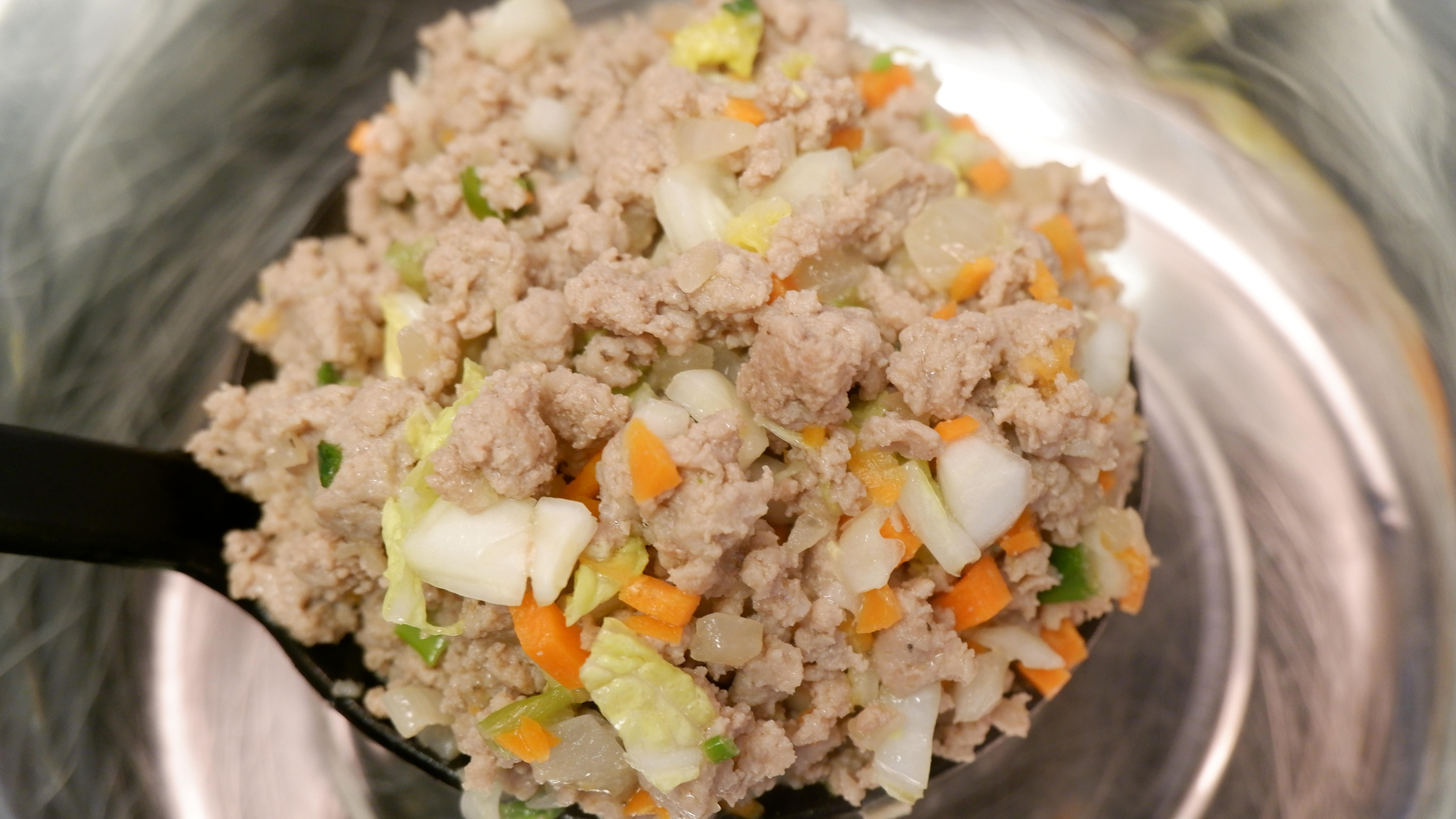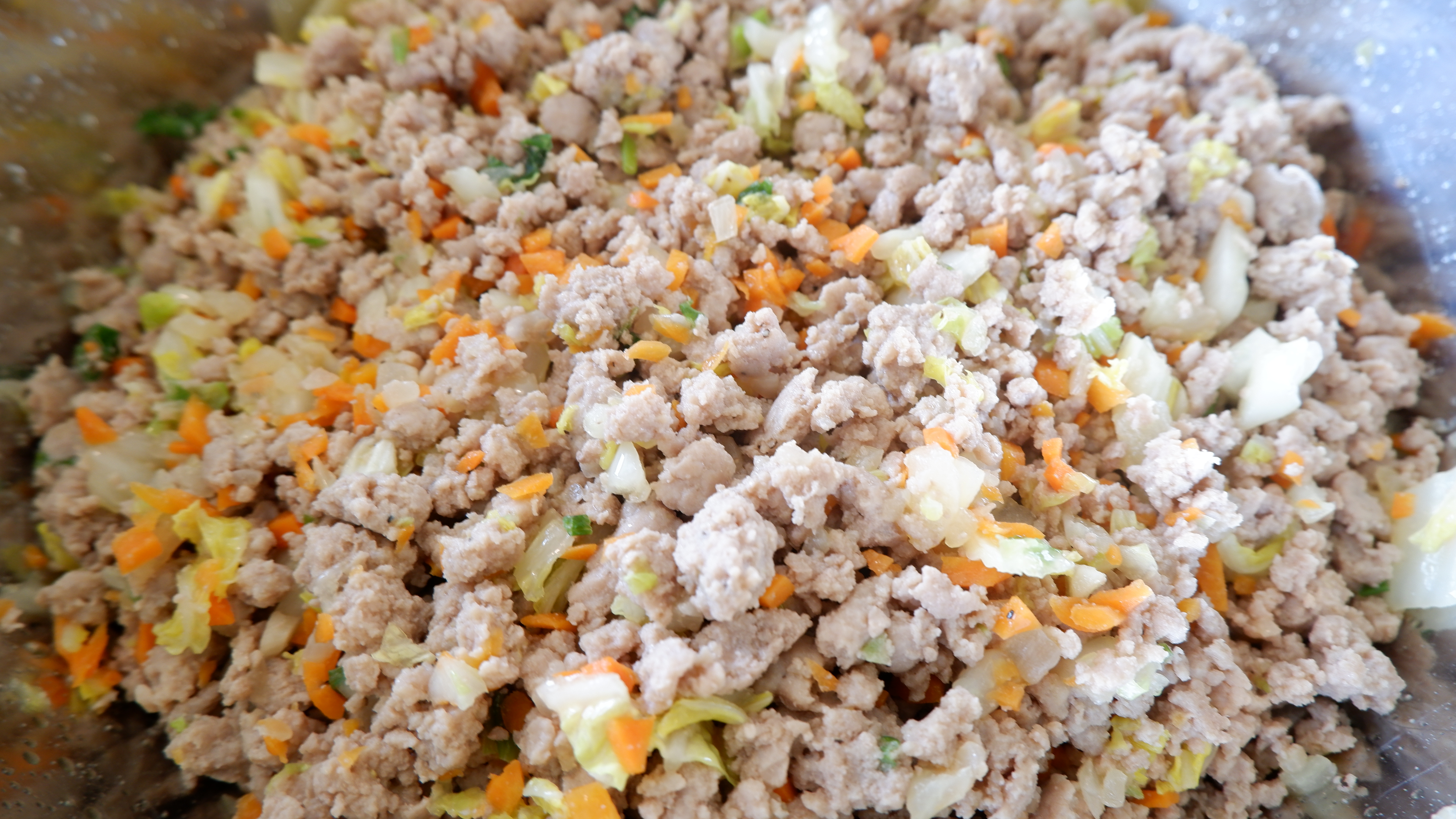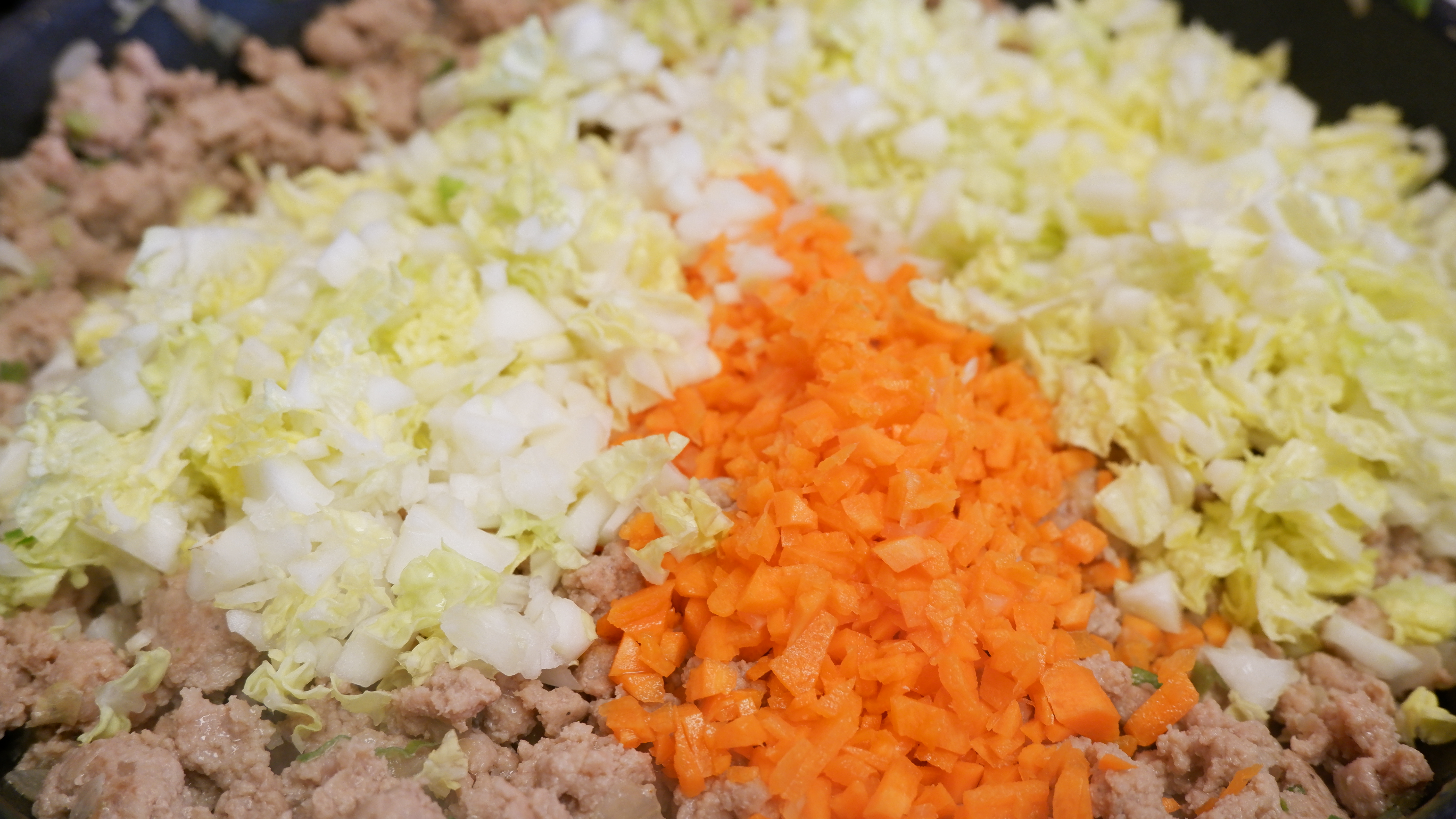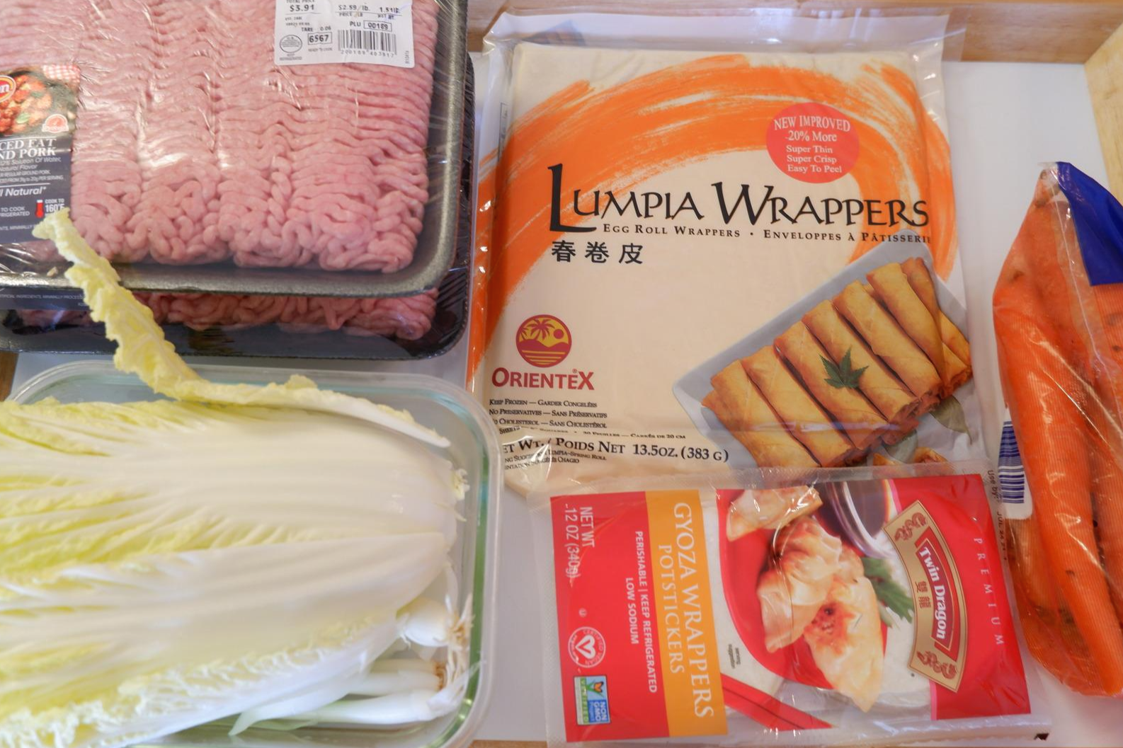필요한 재료 : 간 돼지고기 2kg , 배추 5~7장 , 당근 2개 , 양파 1/2개 , 대파 1대 , 룸피아 래퍼 (에그롤 피)