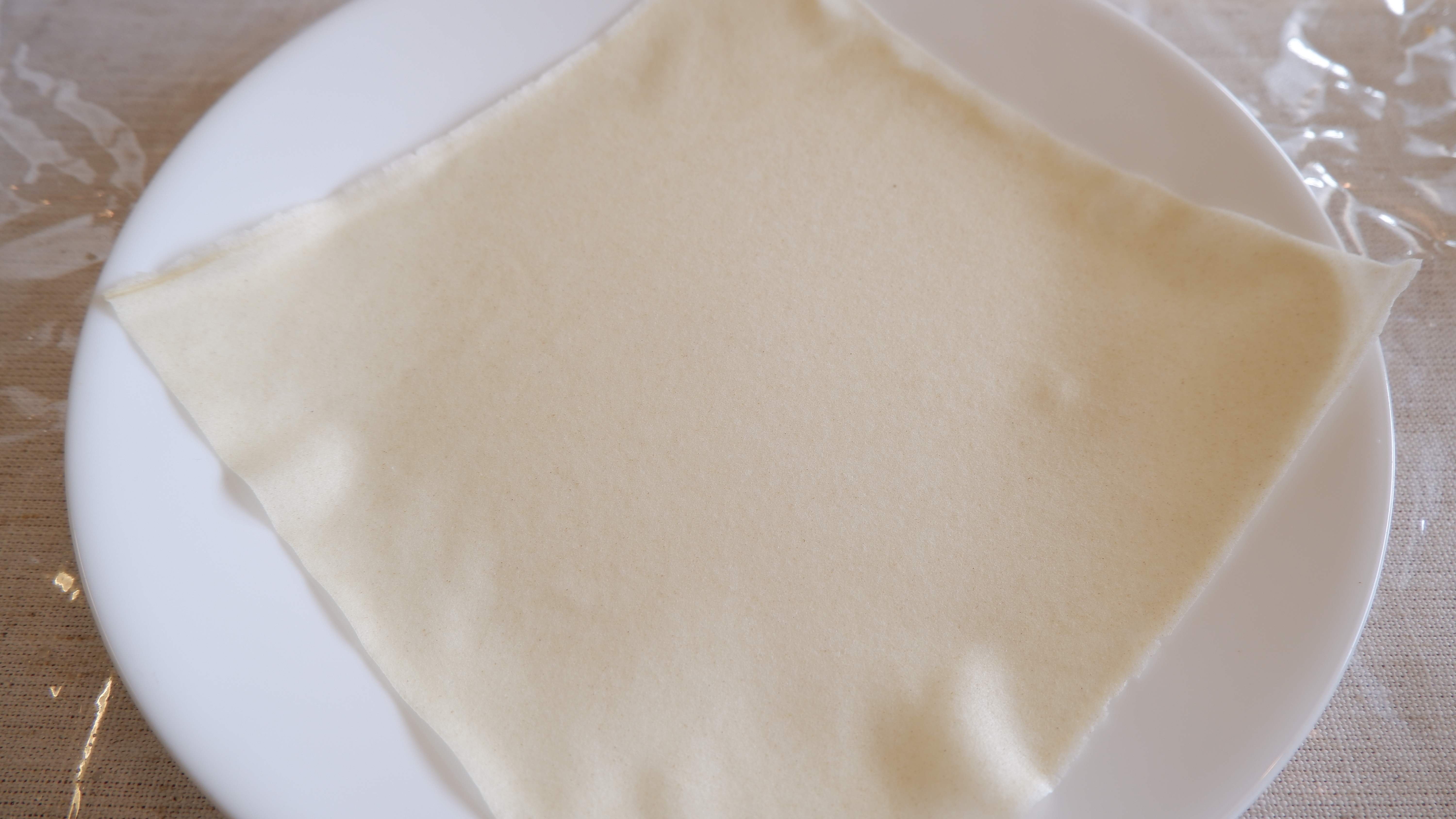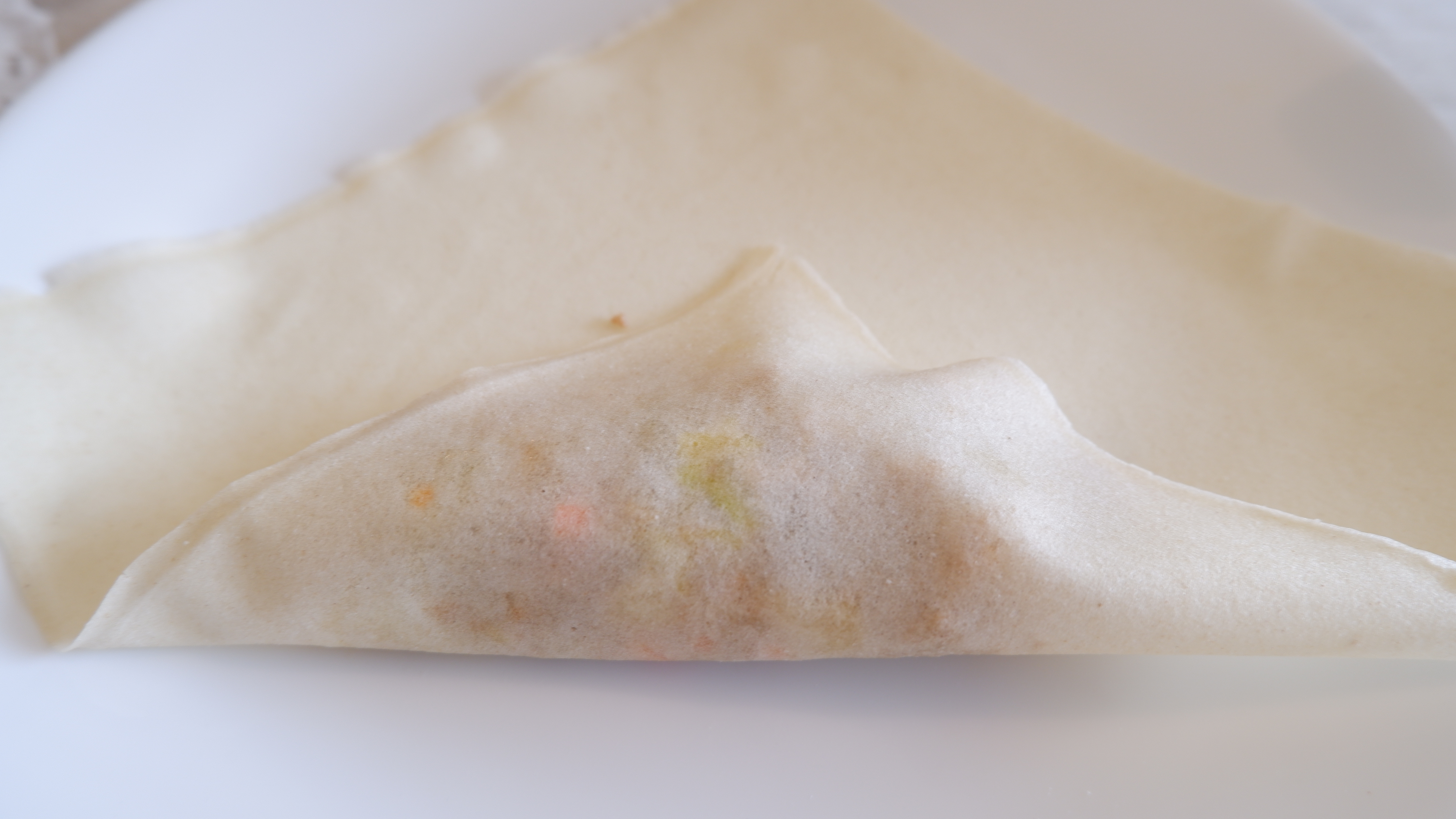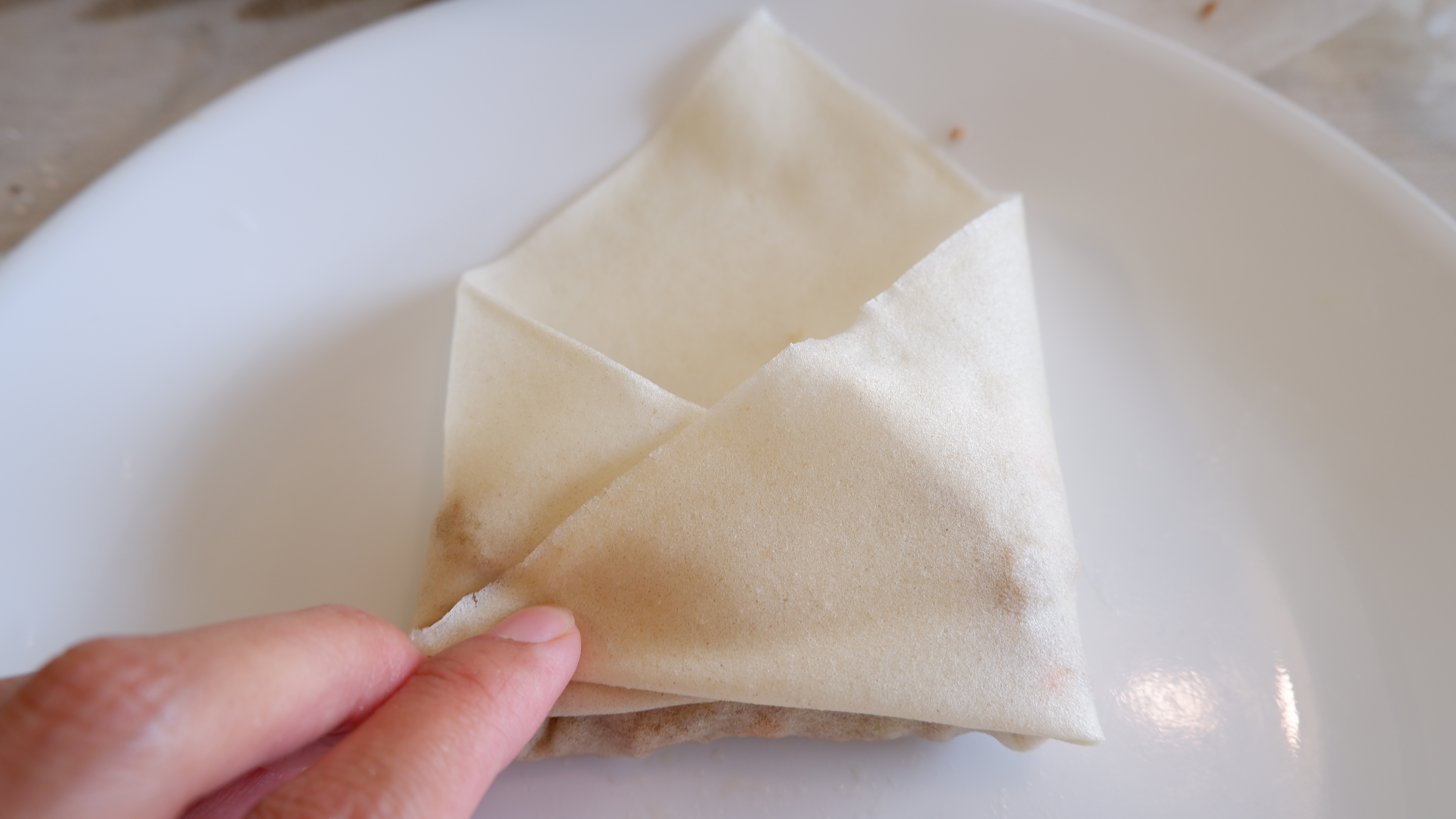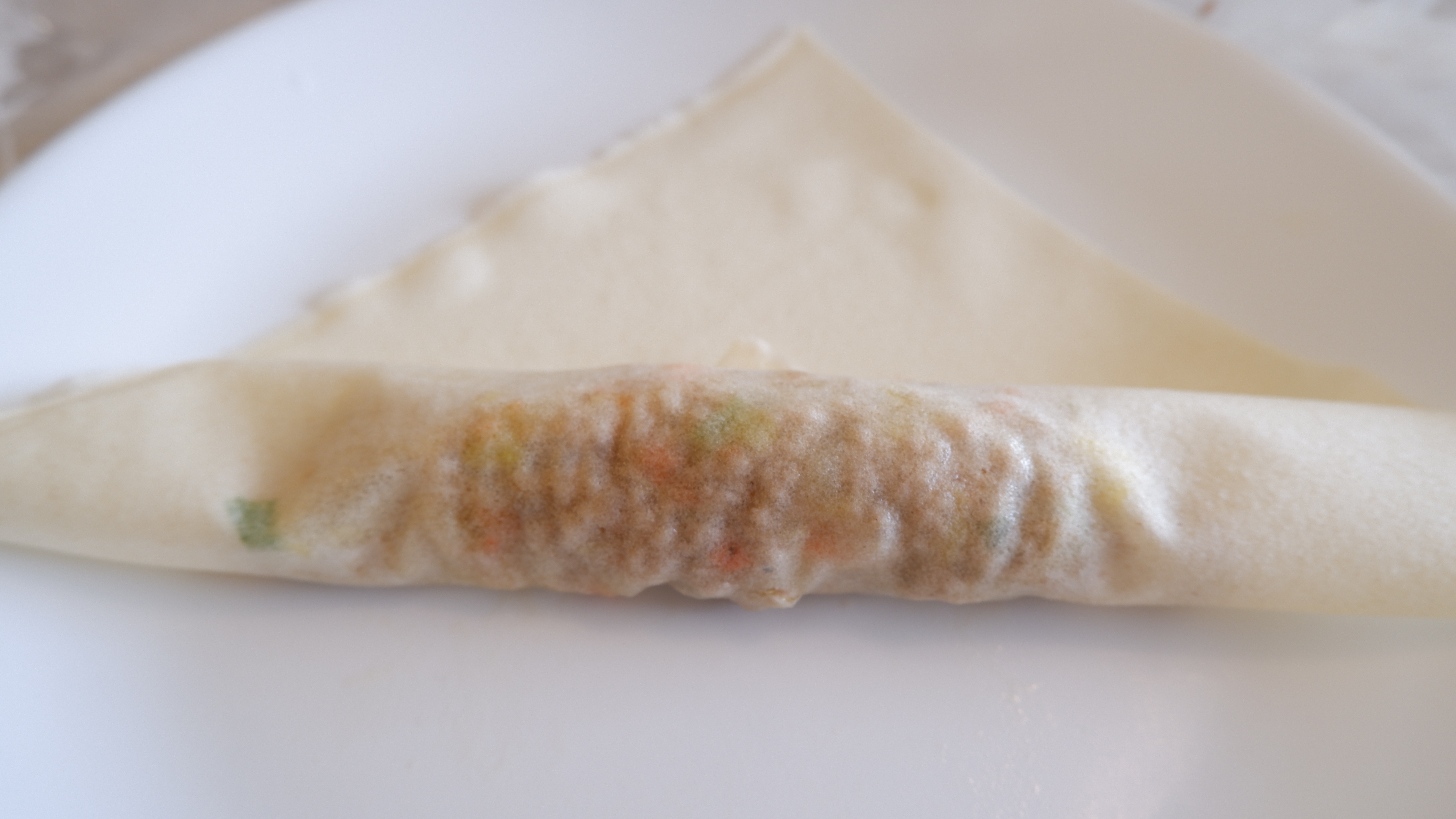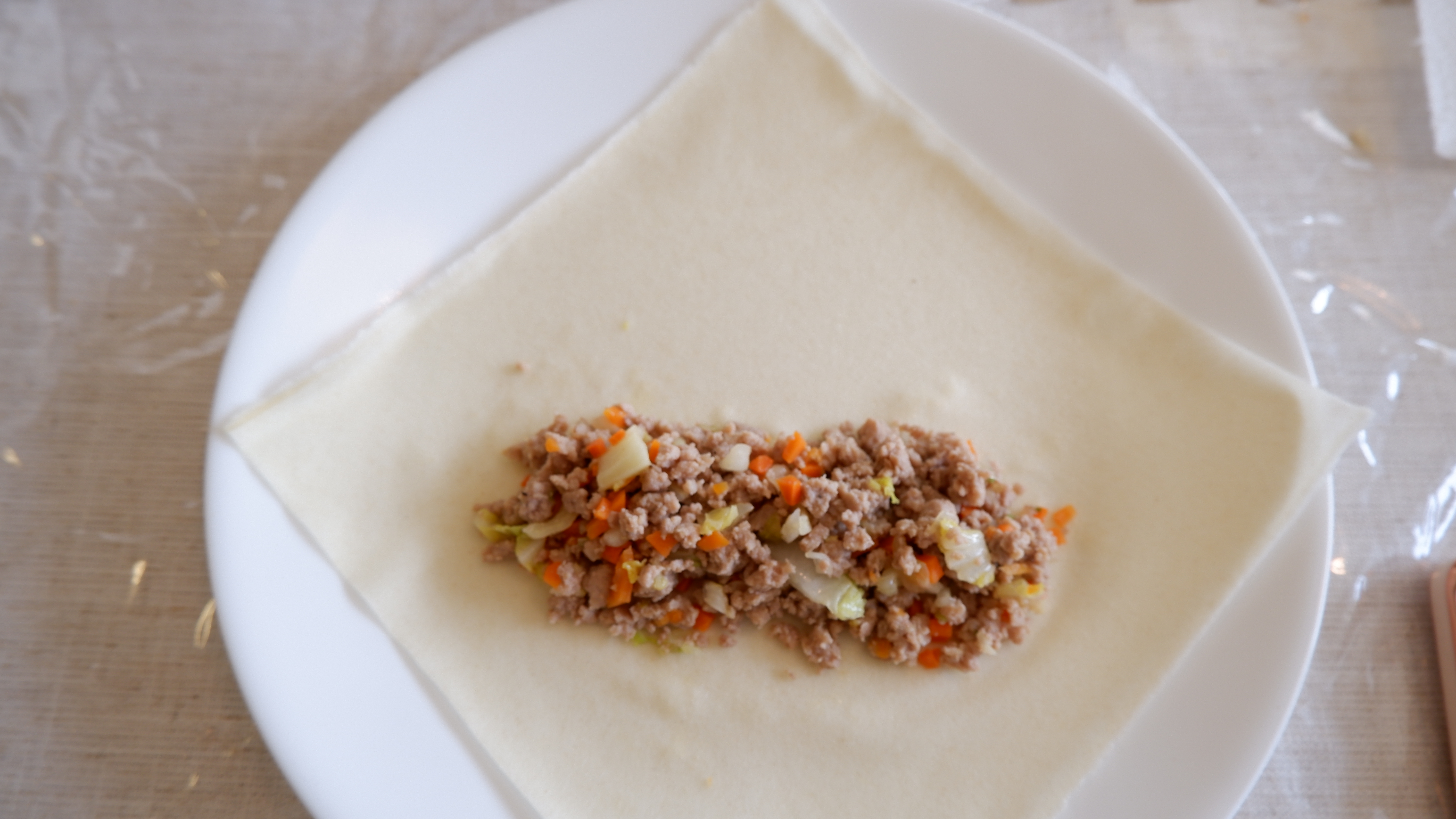 8. 룸피아 래퍼 (에그롤 피) 를 한 장 떼어서 소를 한 큰 술~ 한 큰 술 반 정도 넣고 위에 모양처럼 만들어 줍니다. 너무 많은 소를 넣을 경우 피가 쉽게 찢어지기 때문에 적당한 양을 넣어 만들어 주세요!