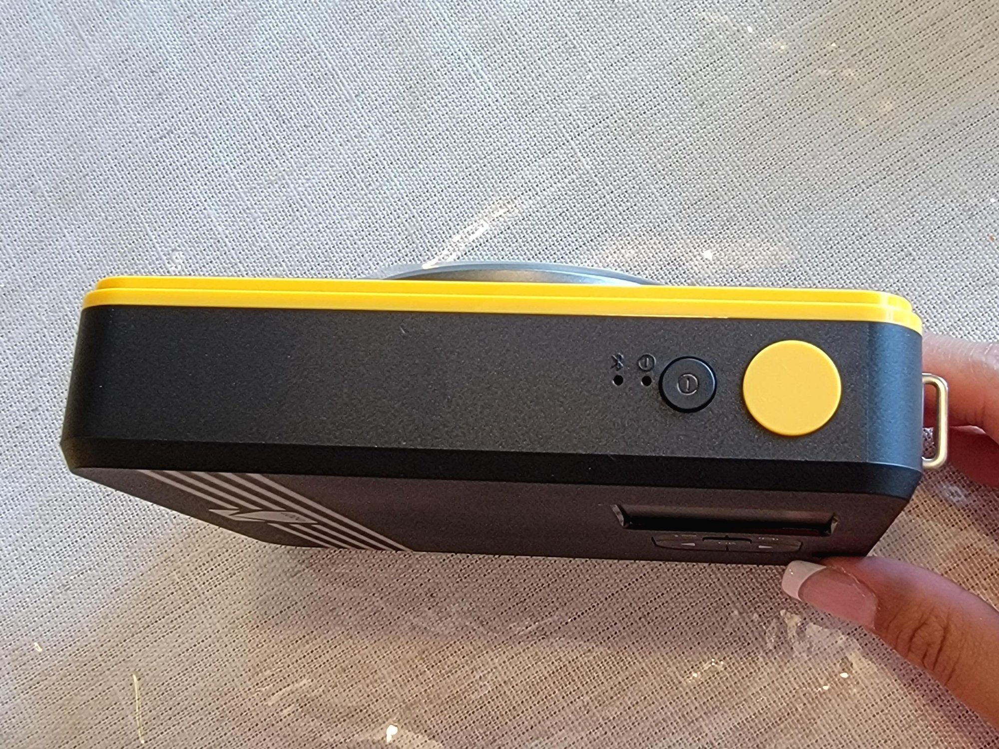 위쪽엔 전원 버튼과 촬영 셔터 버튼 그리고 왼쪽엔 리셋 버튼과 충전단자 , 오른쪽엔 사진 송출구가 있고 아래쪽엔 필름을 교체할 수 있는 곳이 있습니다.