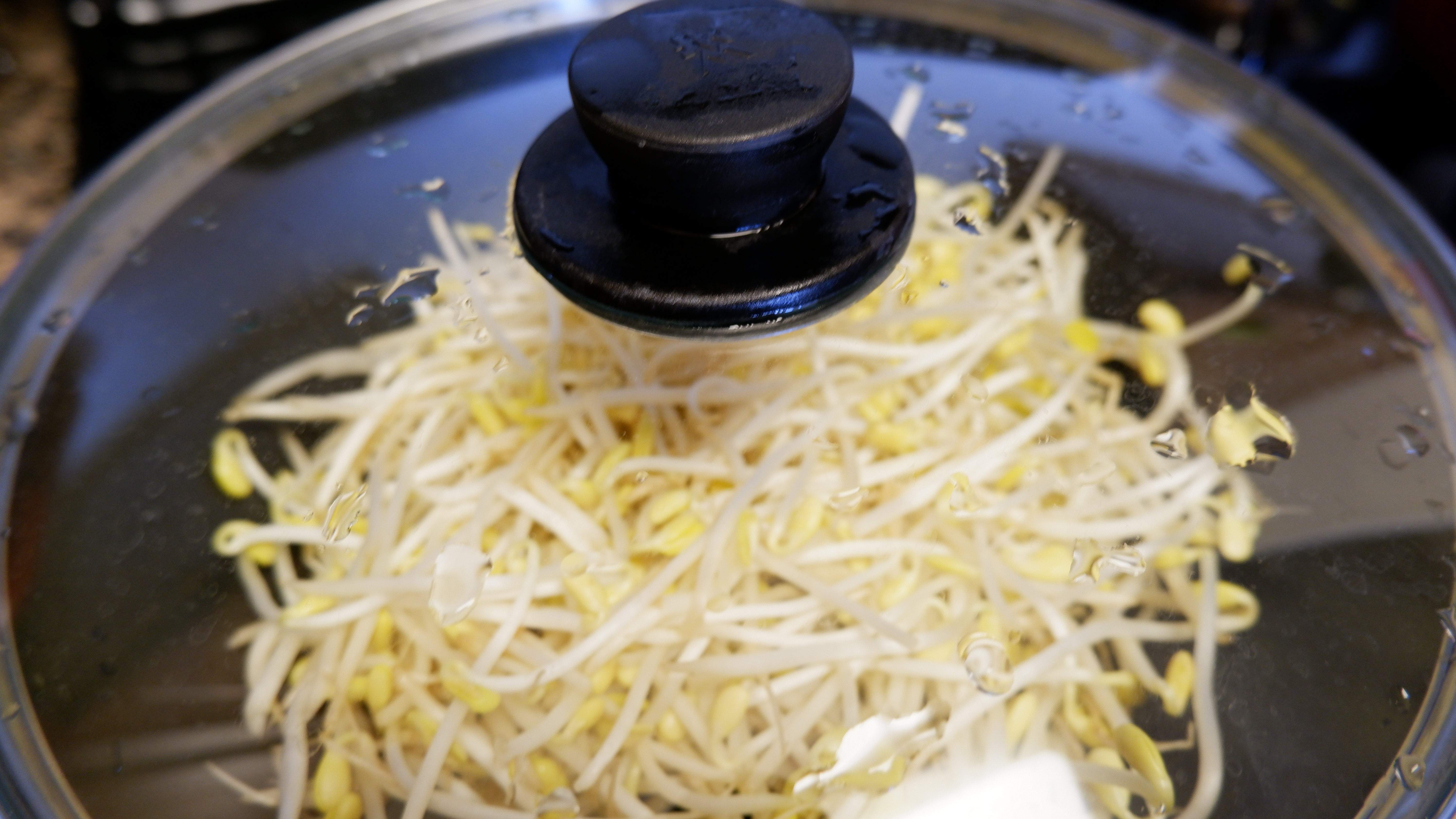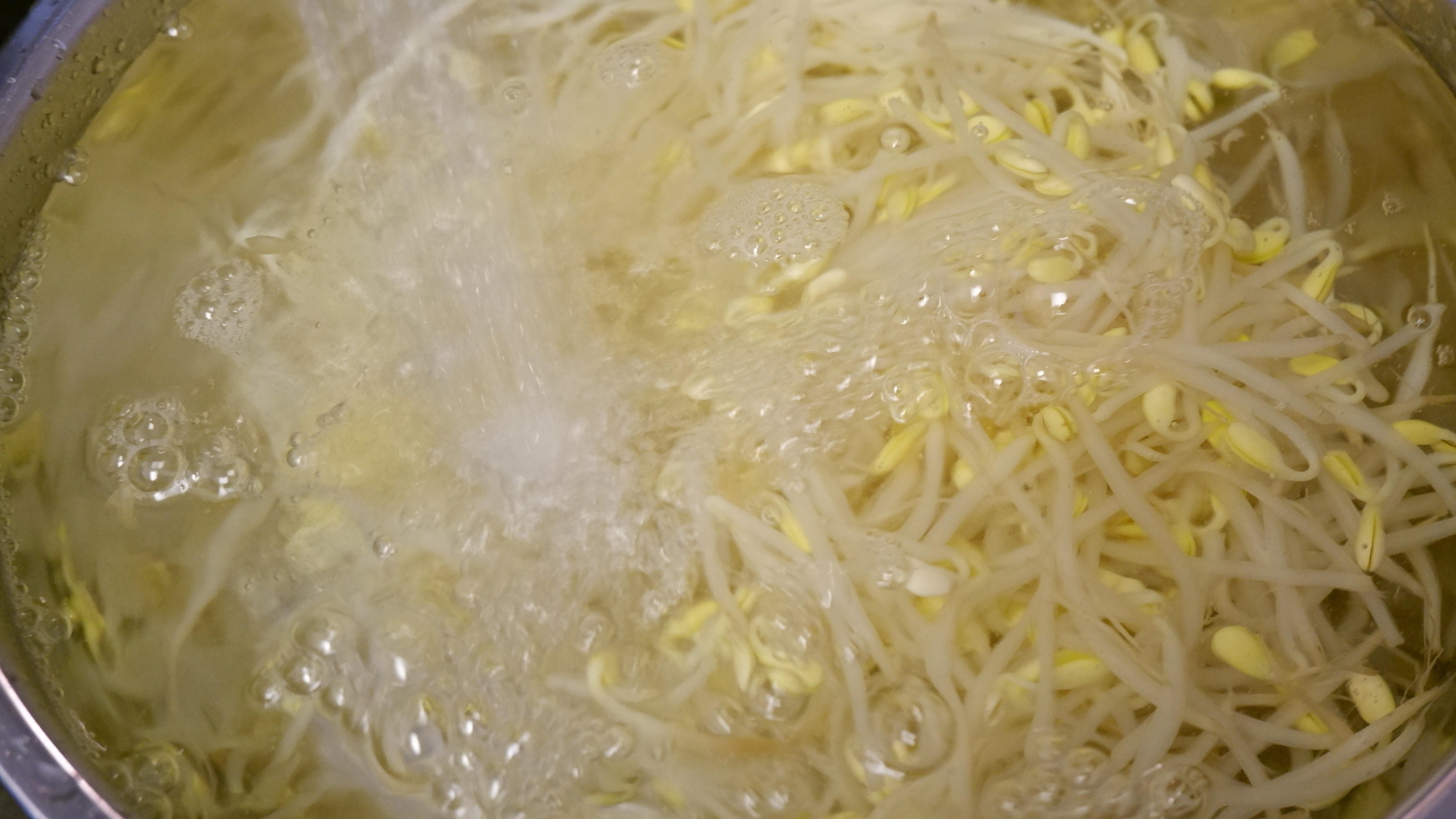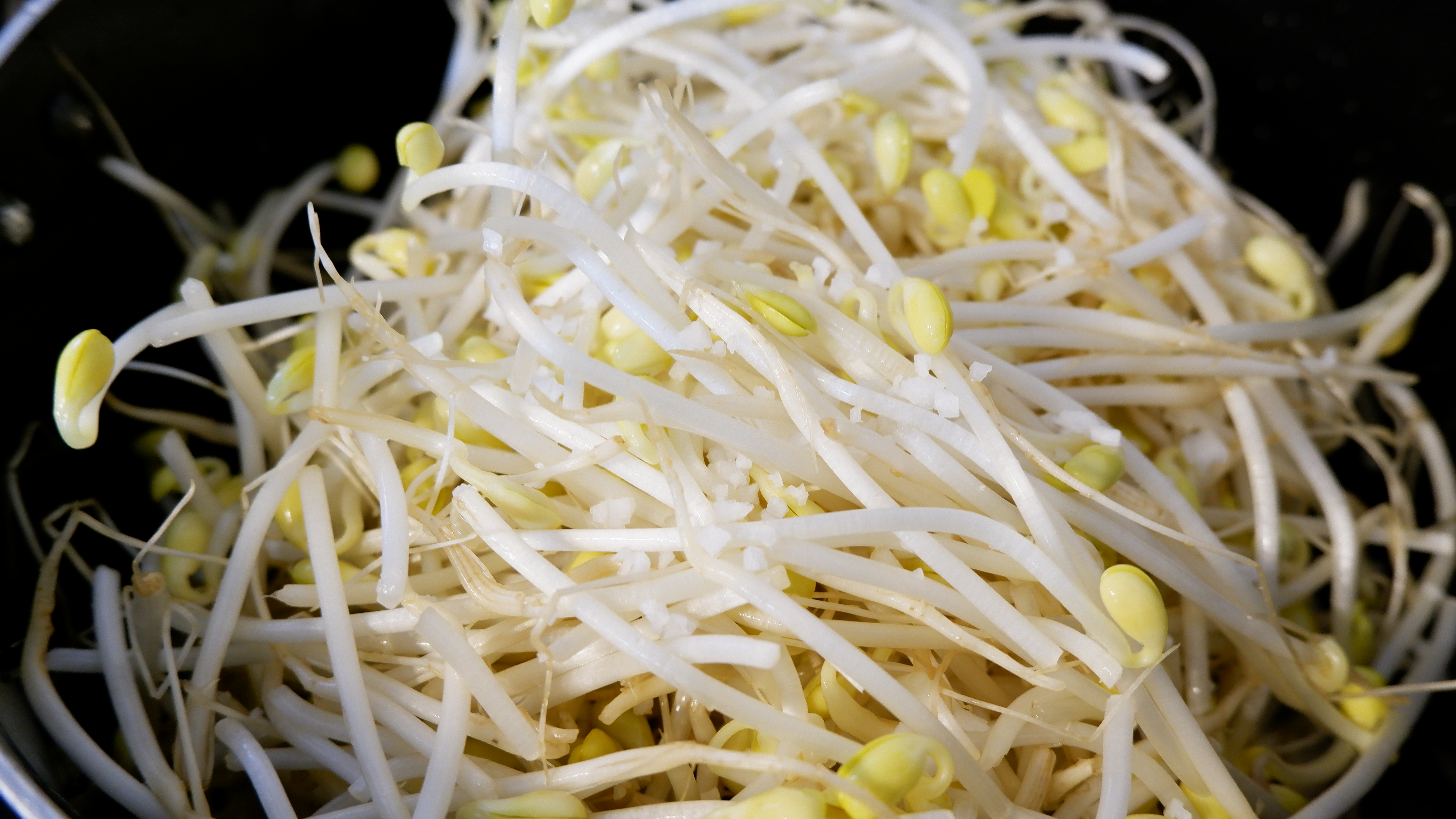 2. 넓은 냄비나 웍에 물을 반 컵 넣고(최소한의 물) 콩나물을 넓게 펴준 후 약간의 굵은소금을 넣은 뒤 불은 중불에 두고 뚜껑을 닫아줍니다.