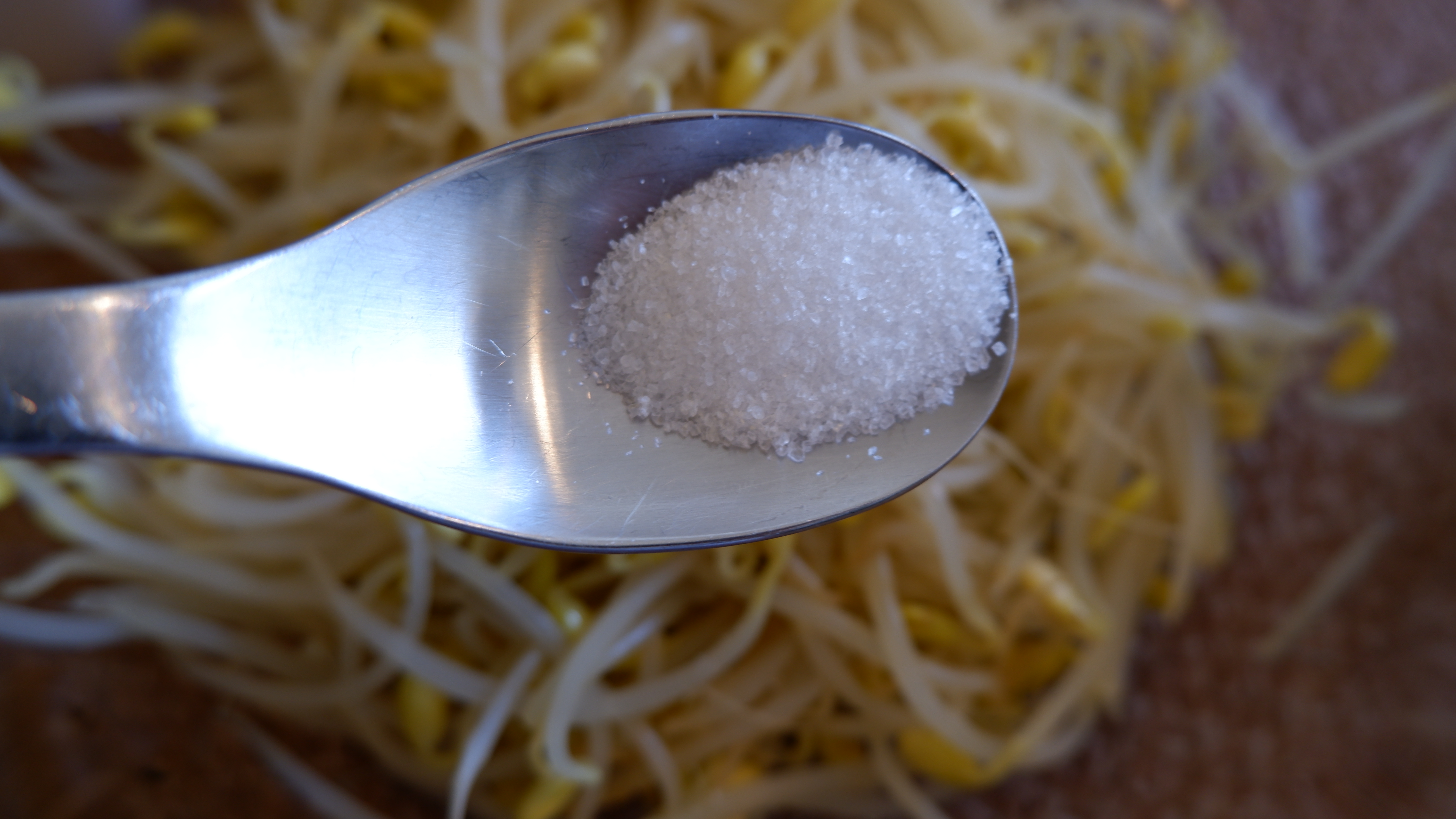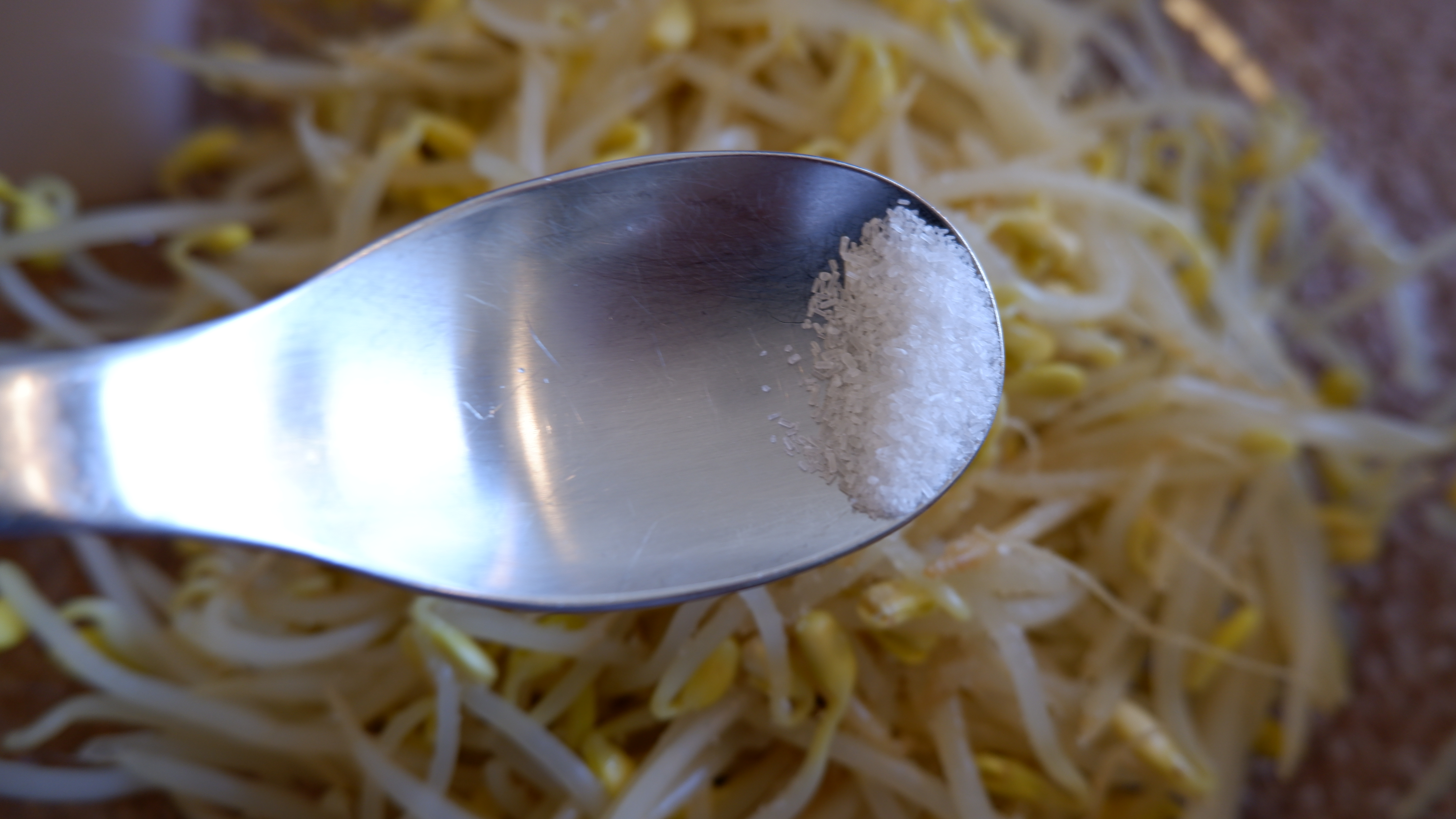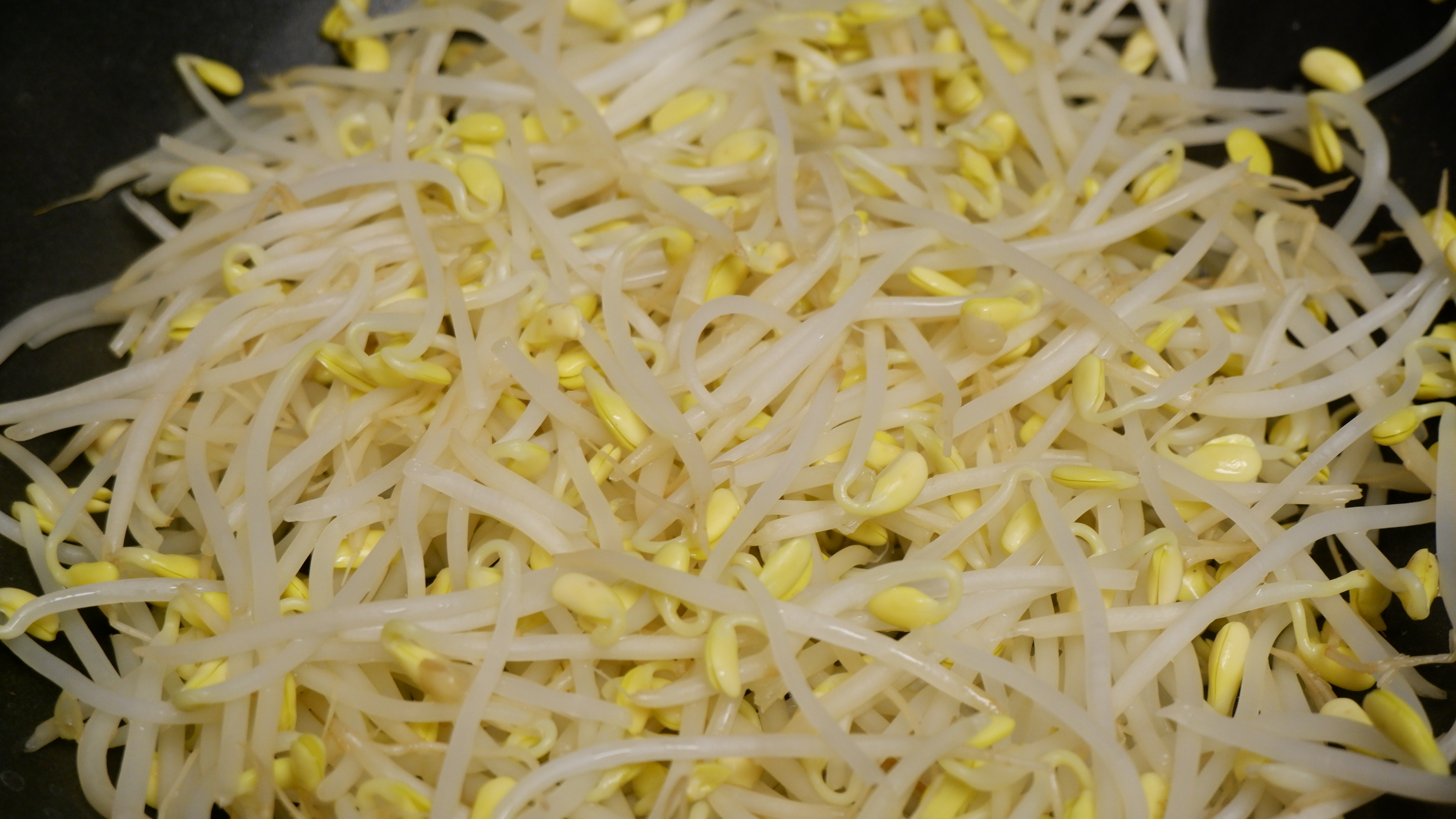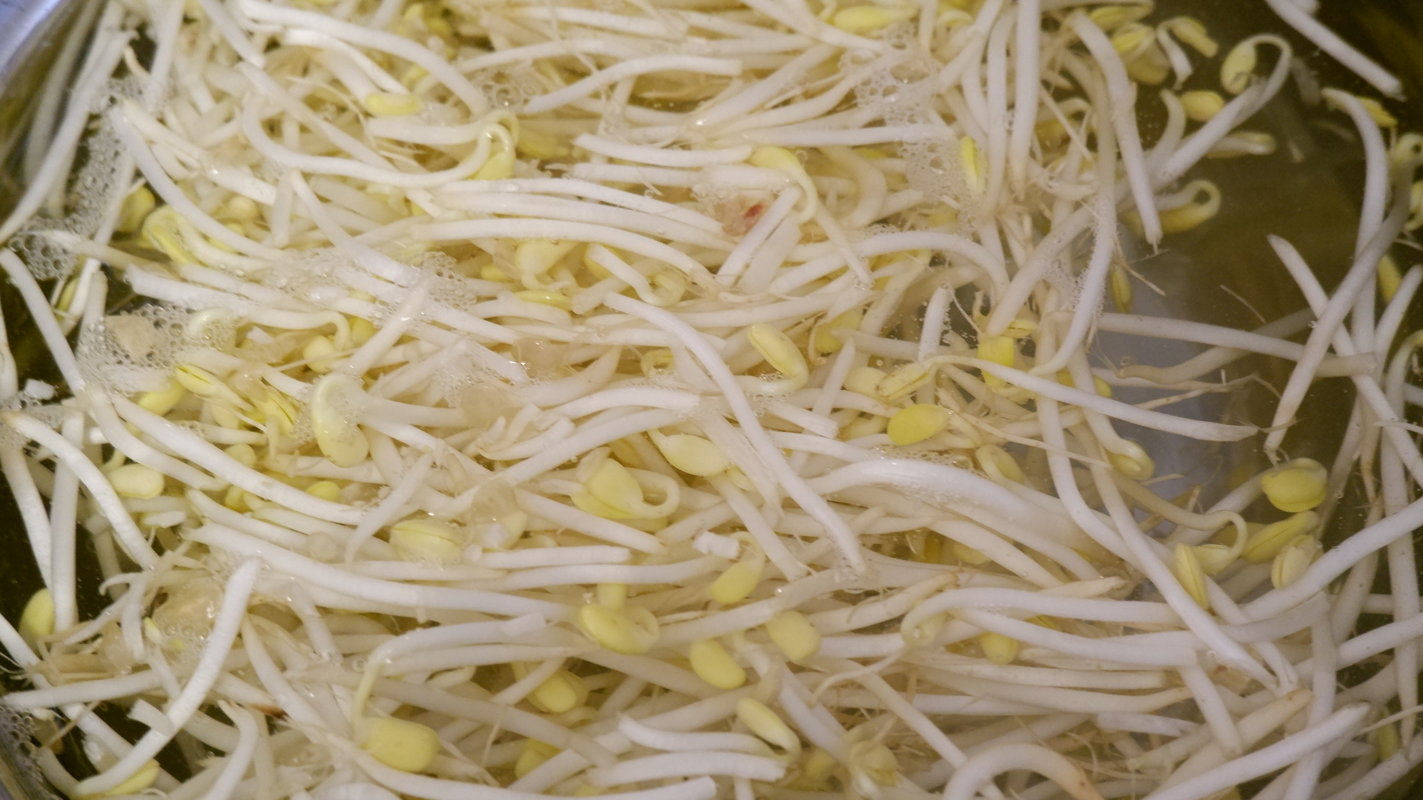 2. 넓은 냄비나 웍에 물을 반 컵 넣고(최소한의 물) 콩나물을 넓게 펴준 후 약간의 굵은소금을 넣은 뒤 불은 중불에 두고 뚜껑을 닫아줍니다.