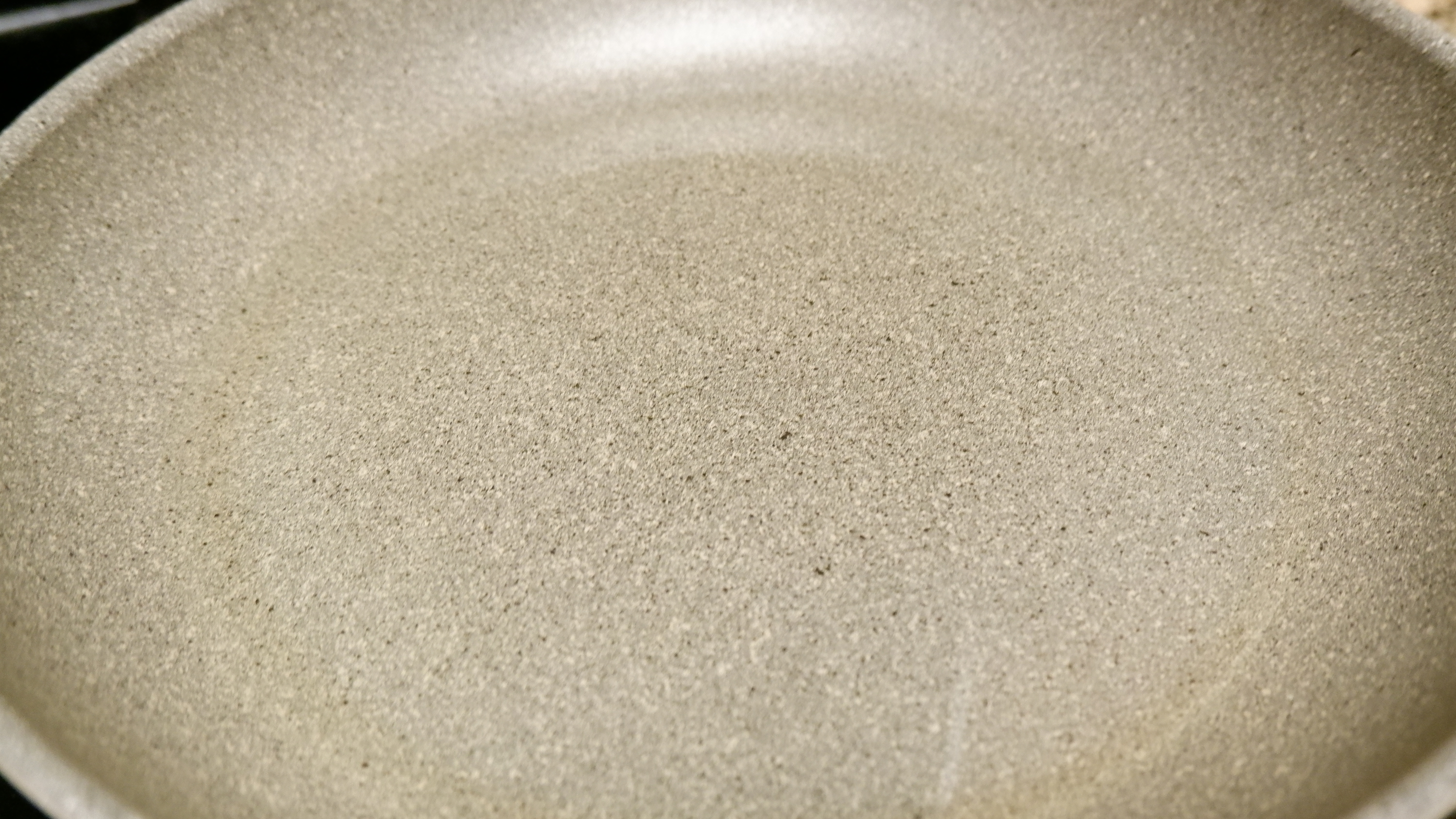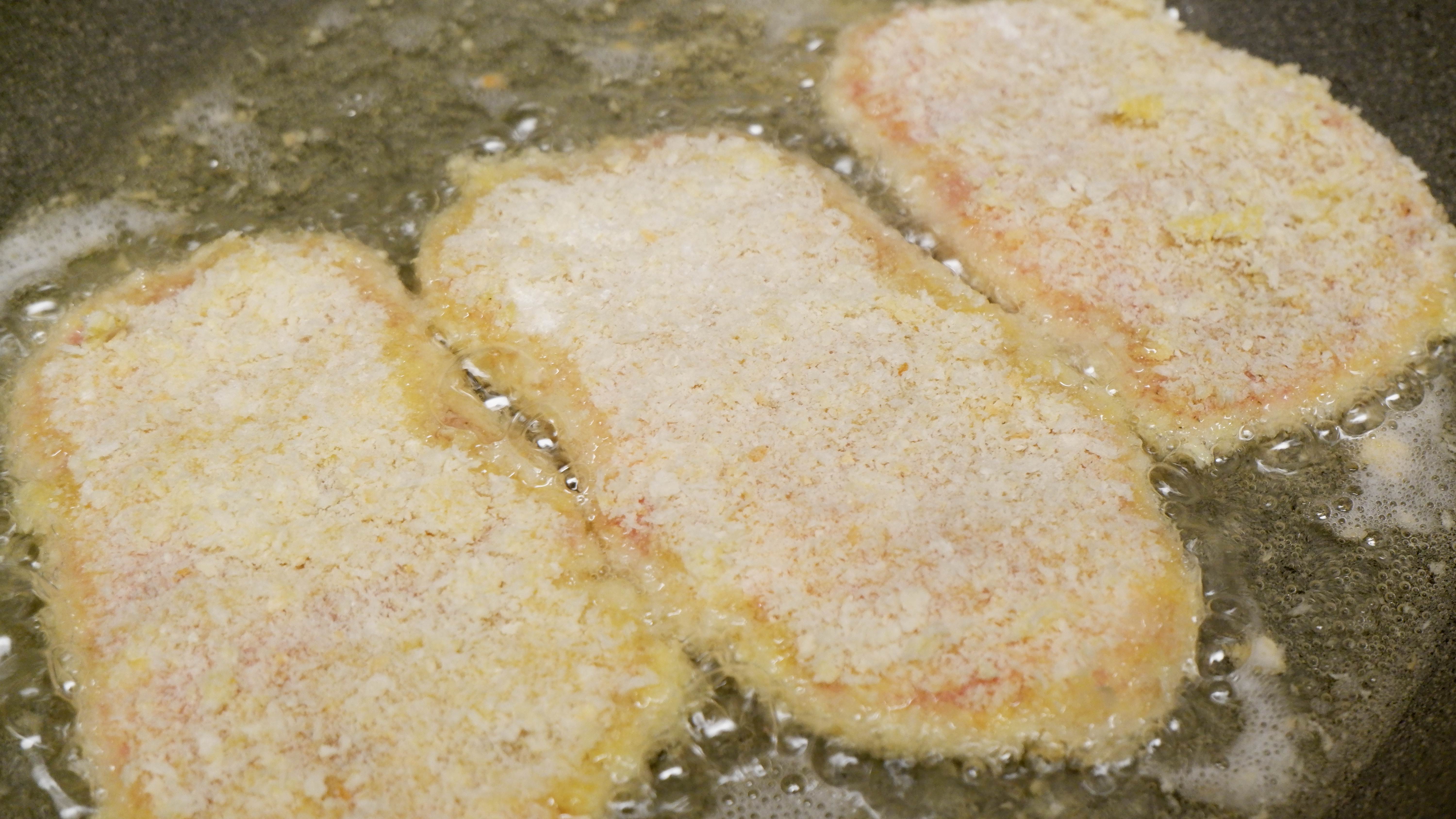7. 프라이팬에 돈가스가 반 정도 잠길 정도로 식용유를 부어주고 중불보다 센 불에 둔 후 기름을 달궈줍니다. 기름이 잘 달궈졌는지 확인하는 방법은 튀김옷을 조금 떼어내어 넣어보면 지글지글 소리와 함께 기포가 생기면 튀기기 좋은 온도~!