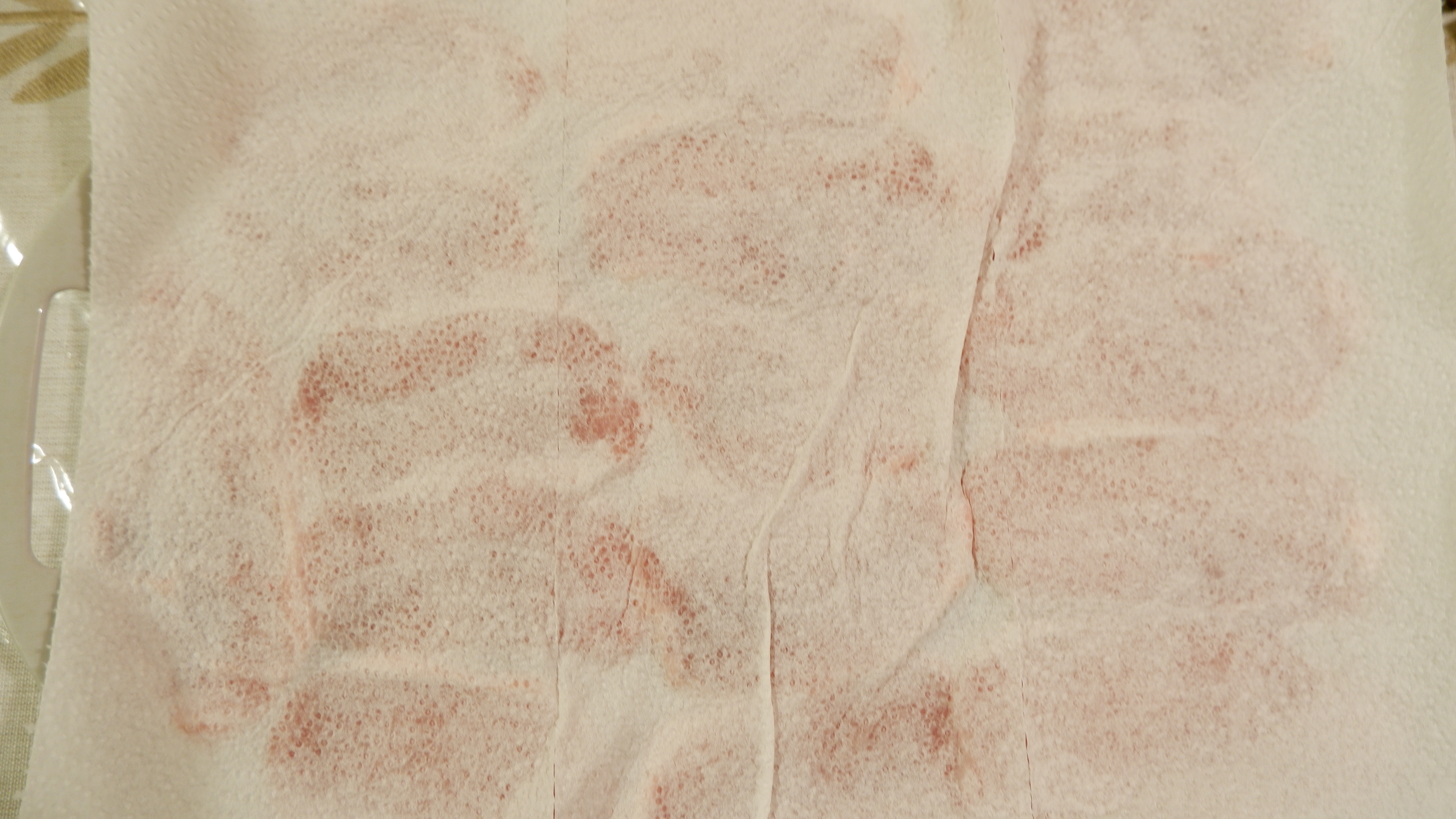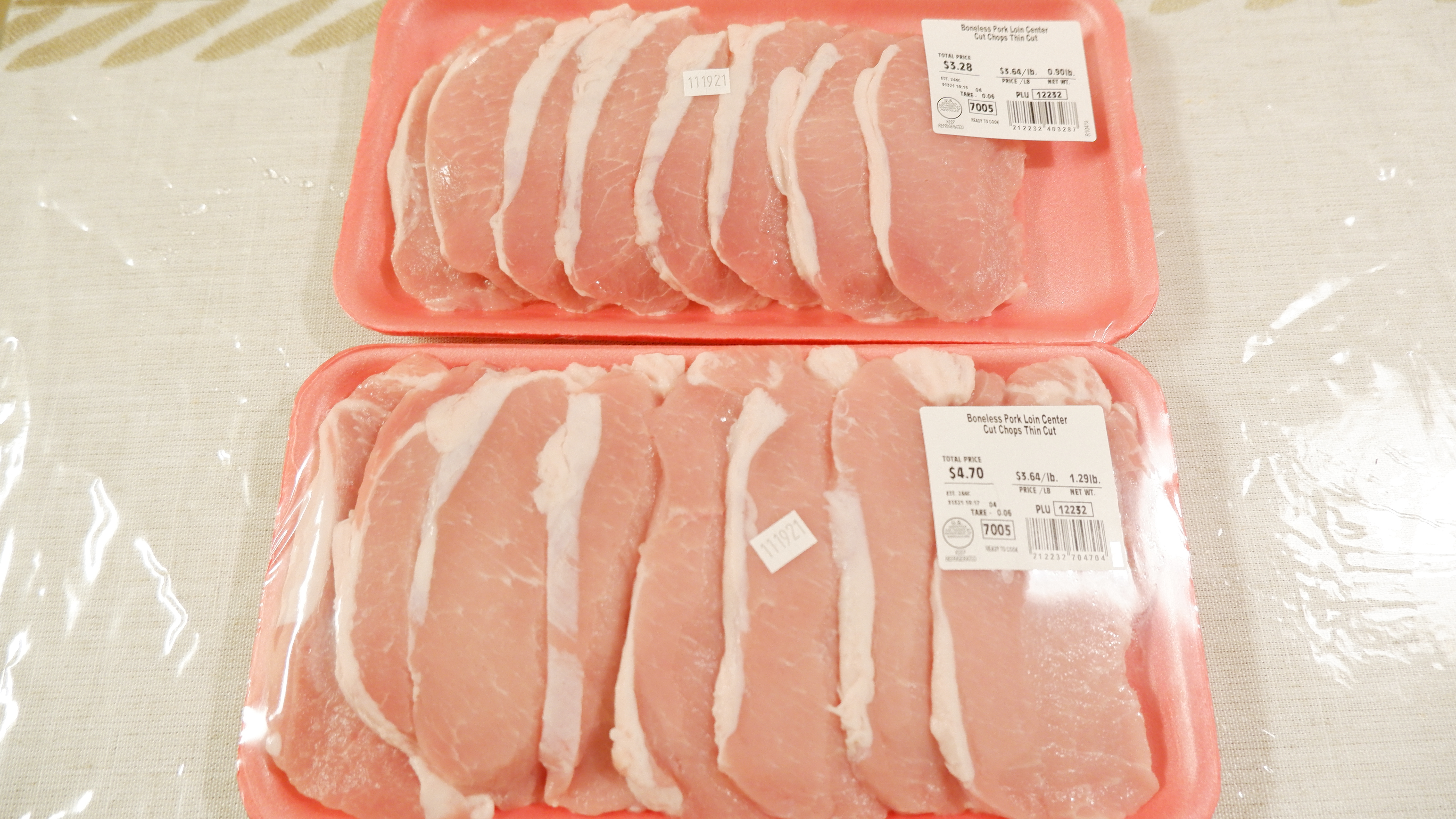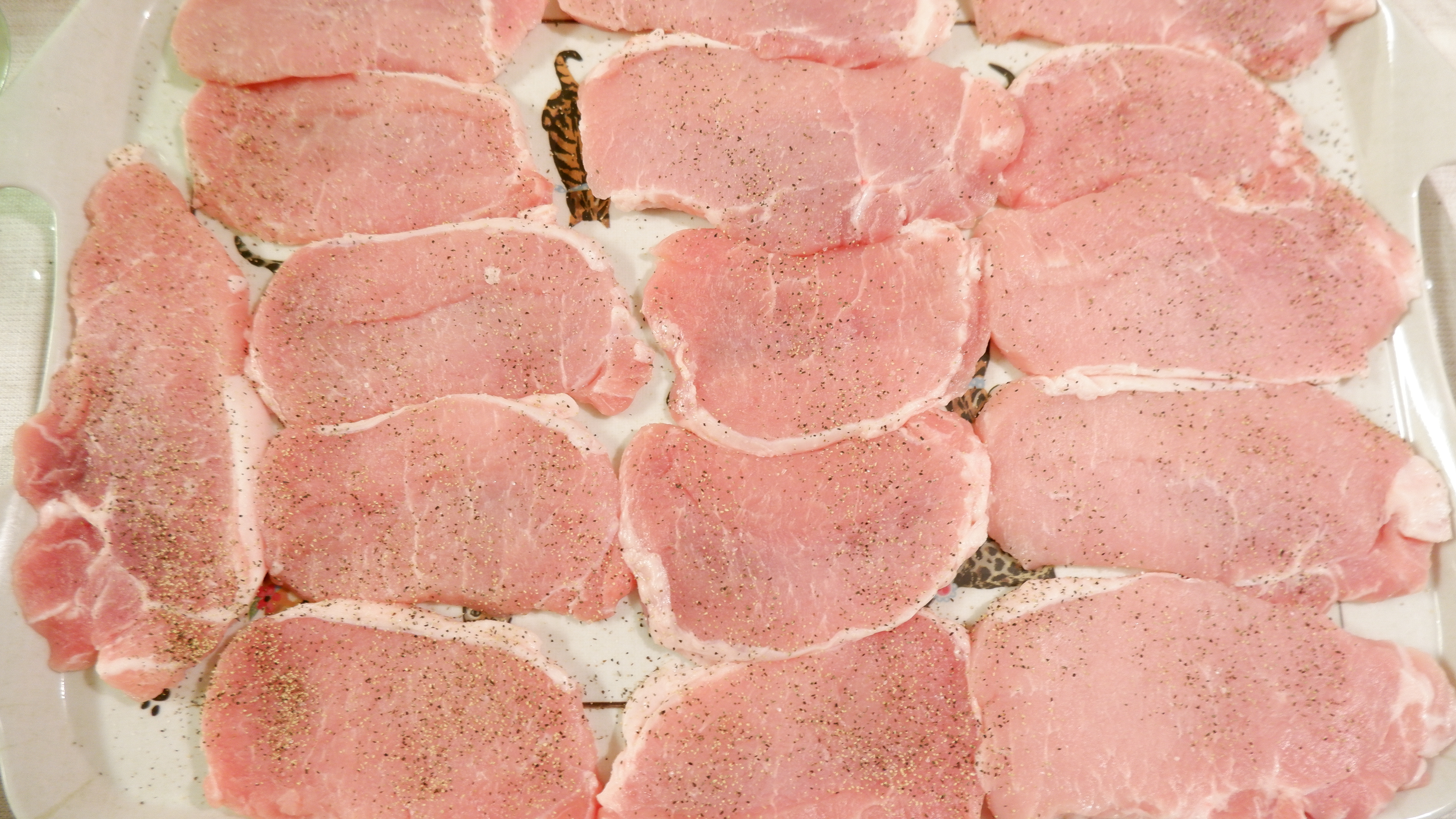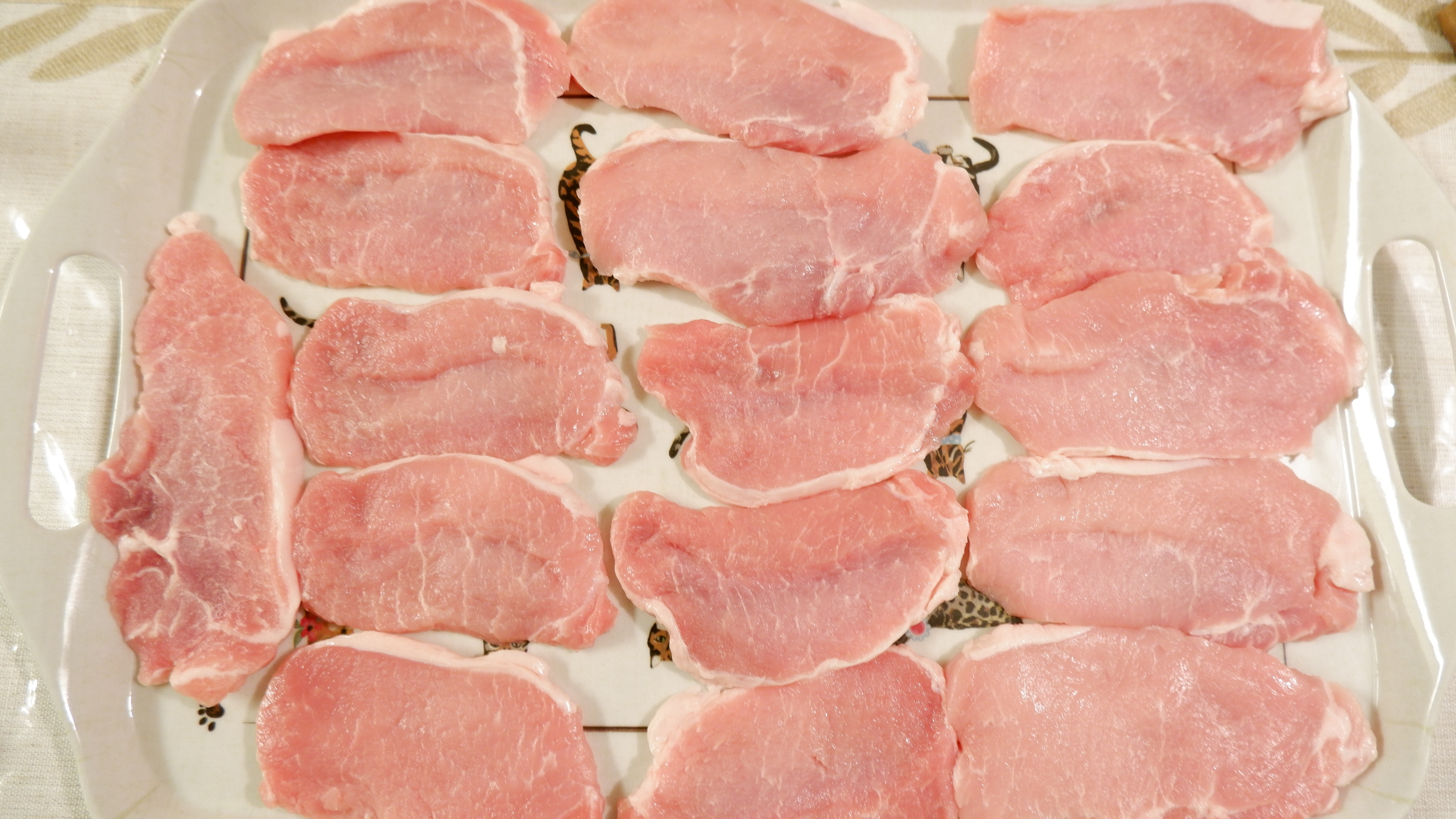 2. 돼지 등심을 쟁반에 넓게 펴준 후 그위에 키친 타월을 깔아 꾹꾹 눌러 핏물을 제거해줍니다.