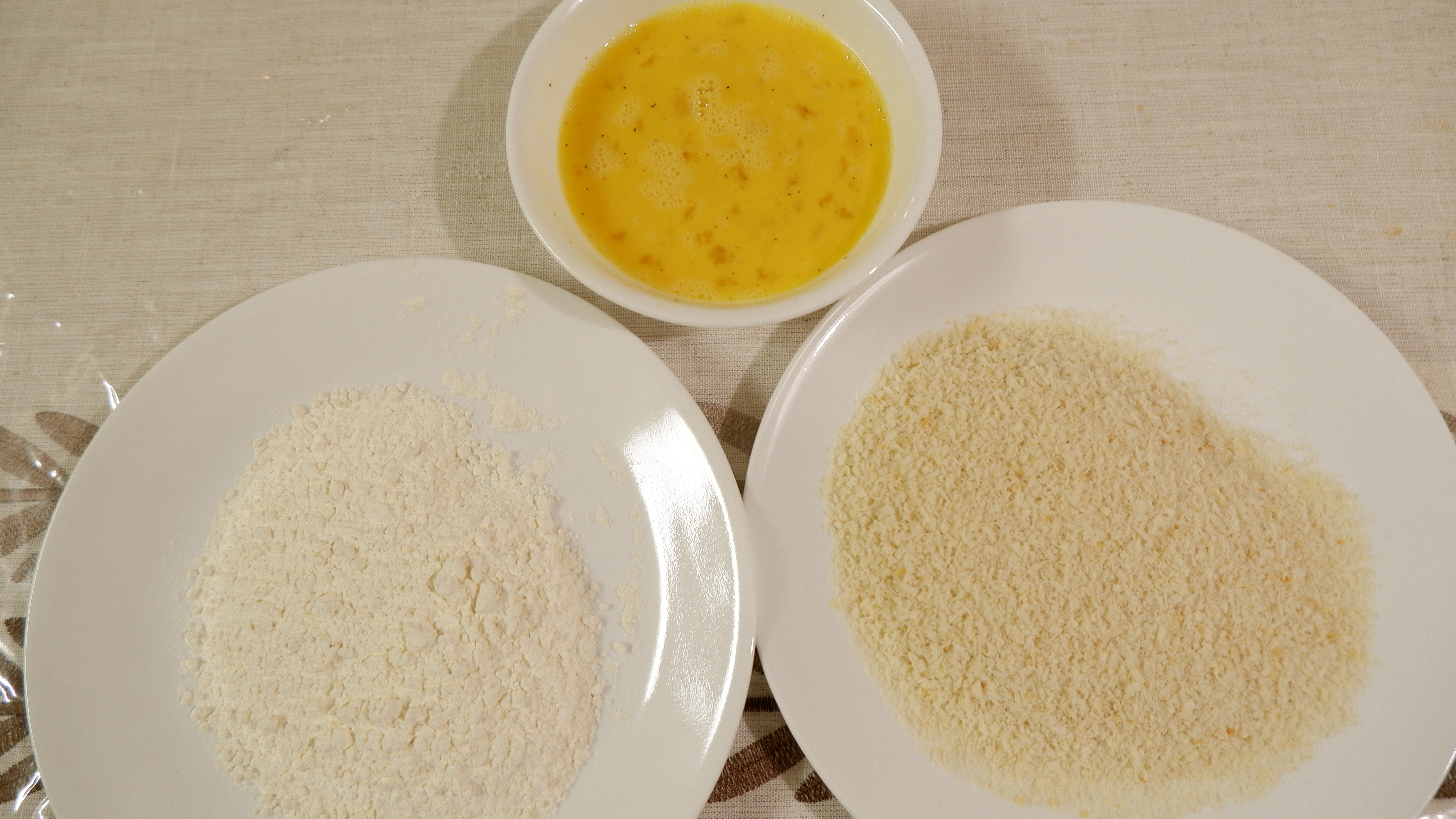 4. 계란은 4~5개를 풀어 소금과 후추로 간을 하고 밀가루와 빵가루는 넓게 펴 준비해줍니다.