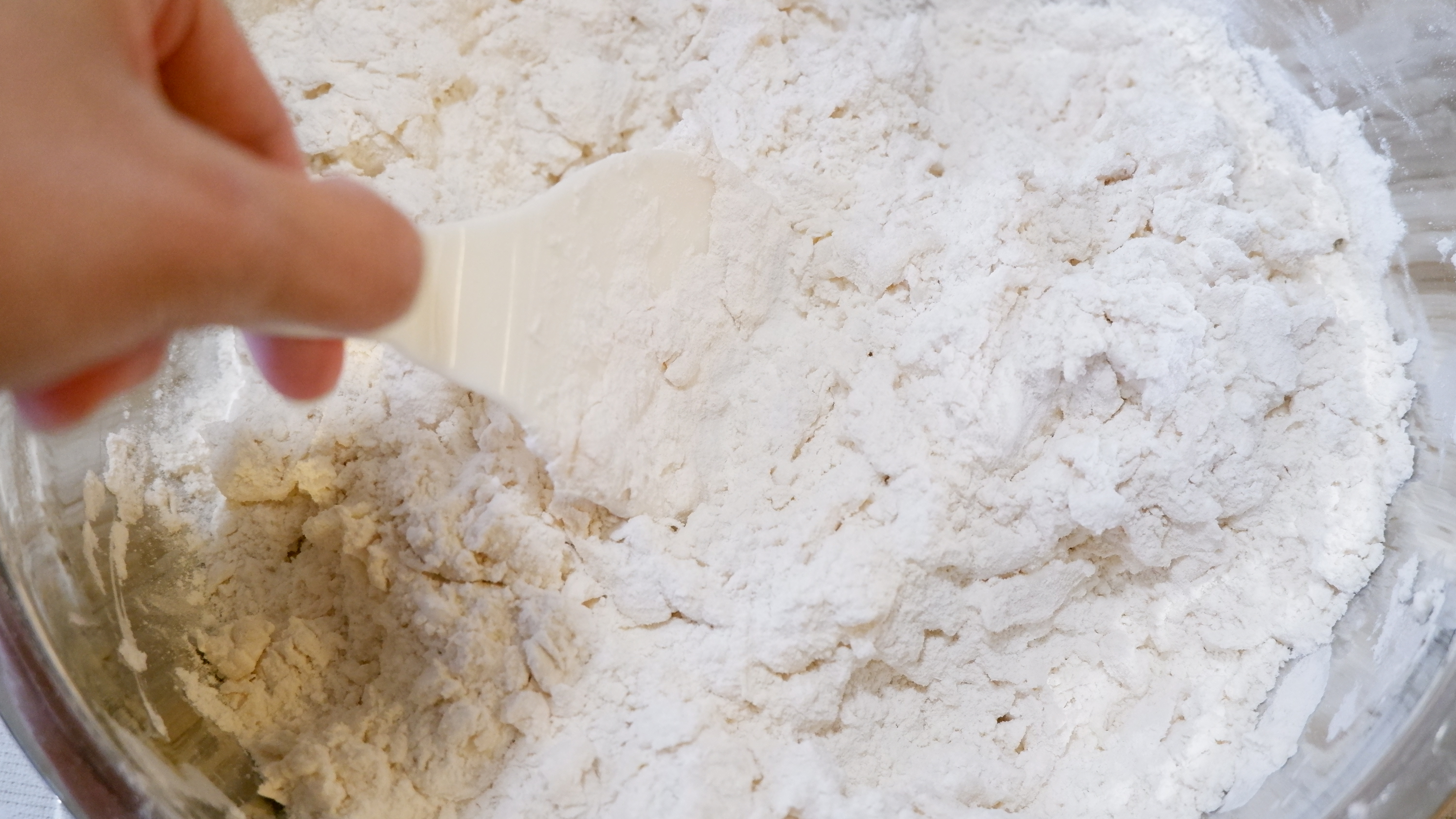 물이 뜨겁기 때문에 물을 조금씩 부어주며 주걱으로 밀가루를 뭉쳐줍니다.