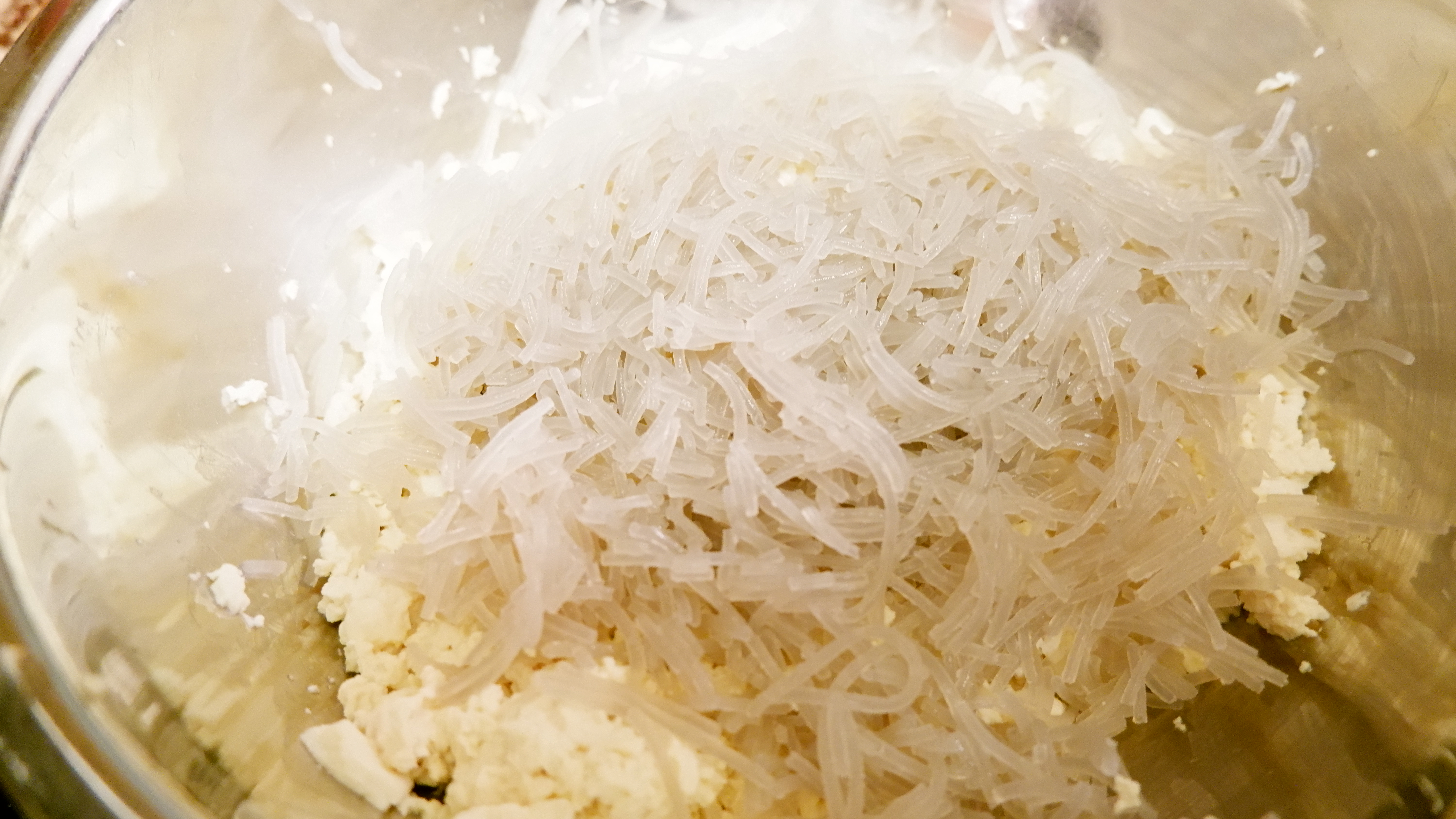2. 당면 100g을 끓는 물에 삶고 찬물에 헹구고 물기를 뺀 후 잘게 썰어주세요