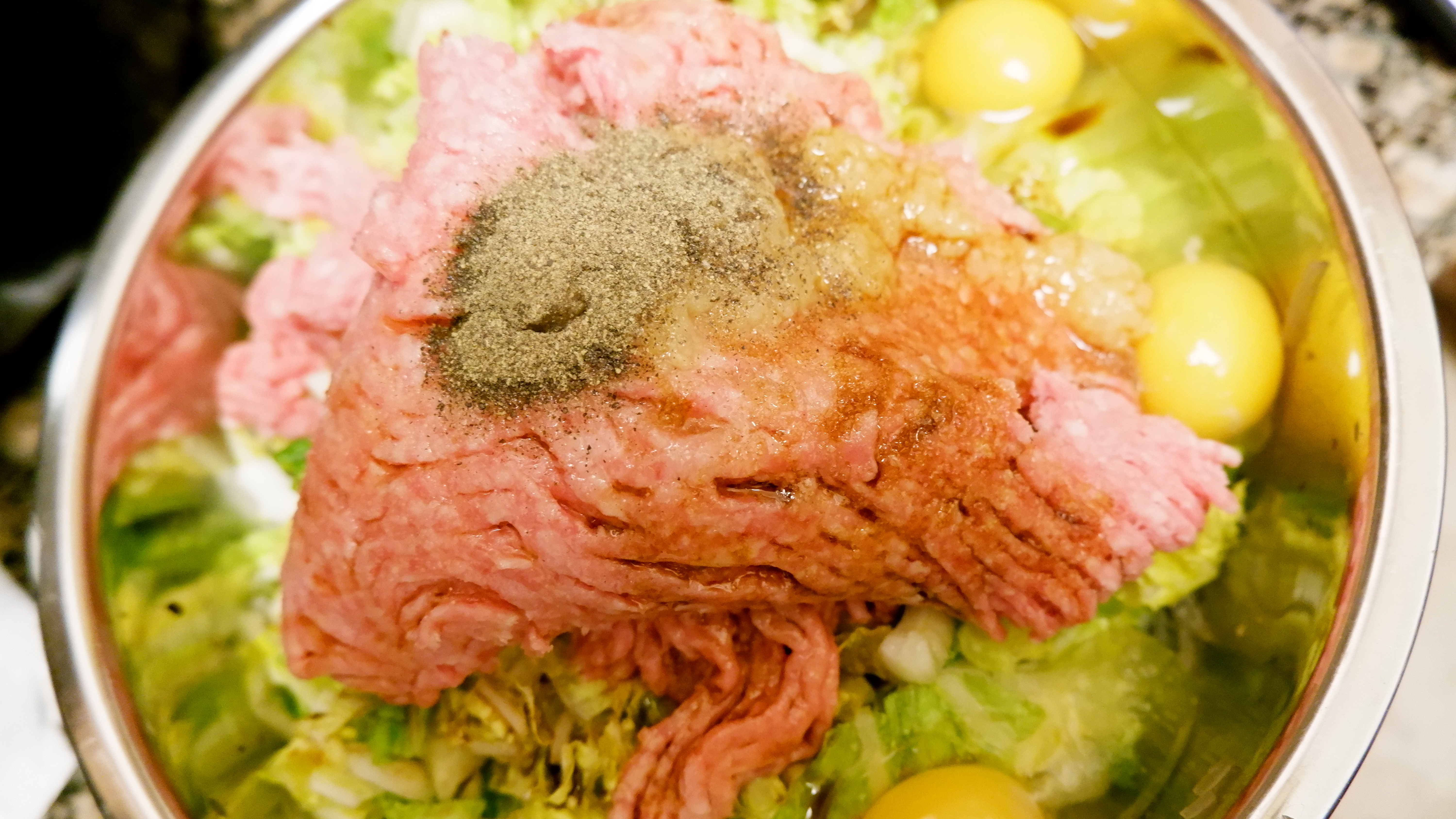6. 믹싱볼에 키친타월로 핏물을 뺀 다짐육을 과 준비된 모든 재료를 넣고 계란 3개 , 다진 마늘 2큰술 , 참기름 2큰술 , 후추 반 큰 술 , 설탕 반 큰 술 , 소금 반큰술 , 간장 3큰술을 넣고 잘 버무려 주면 만두속 완성!