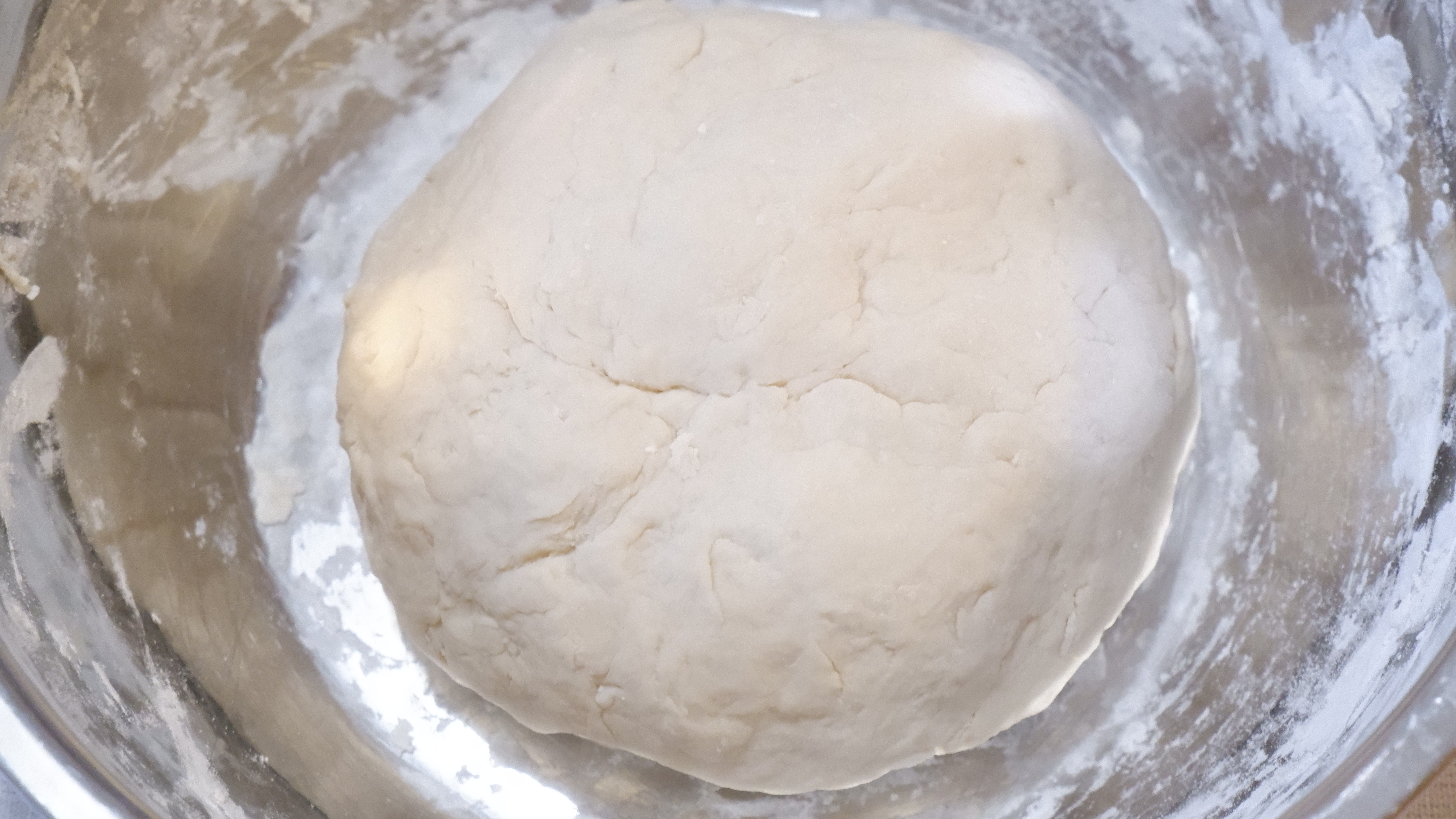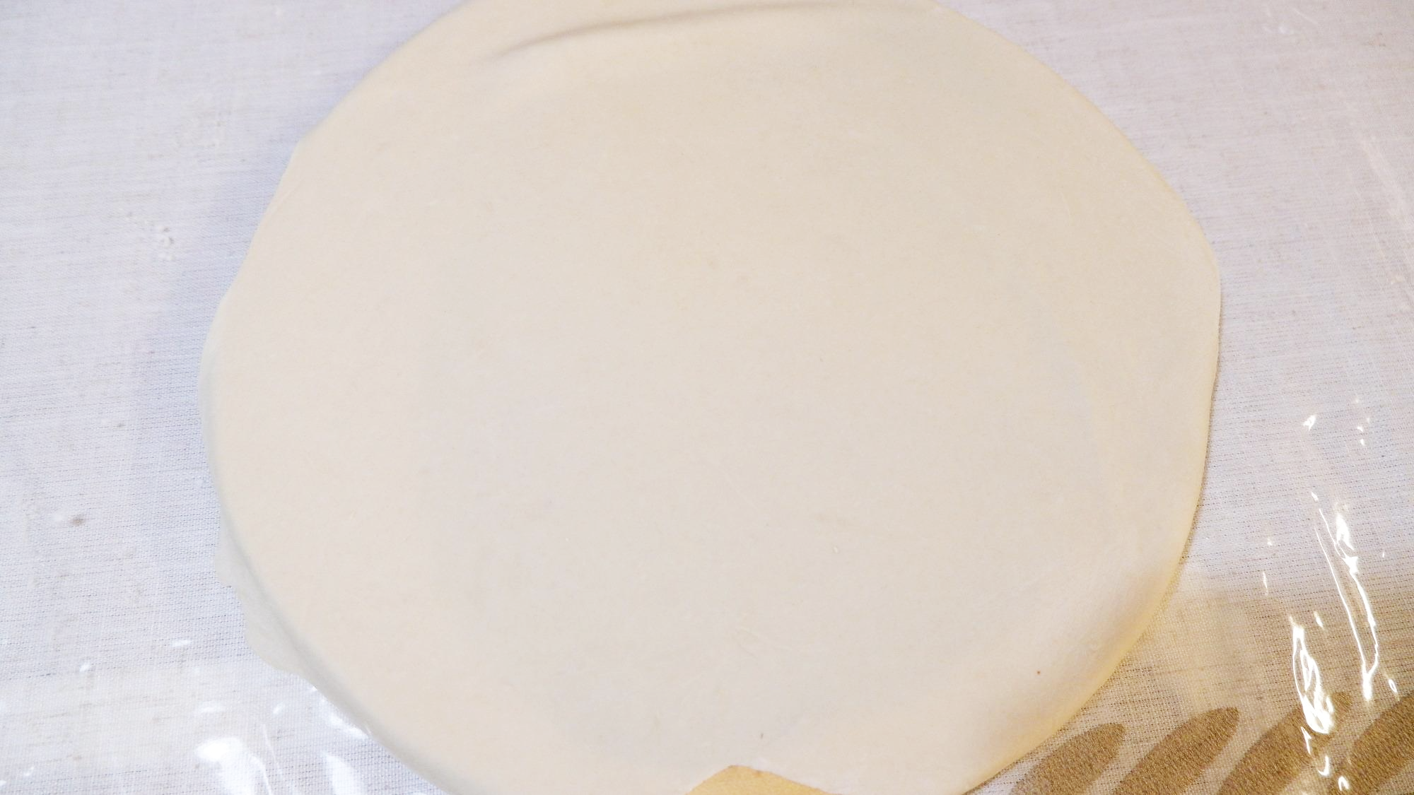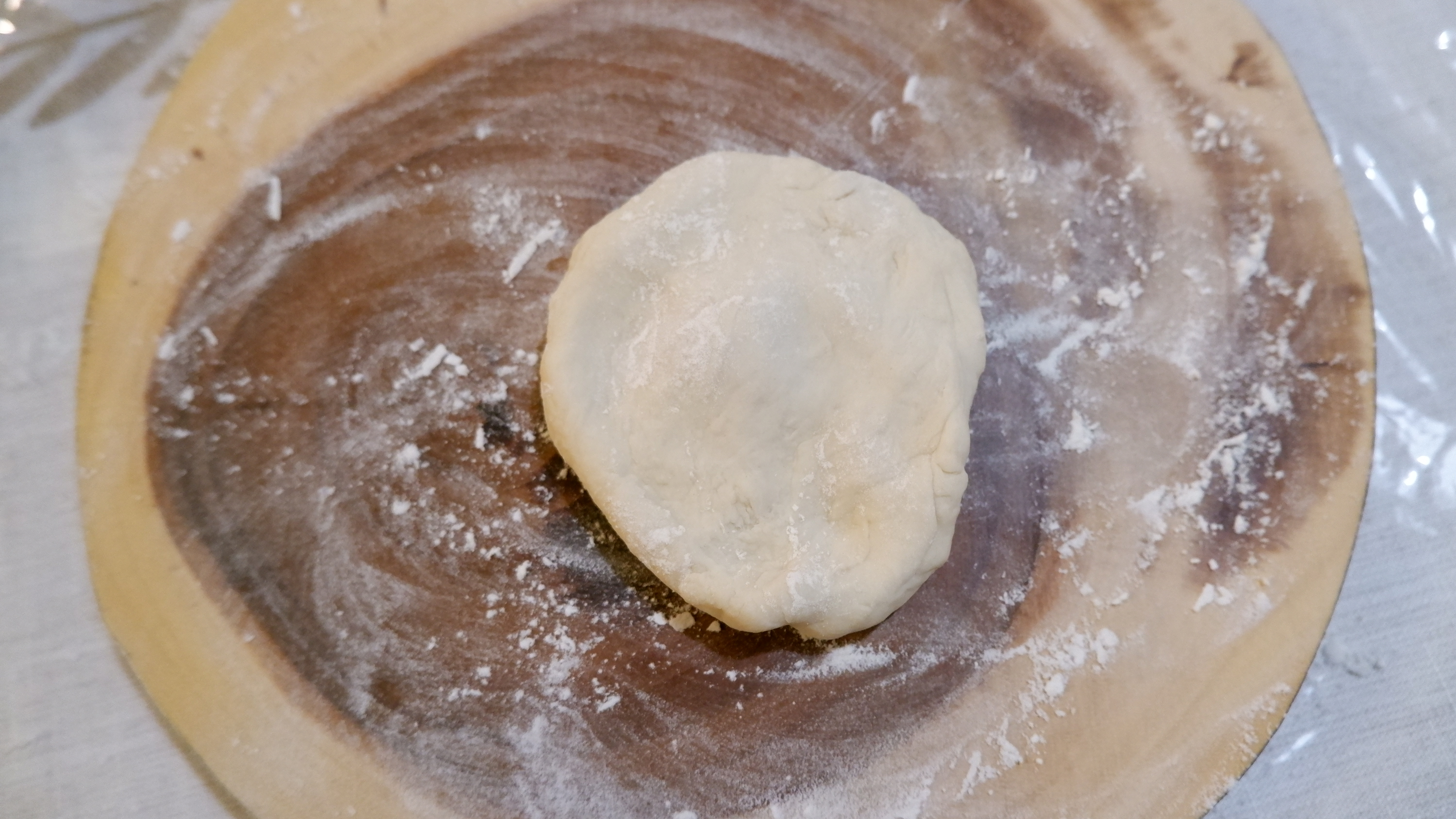 4. 냉장고에서 반죽을 꺼내면 훨씬 부드러워져 있을 거예요~ 반죽을 넓게 필만큼 떼어내어 조금 치대다가 둥근 모양을 잡고 도마 또는 깨끗한 상 위에 밀가루를 넓게 펴고 반죽에도 앞뒤로 밀가루를 고루 발라준 후 밀대로 열심히 넓게 펴줍니다.