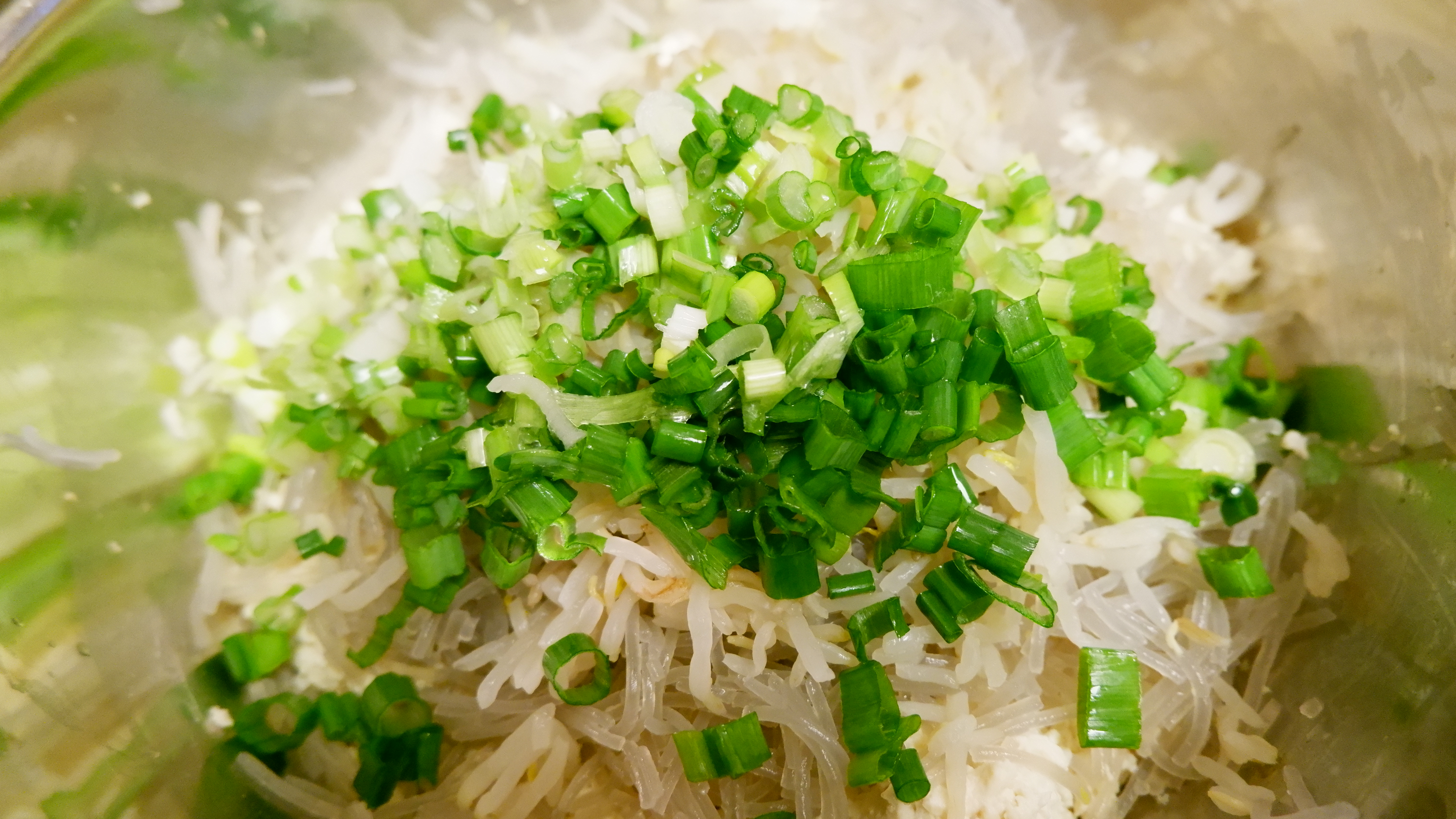 3. 숙주 300g은 물에 씻은 후 끓은 물에 3분간 데치고 다시 찬물에 헹궈 물기를 짜낸 후 잘게 썰어줍니다.